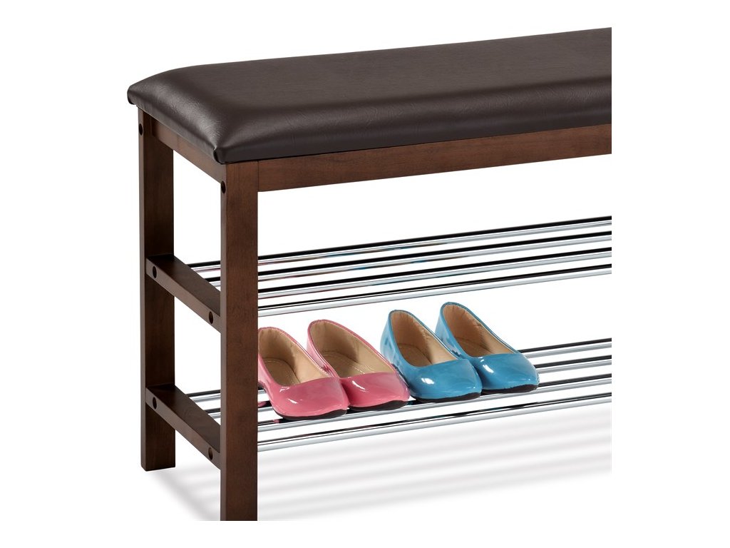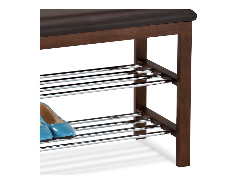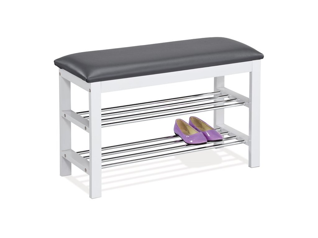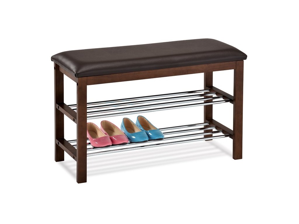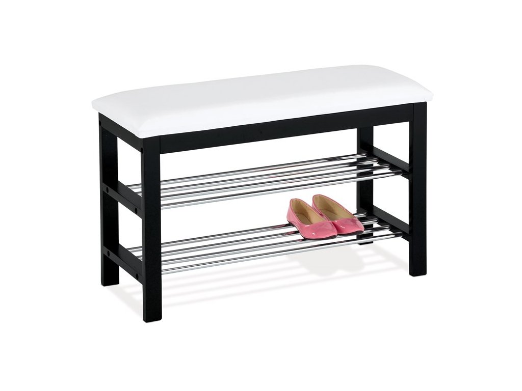Praktický botník s taburetem kombinuje černě lakované masivní dřevo kaučukovníku s potahem z ekokůže, který nabízí pohodlné sezení při obouvání. Dvě chromované police poskytují dostatek místa pro uložení obuvi, přičemž jejich kovové provedení zajišťuje pevnost a snadnou údržbu.