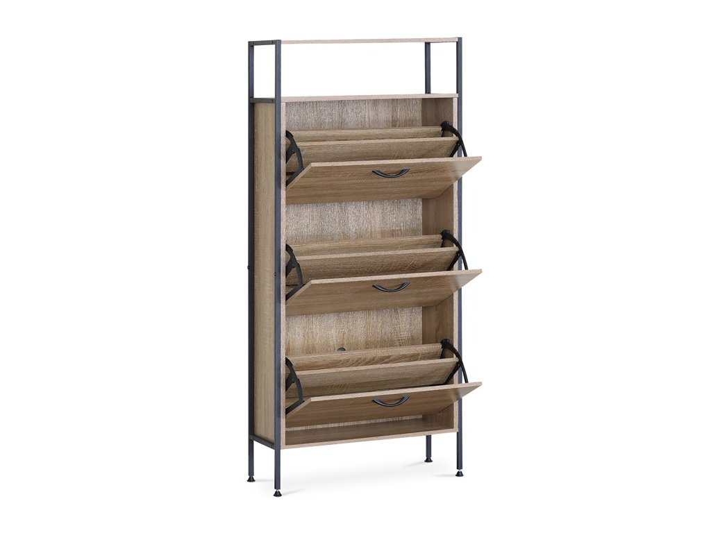 Botník ABO-G1009 je elegantní a funkční kousek nábytku, který nabízí tři výklopné přihrádky na obuv a dvě otevřené police na drobnosti či dekorace. Desky z MDF v dekoru dub vnášejí do interiéru přírodní vzhled, zatímco černá kovová podnož zajišťuje stabilitu a moderní kontrast. Černé úchytky usnadňují manipulaci a podtrhují minimalistický design. Díky kompaktním rozměrům se botník hodí i do menších předsíní a pomáhá udržovat pořádek stylovým způsobem.