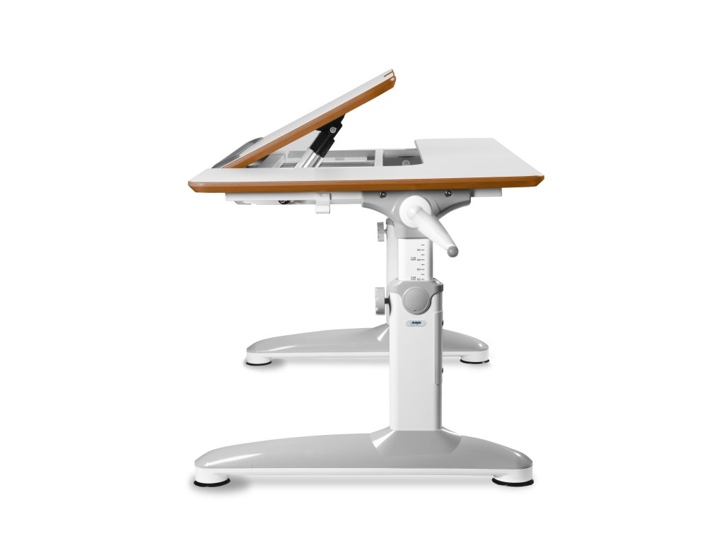 Rostoucí dětský stůl Expert 32E2 je ergonomický psací stůl vyšší třídy s deskou z kvalitní březové překližky s bílým laminem. Nabízí dvě pracovní plochy – pevnou odkládací část ve tvaru „L“ a přední desku s nastavitelným náklonem až 36° pro kreslení, psaní i malování. Díky zakulaceným rohům, magnetické opoře zápěstí a výsuvnému organizéru je nejen praktický, ale i bezpečný.