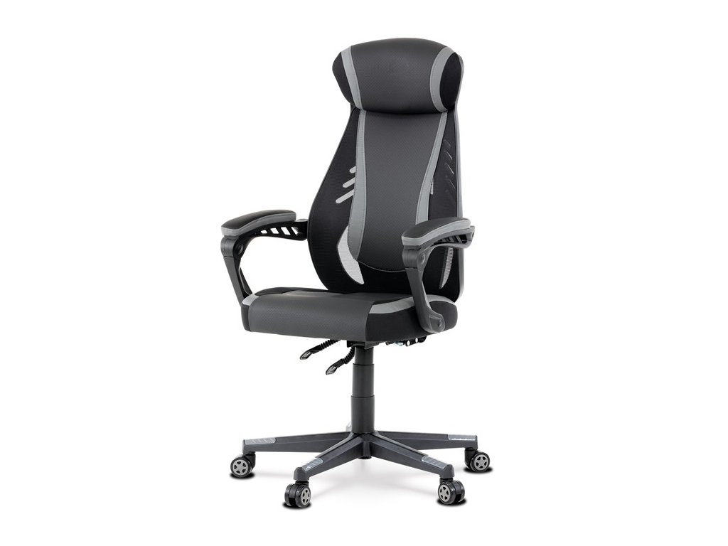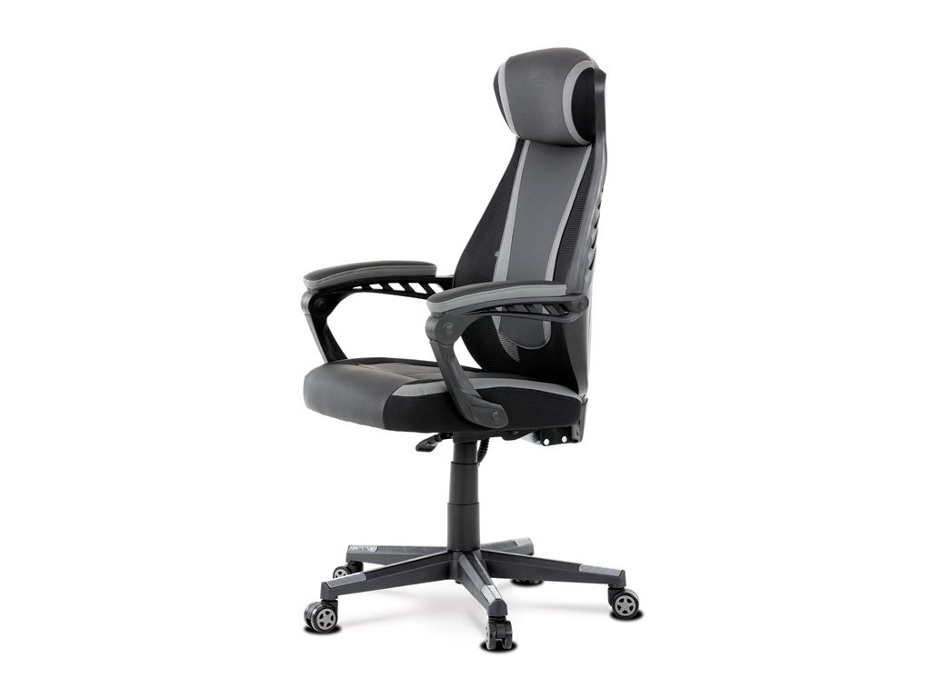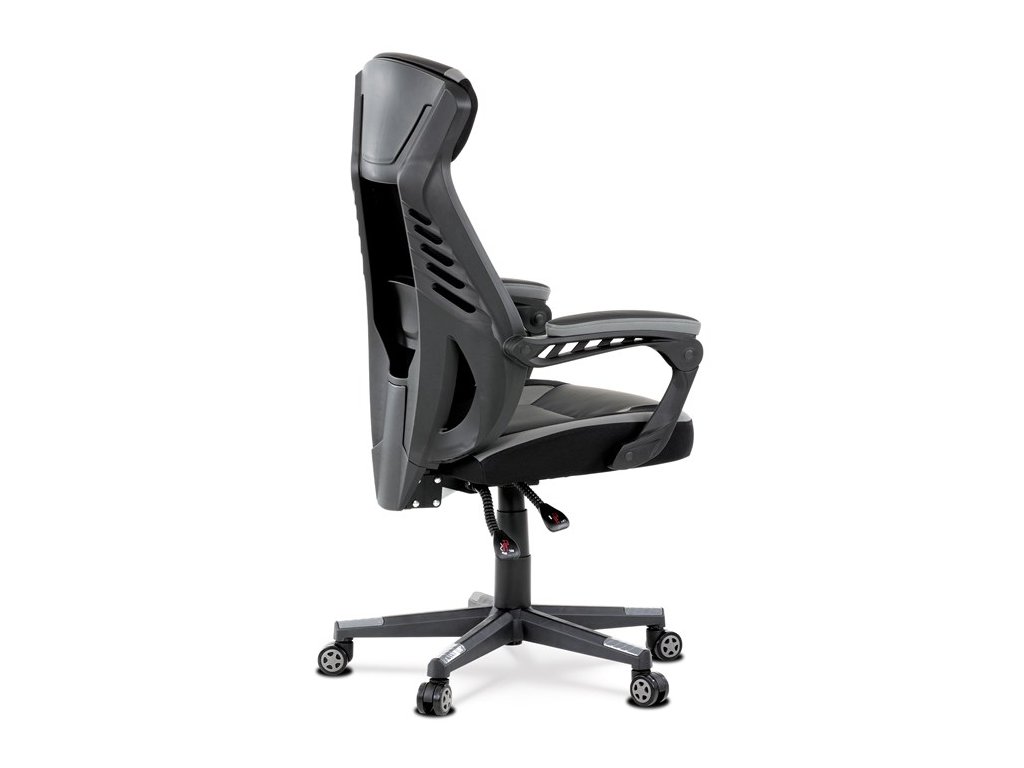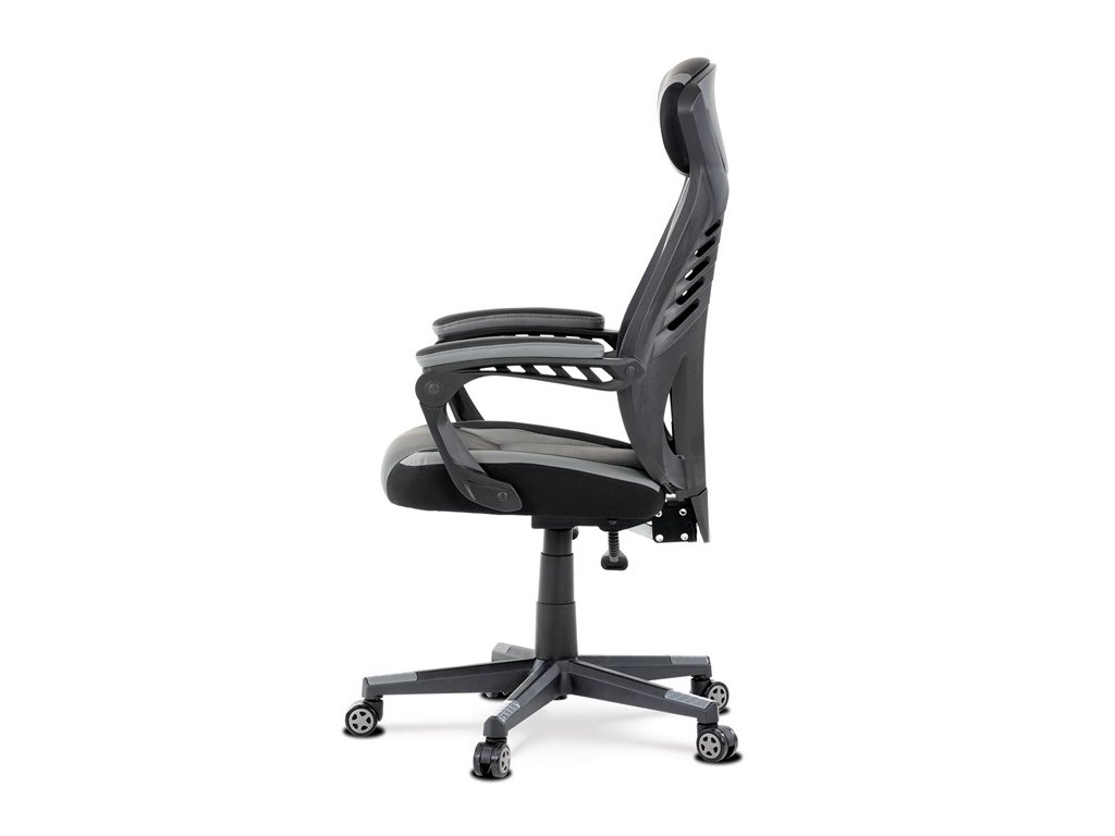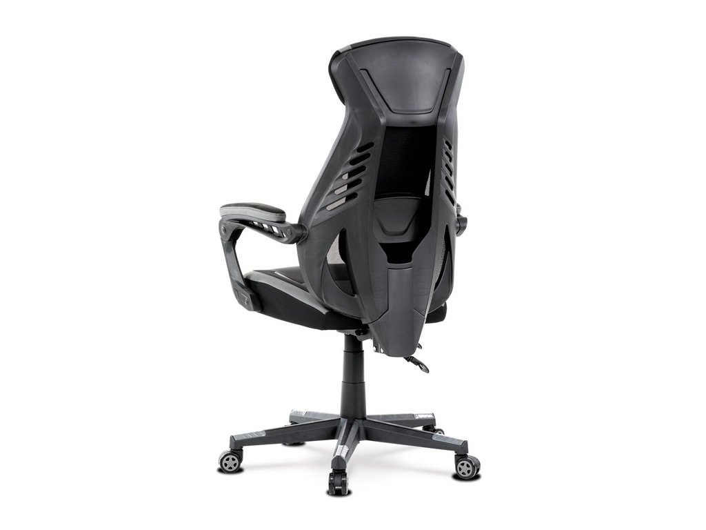 Ergonomicky tvarovaný opěrák s integrovanou opěrkou hlavy a výškově nastavitelnou bederní opěrkou podporuje správné držení zad i při dlouhém sezení. Křeslo je vybaveno houpacím mechanismem s aretací, plynovým pístem pro nastavení výšky a sklápěcím systémem opěráku. Robustní plastový kříž s průměrem 70 cm a kolečka s gumovým obvodem zajišťují stabilitu i plynulý pohyb po tvrdých podlahách.
