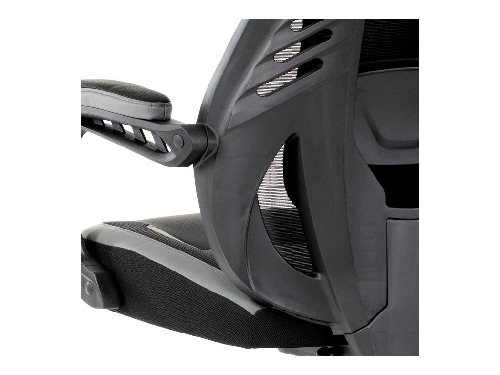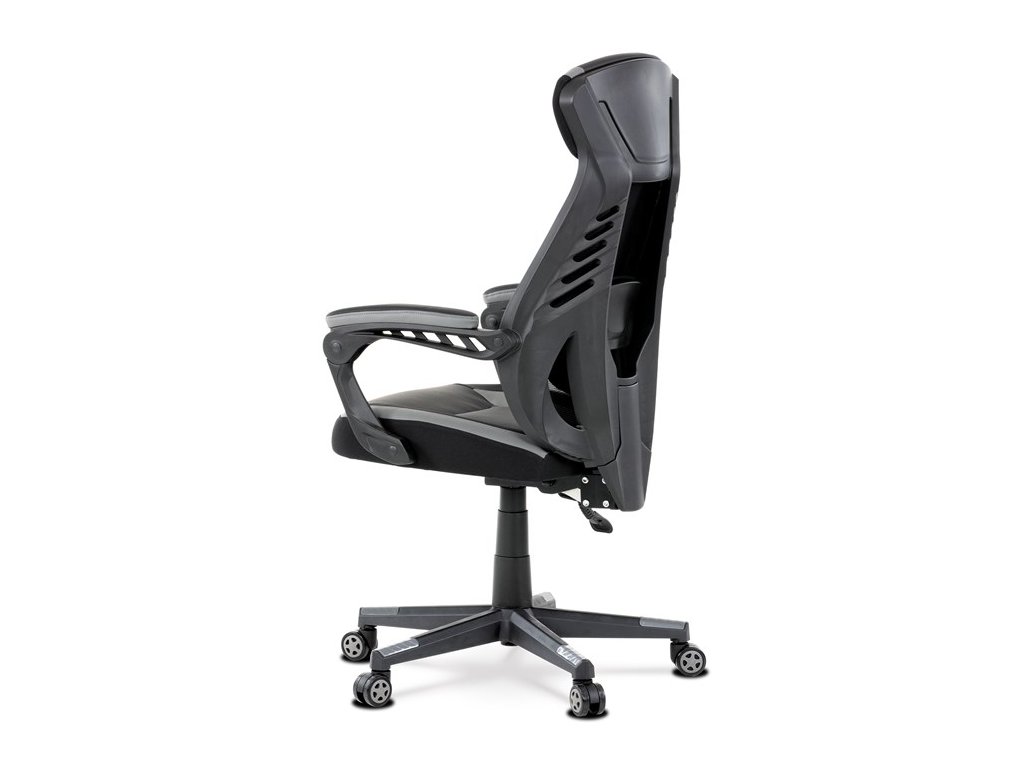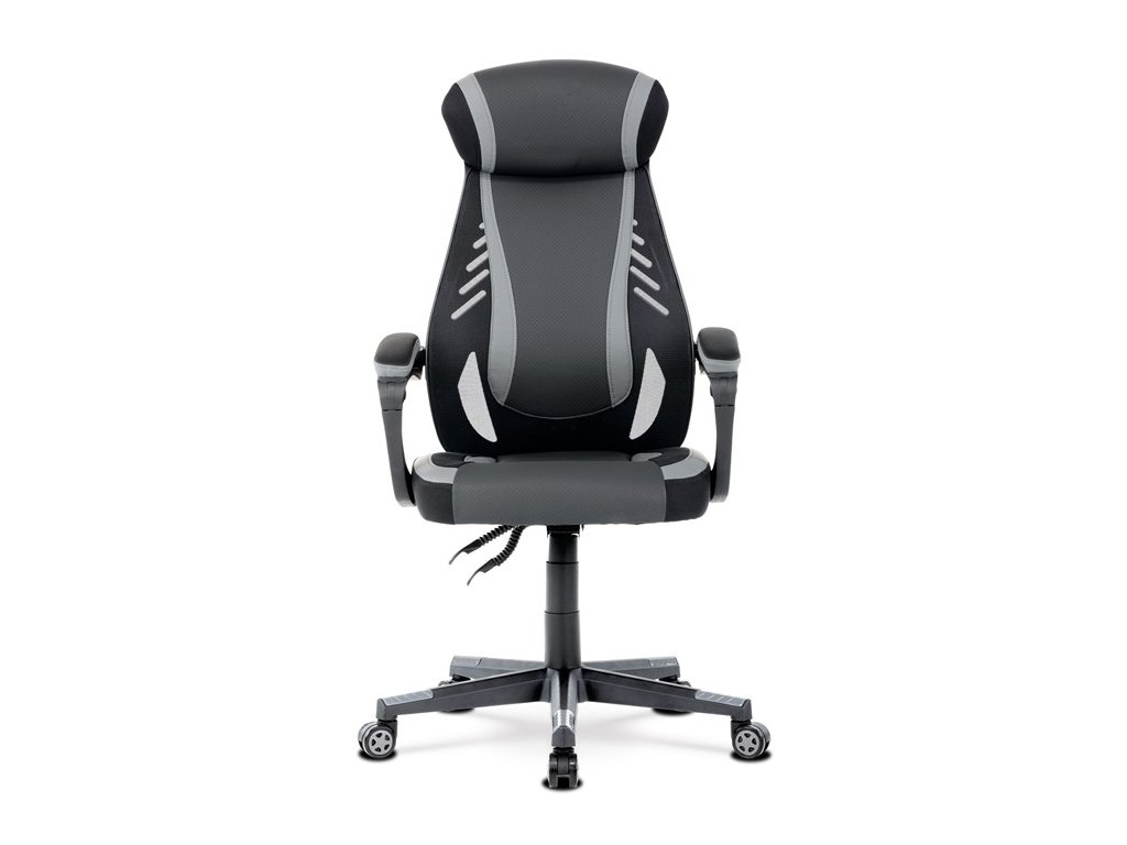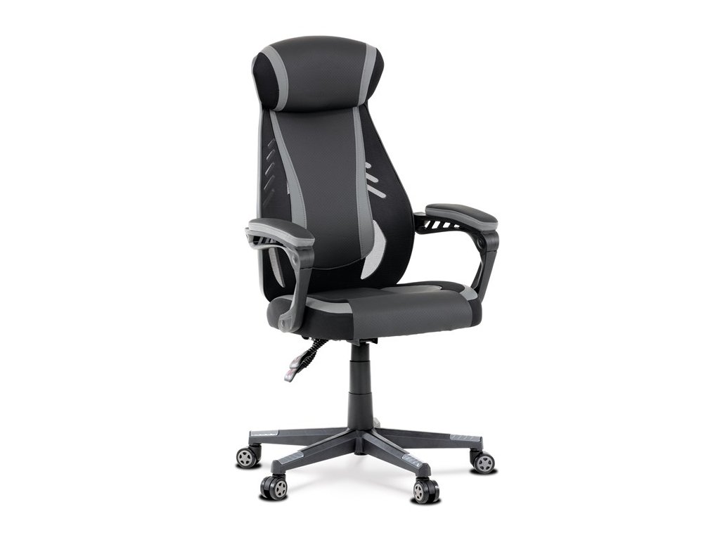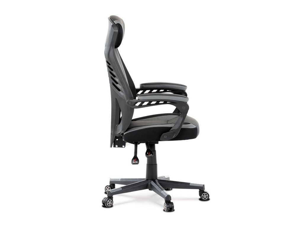Ergonomicky tvarovaný opěrák s integrovanou opěrkou hlavy a výškově nastavitelnou bederní opěrkou podporuje správné držení zad i při dlouhém sezení. Křeslo je vybaveno houpacím mechanismem s aretací, plynovým pístem pro nastavení výšky a sklápěcím systémem opěráku. Robustní plastový kříž s průměrem 70 cm a kolečka s gumovým obvodem zajišťují stabilitu i plynulý pohyb po tvrdých podlahách.