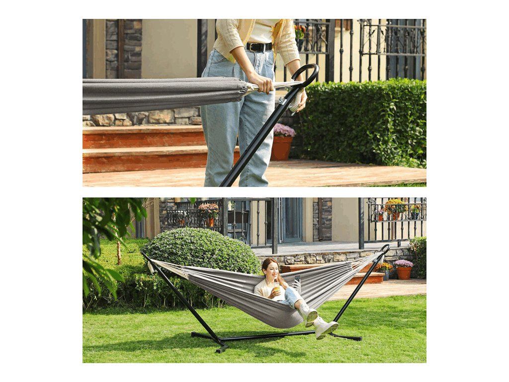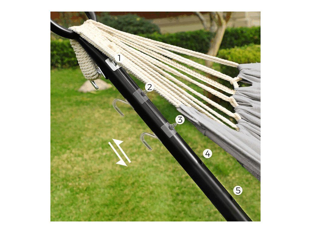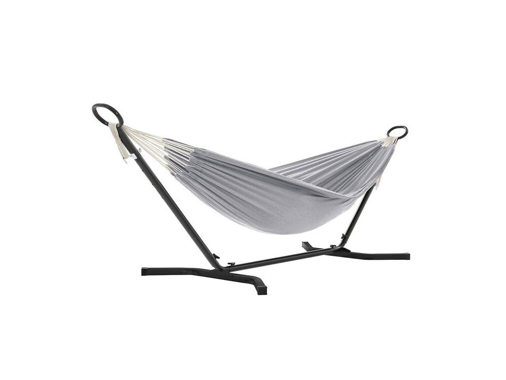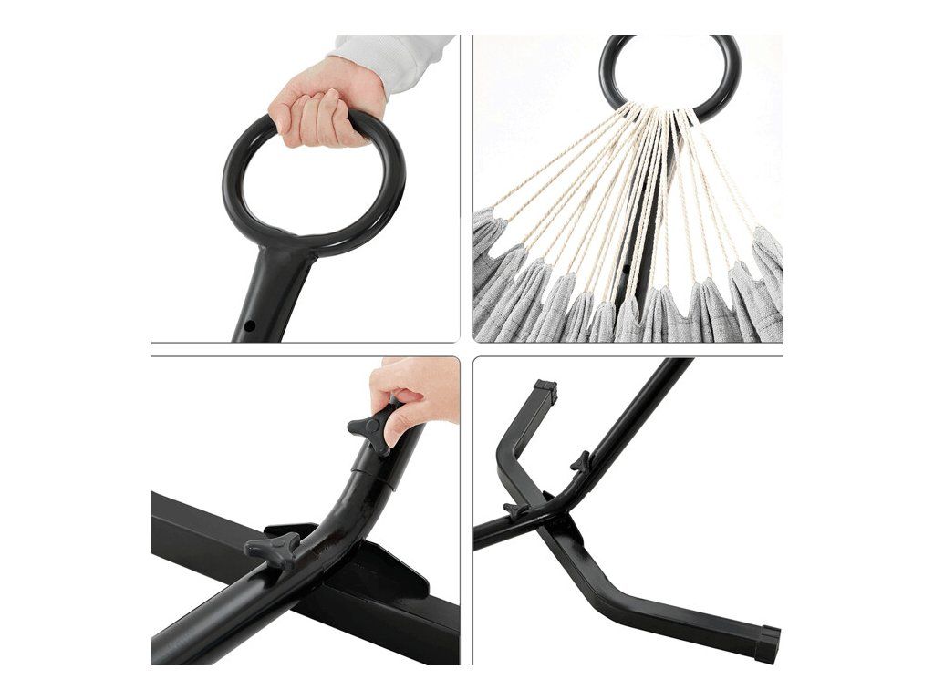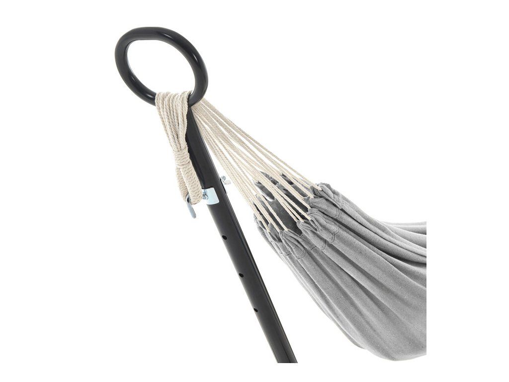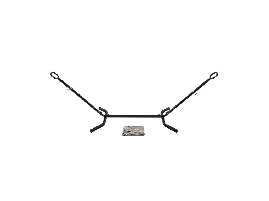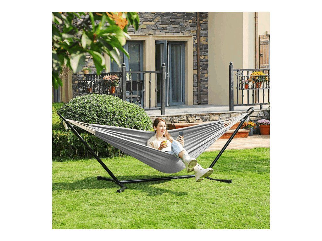 Zahradní houpací síť se stojanem AZL-E1201 GREY v elegantní kombinaci černé konstrukce a šedé ložné plochy je ideální volbou pro relaxaci na zahradě, terase i při kempování.