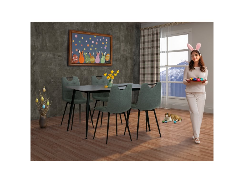 Set doplňují čtyři pohodlné jídelní židle s měkkým polstrováním a příjemným čalouněním. Elegantní madlo na zadní straně opěráku usnadňuje manipulaci a zároveň dodává židlím moderní charakter. Ideální volba pro interiéry, kde se propojuje praktičnost, komfort a nadčasový design.