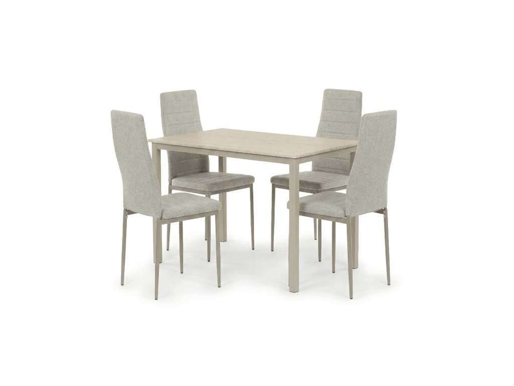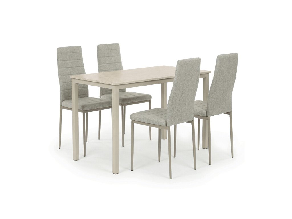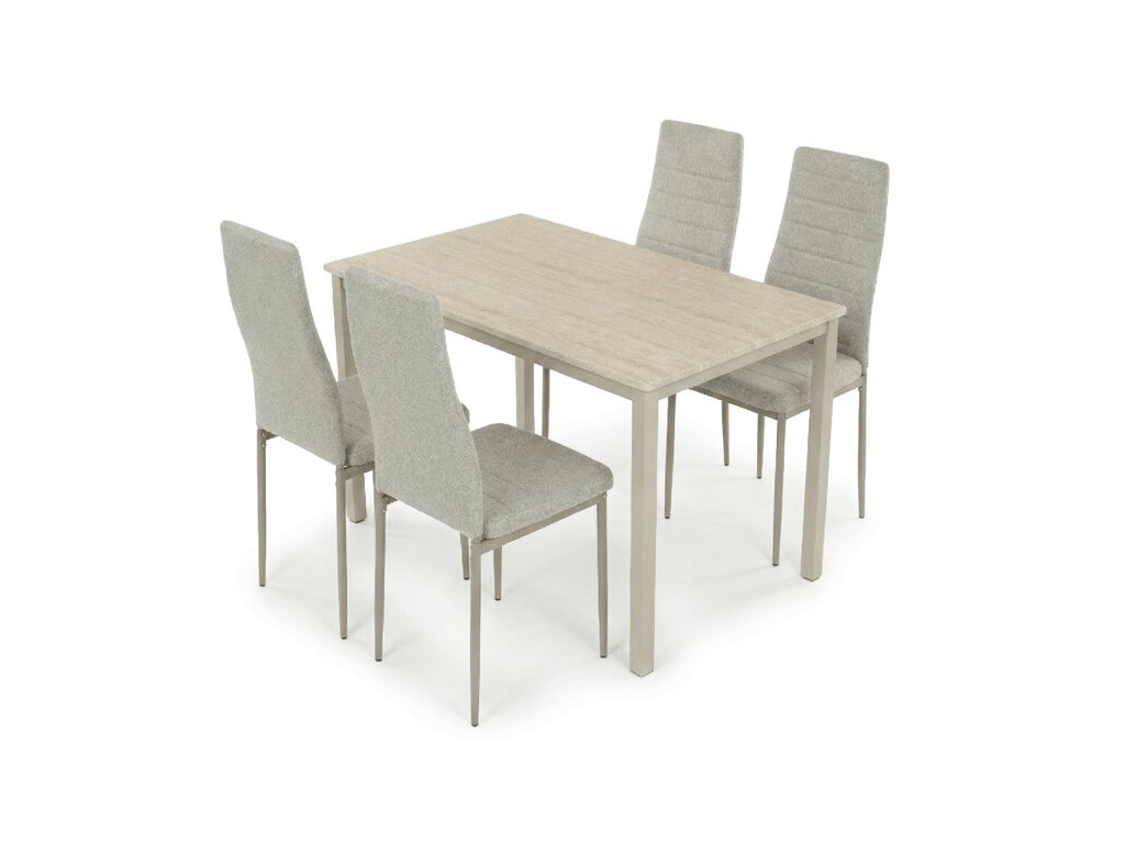Jídelní set ASE-1039 CRM2 zahrnuje stůl o rozměrech 110 × 70 × 75 cm a čtyři pohodlné židle v krémovém odstínu. Deska stolu z MDF v dekoru travertinu působí elegantně, připomíná přírodní kámen a je nenáročná na údržbu.