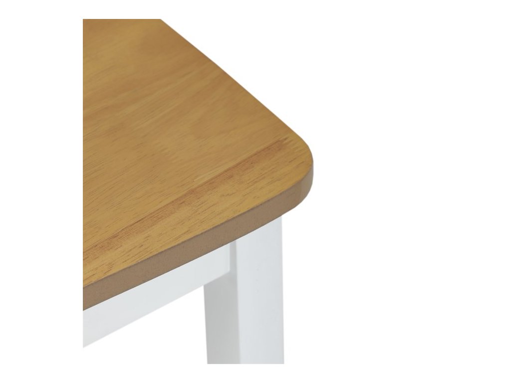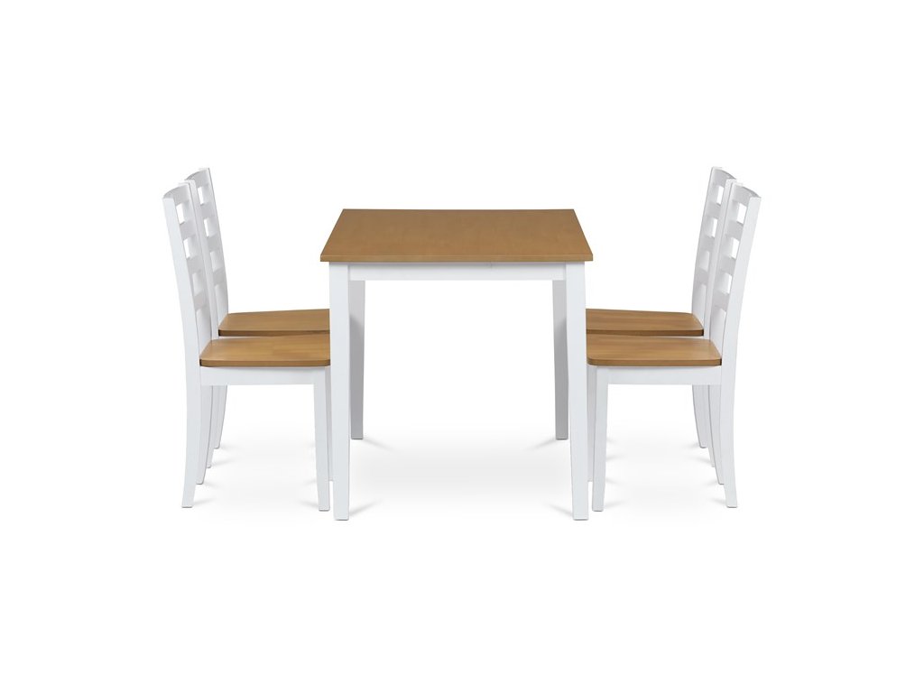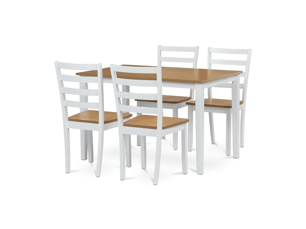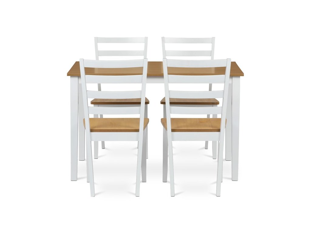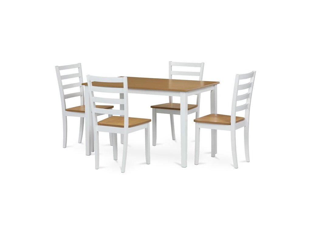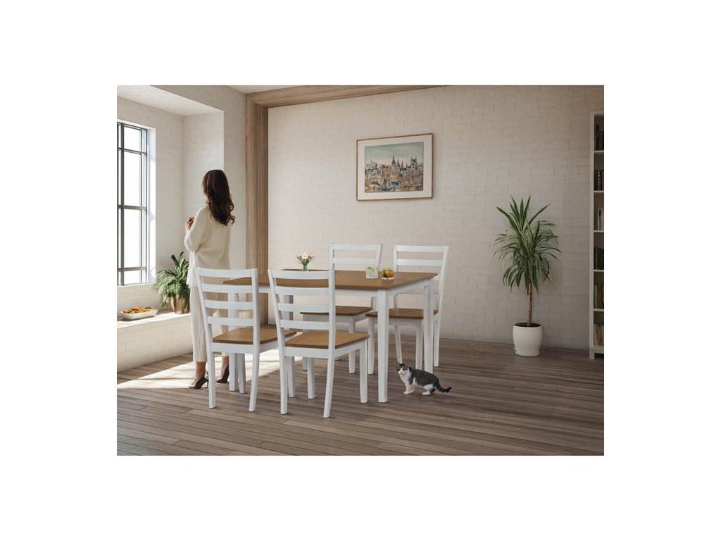 Jídelní set VESPA OAK značky Autronic vnáší do interiéru svěží kombinaci přírodních tónů a moderního designu. Stůl s deskou z MDF s dubovou dýhou a bíle lakovanými masivními nohami doplňují čtyři ladící židle. Celá sestava působí elegantně a vzdušně, je stabilní a vhodná pro každodenní i slavnostní stolování. Perfektně se hodí do moderních a skandinávsky laděných interiérů.