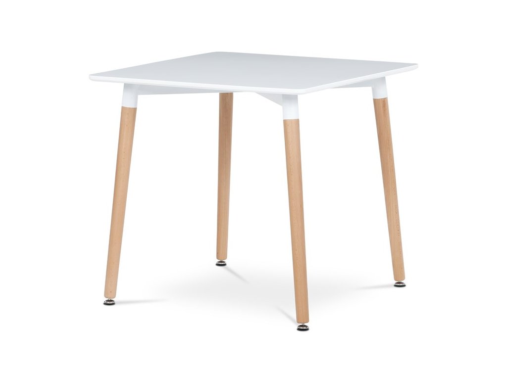 Jídelní stůl DT-303 WT o rozměrech 80×80×74 cm zaujme moderním vzhledem díky kombinaci bílé matné MDF desky a pevných noh z masivního dřeva. Matná povrchová úprava minimalizuje odlesky a usnadňuje údržbu, zatímco zaoblené rohy zvyšují bezpečnost při každodenním používání. Rektifikační koncovky na nohách umožňují přesné vyrovnání i na nerovné podlaze, což zajišťuje stabilitu a komfort při stolování. Pevná konstrukce spojuje kovové spoje a přírodní dřevěné prvky, díky čemuž stůl nabízí dlouhou životnost a spolehlivé používání.