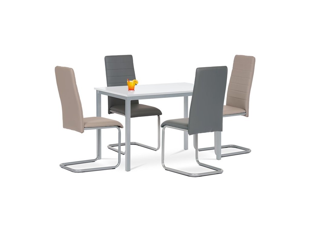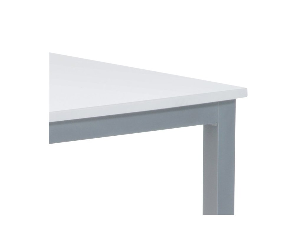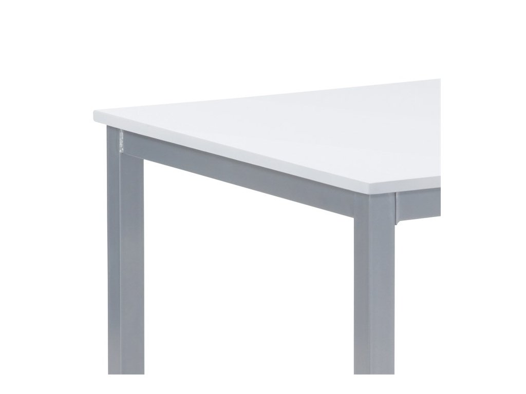 Stůl stojí na kovové konstrukci z profilů čtvercového průřezu se stříbrnošedou práškovou povrchovou úpravou, která zajišťuje stabilitu a dlouhou životnost. Nohy jsou opatřeny plastovými kluzáky, které chrání podlahu před poškozením. Díky svému neutrálnímu designu lze stůl využít nejen jako jídelní, ale také jako psací nebo pracovní stůl pro lehčí činnosti.