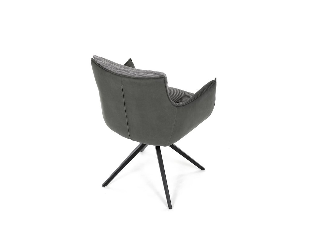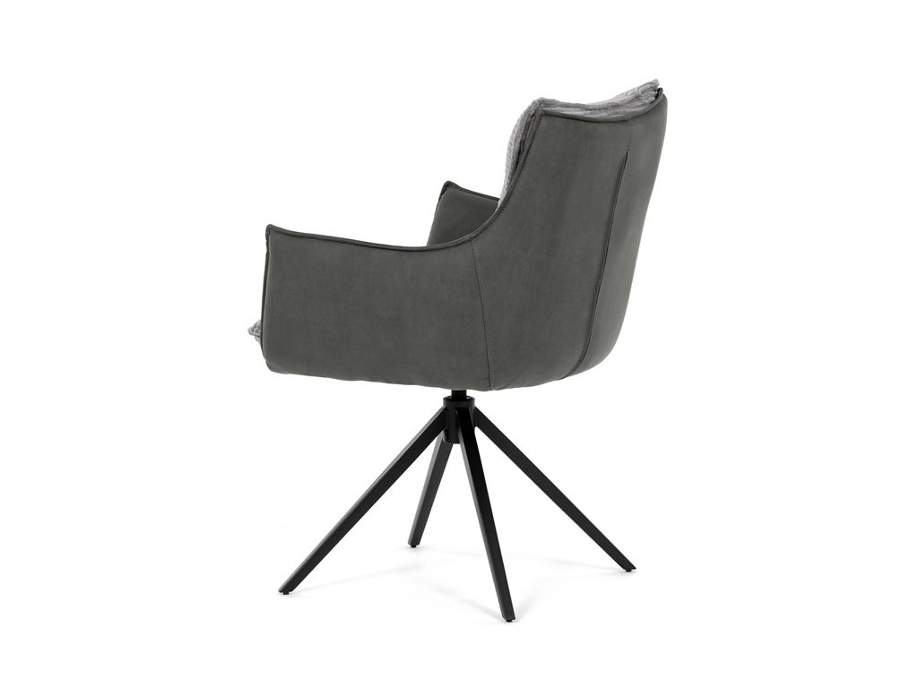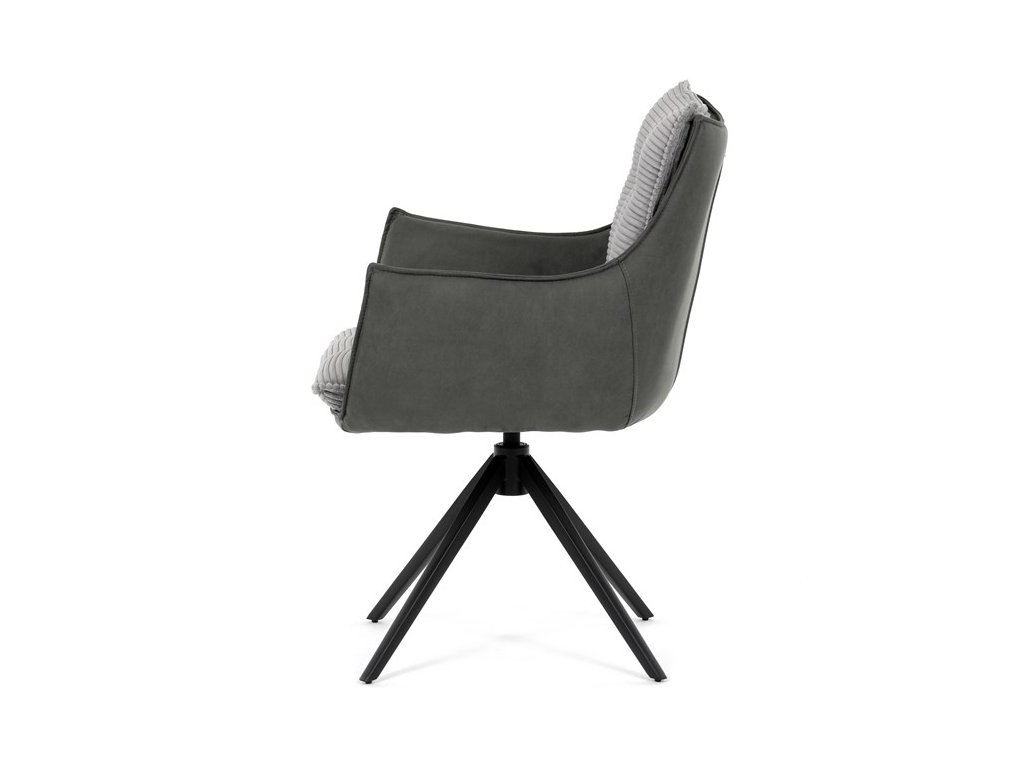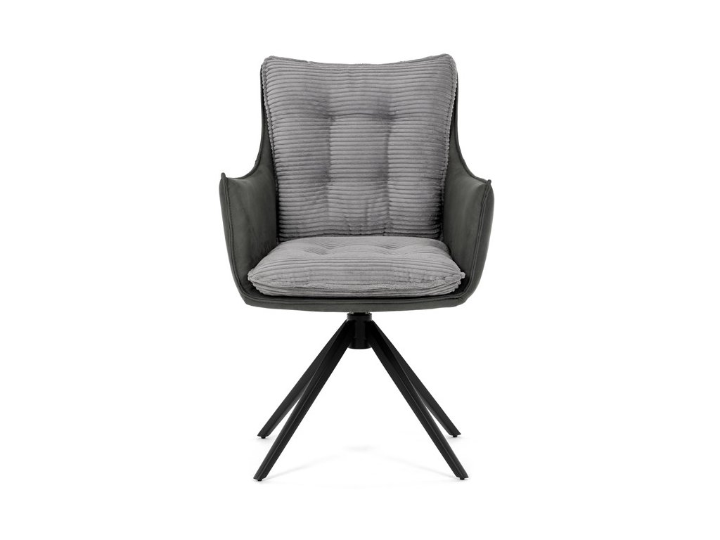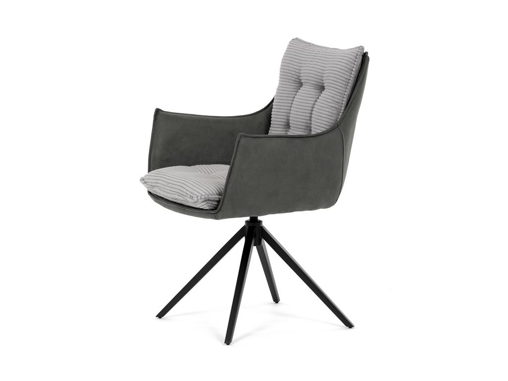 Sedák i opěrák jsou čalouněny kombinací dvou šedých látek – vnitřní část tvoří měkký žebrovaný textil s vysokým polstrováním pro pohodlné a ergonomické sezení. Prošité čalounění podtrhuje moderní vzhled a zároveň zajišťuje prodyšnost. Integrované područky přispívají k vyššímu komfortu bez omezování pohybu. Židle je skvělou volbou pro stylové jídelny i domácí pracovny.