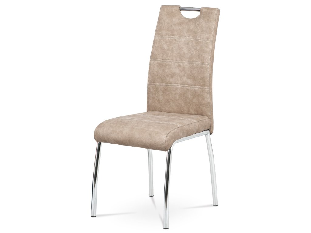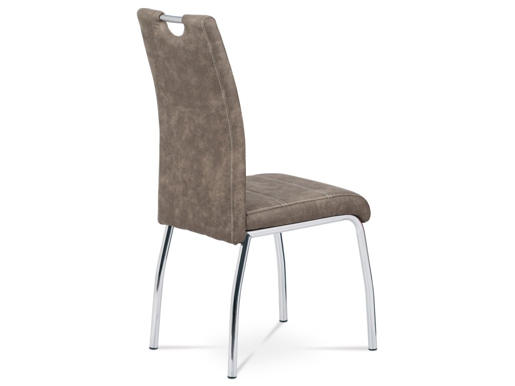 Moderní jídelní židle HC-486 zaujme elegantním vzhledem a praktickým provedením. Je čalouněná látkou COWBOY v dekoru vintage kůže, doplněnou o dekorativní prošití sedáku i opěráku.Stylový vzhled podtrhuje kovová podnož s chromovou úpravou, která je navíc speciálně tvarovaná pro vyšší stabilitu a bezpečnost. Nohy jsou zakončené černými plastovými kluzáky, které chrání podlahu před poškozením.