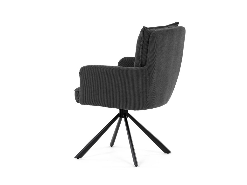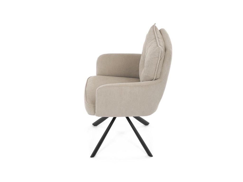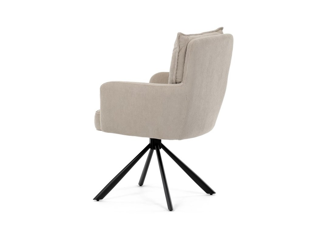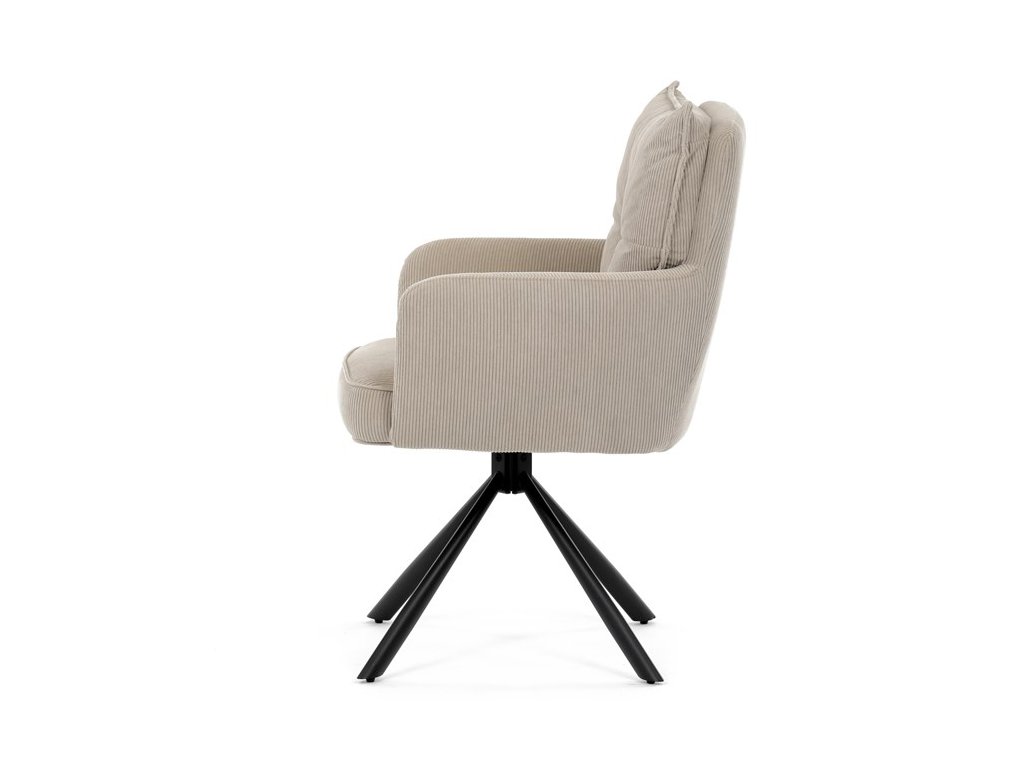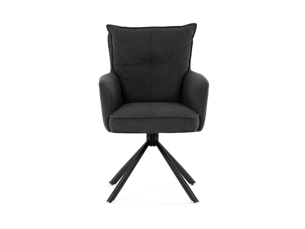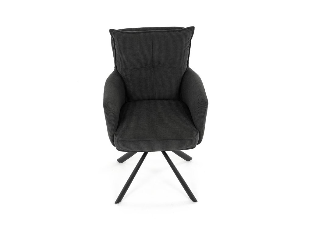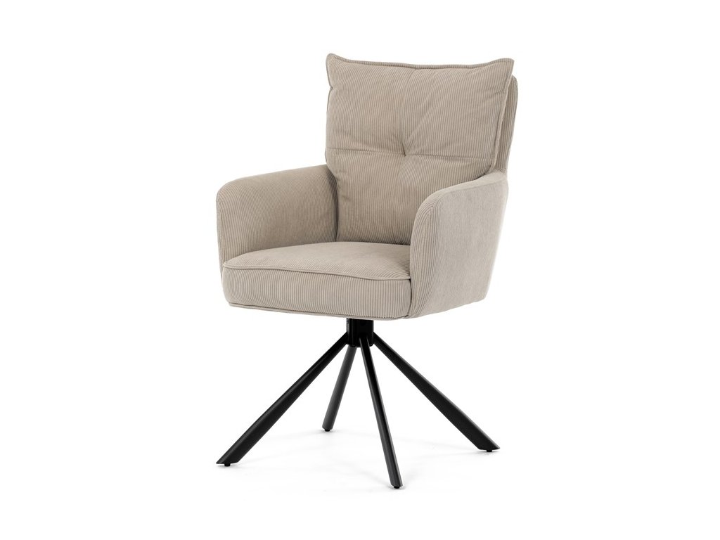 Židle disponuje otočnou funkcí s možností otáčení o 180° a vratným mechanismem reset, který automaticky vrací židli do výchozí polohy, což usnadňuje manipulaci a zvyšuje ergonomii. Pevné černé kovové nohy zajišťují stabilitu a odolnost, přičemž jejich design dodává židli moderní vzhled vhodný do různých interiérů. Područky jsou integrované v čalounění, což podporuje pohodlné opření rukou během sezení.