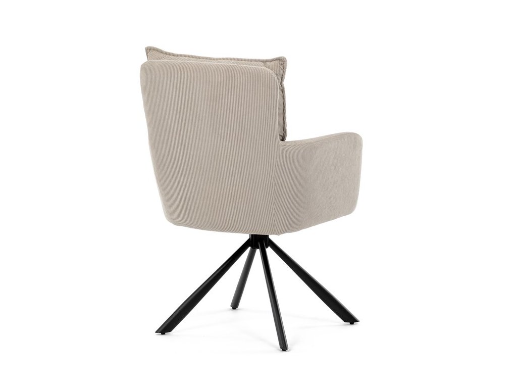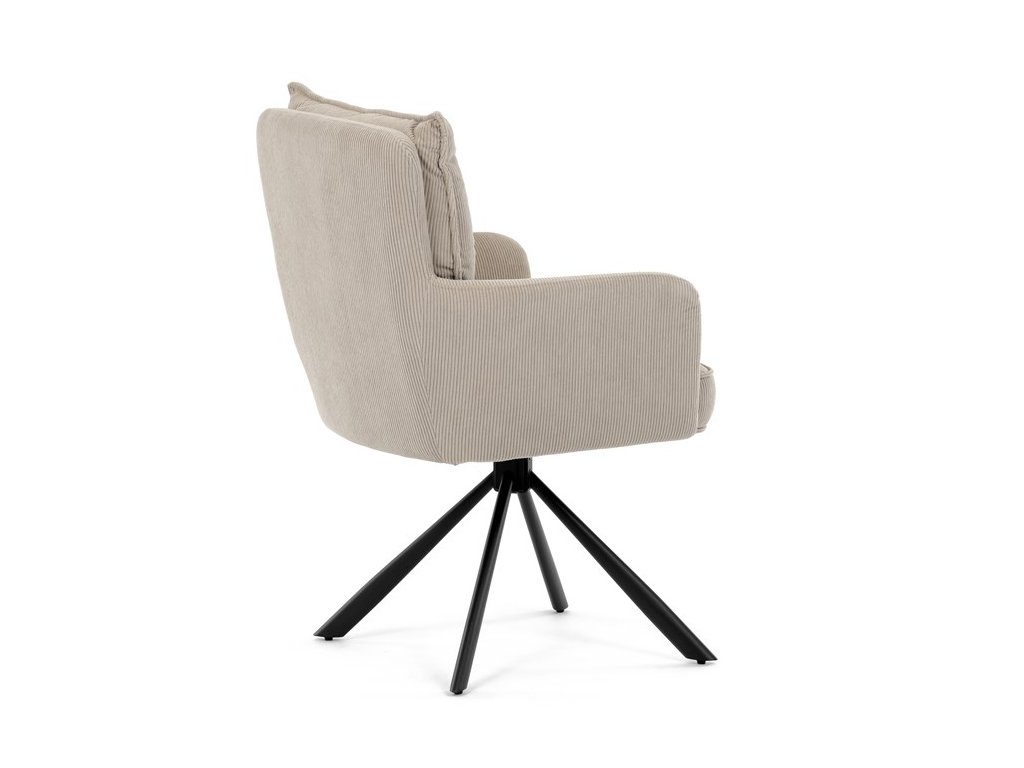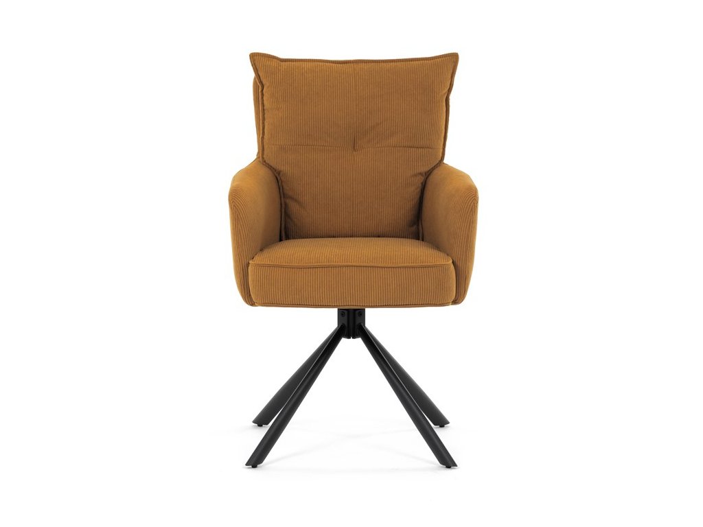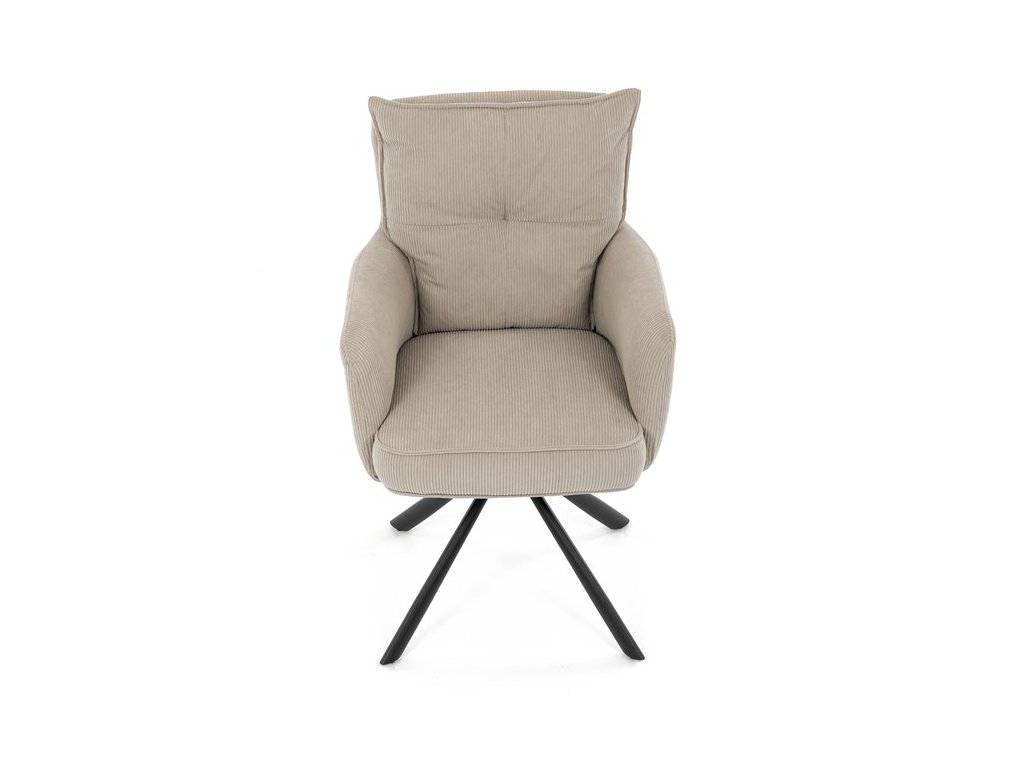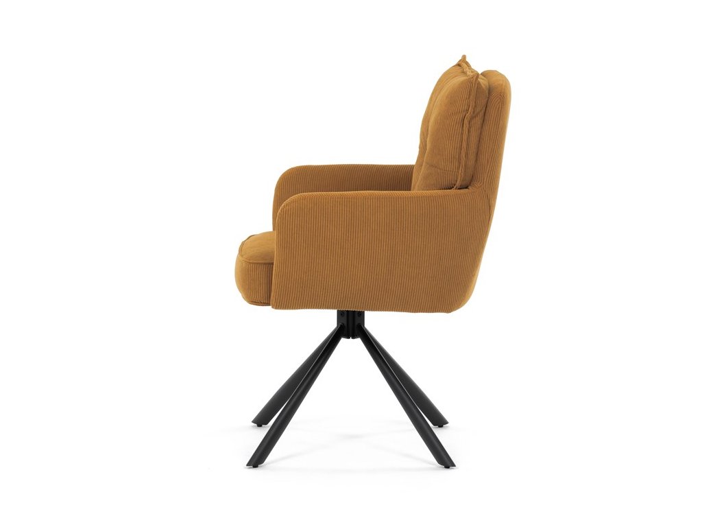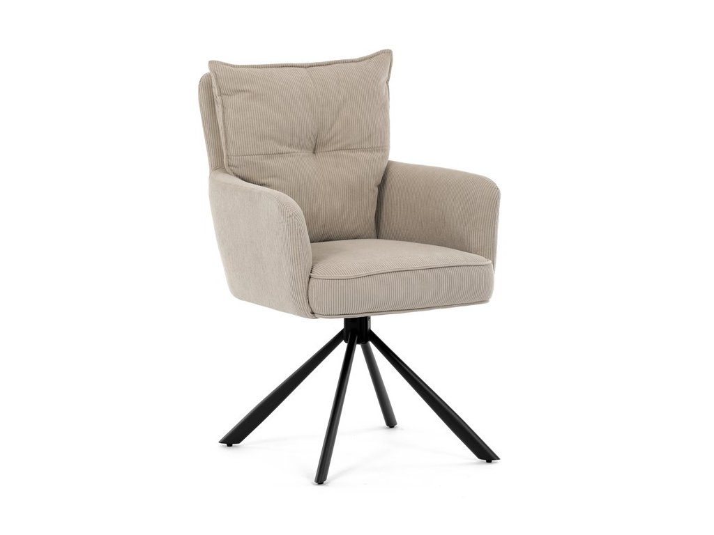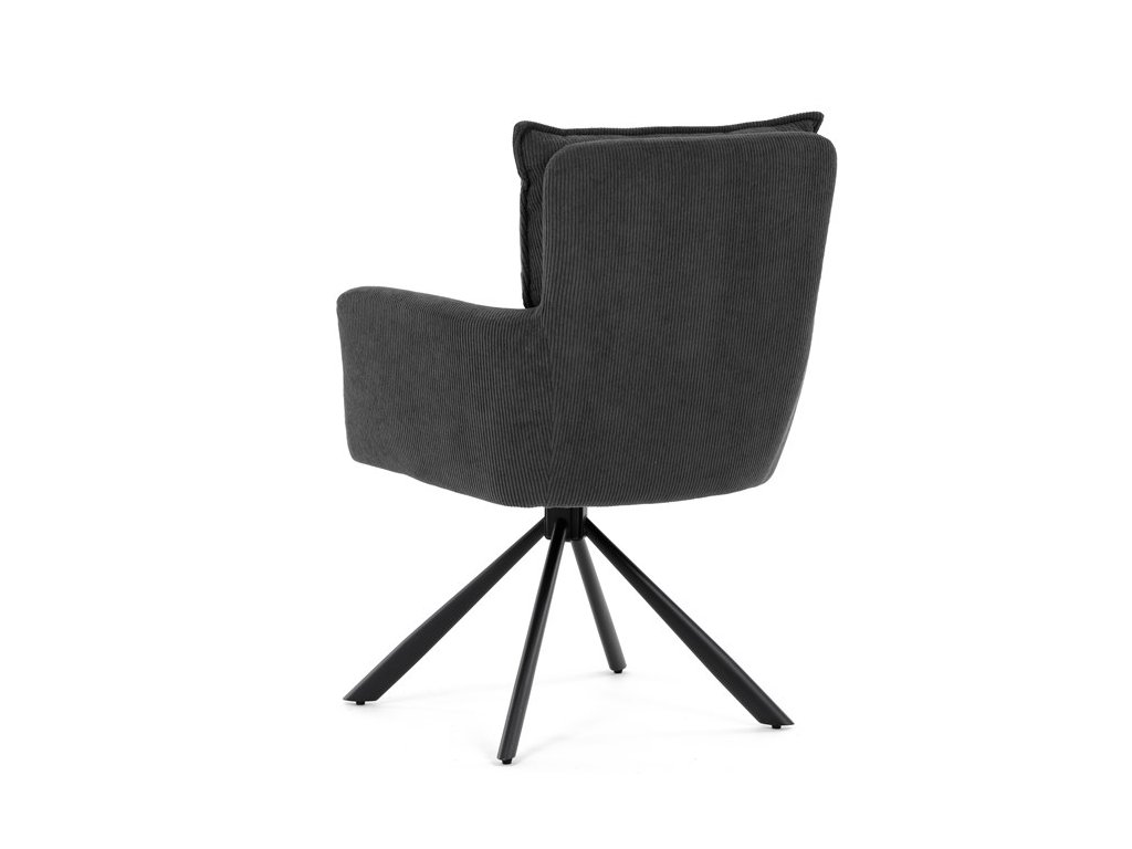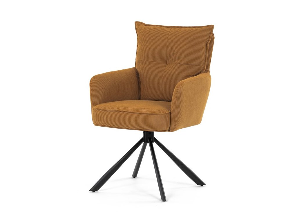 Židle disponuje otočnou funkcí s možností otáčení o 180° a vratným mechanismem reset, který automaticky vrací židli do výchozí polohy, což usnadňuje manipulaci a zvyšuje ergonomii. Pevné černé kovové nohy zajišťují stabilitu a odolnost, přičemž jejich design dodává židli moderní vzhled vhodný do různých interiérů. Područky jsou integrované v čalounění, což podporuje pohodlné opření rukou během sezení.
