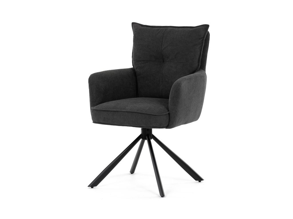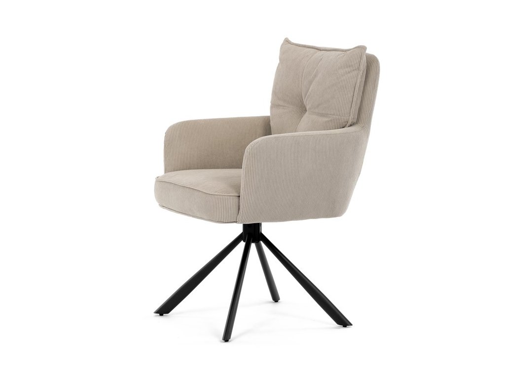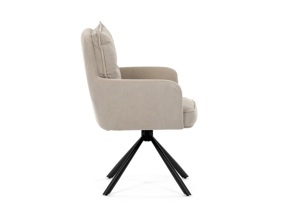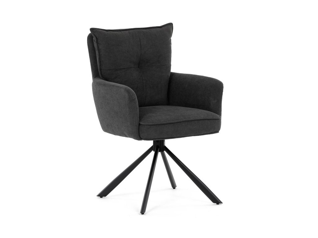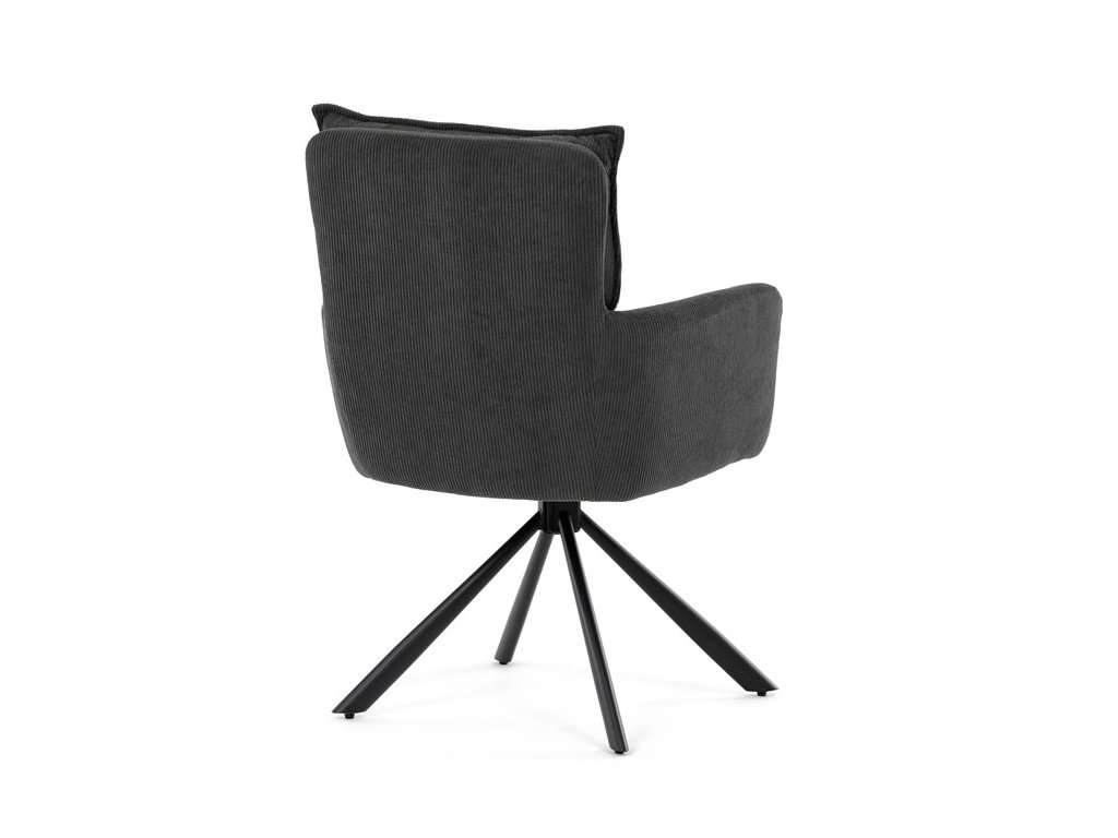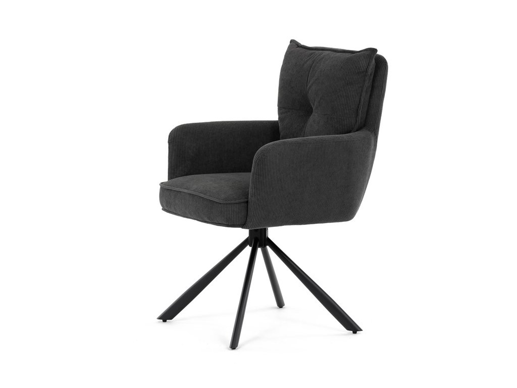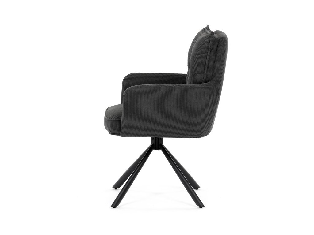 Židle disponuje otočnou funkcí s možností otáčení o 180° a vratným mechanismem reset, který automaticky vrací židli do výchozí polohy, což usnadňuje manipulaci a zvyšuje ergonomii. Pevné černé kovové nohy zajišťují stabilitu a odolnost, přičemž jejich design dodává židli moderní vzhled vhodný do různých interiérů. Područky jsou integrované v čalounění, což podporuje pohodlné opření rukou během sezení.