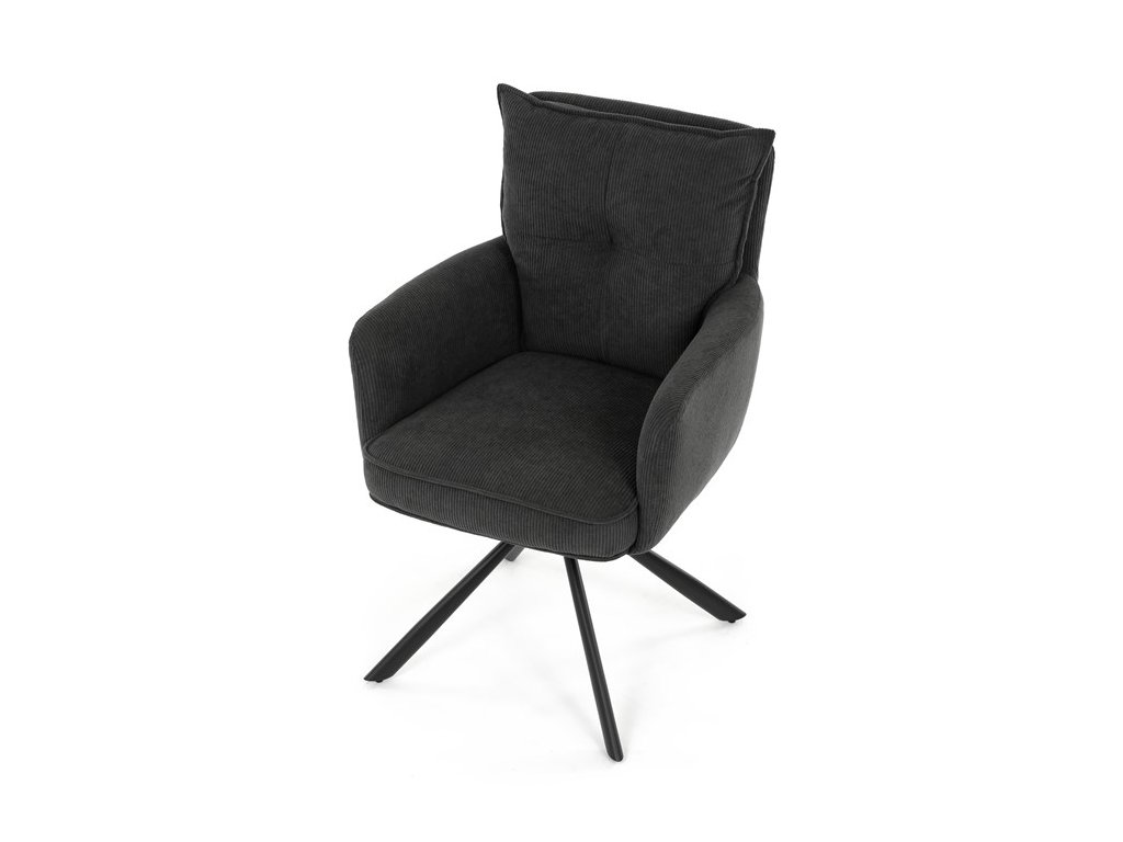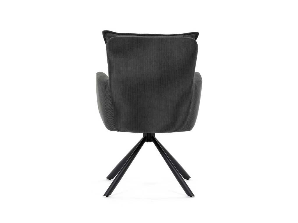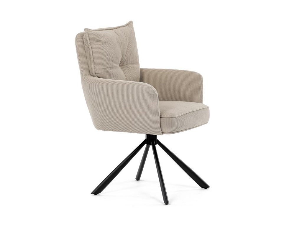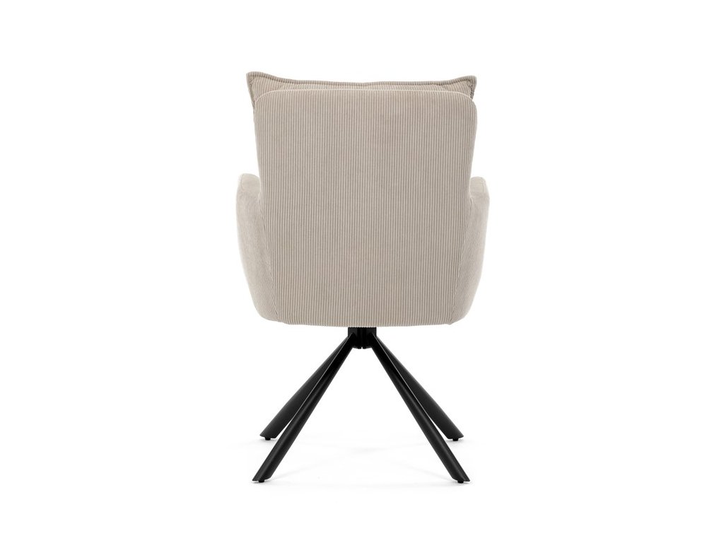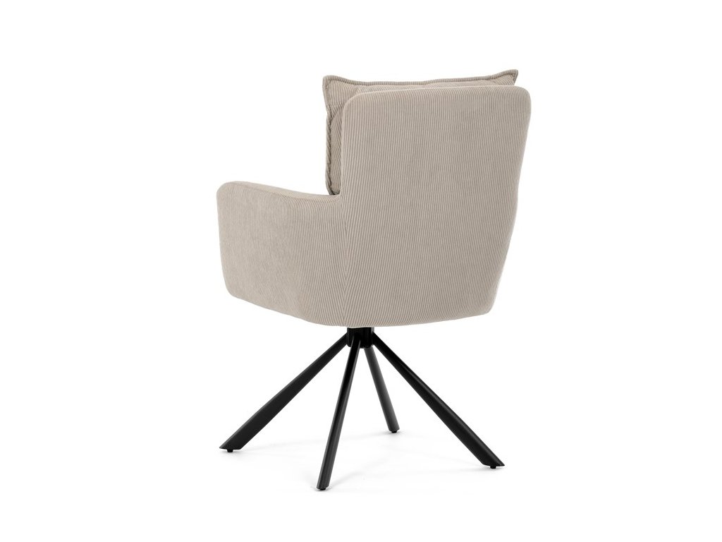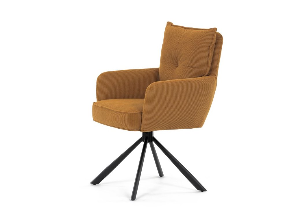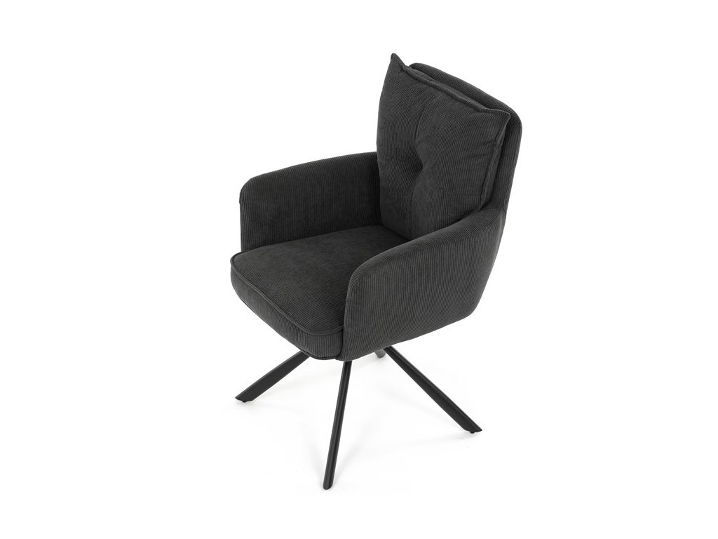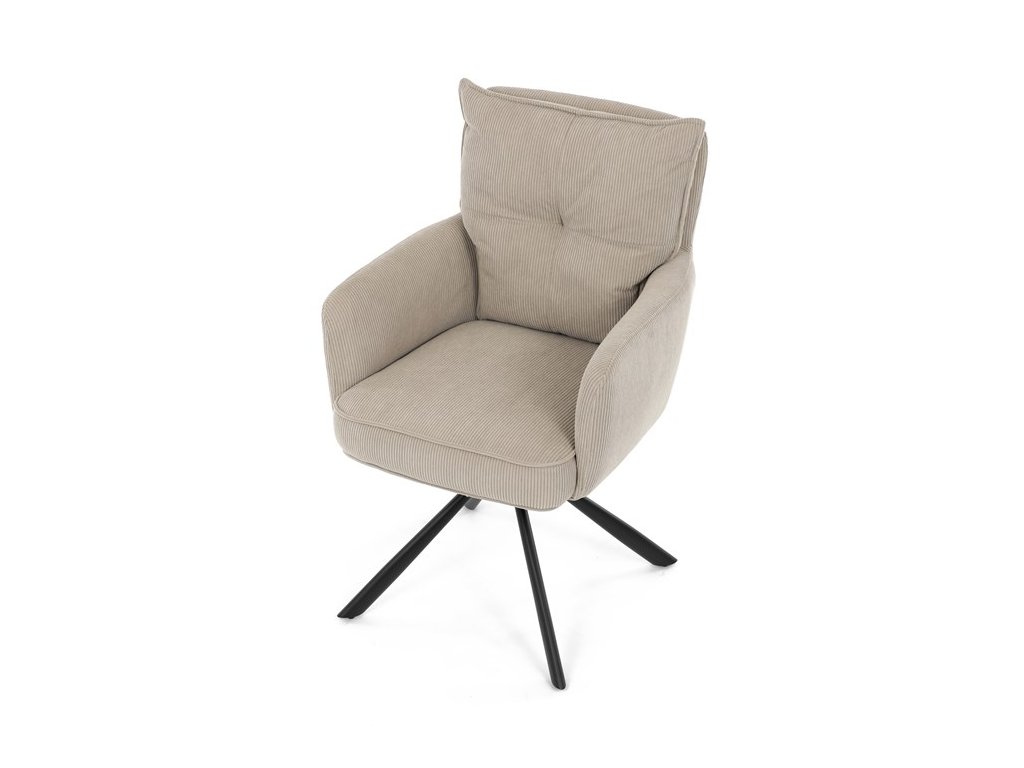 Židle disponuje otočnou funkcí s možností otáčení o 180° a vratným mechanismem reset, který automaticky vrací židli do výchozí polohy, což usnadňuje manipulaci a zvyšuje ergonomii. Pevné černé kovové nohy zajišťují stabilitu a odolnost, přičemž jejich design dodává židli moderní vzhled vhodný do různých interiérů. Područky jsou integrované v čalounění, což podporuje pohodlné opření rukou během sezení.