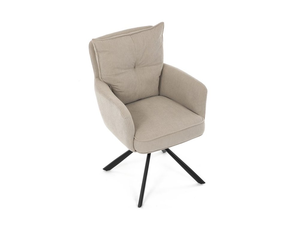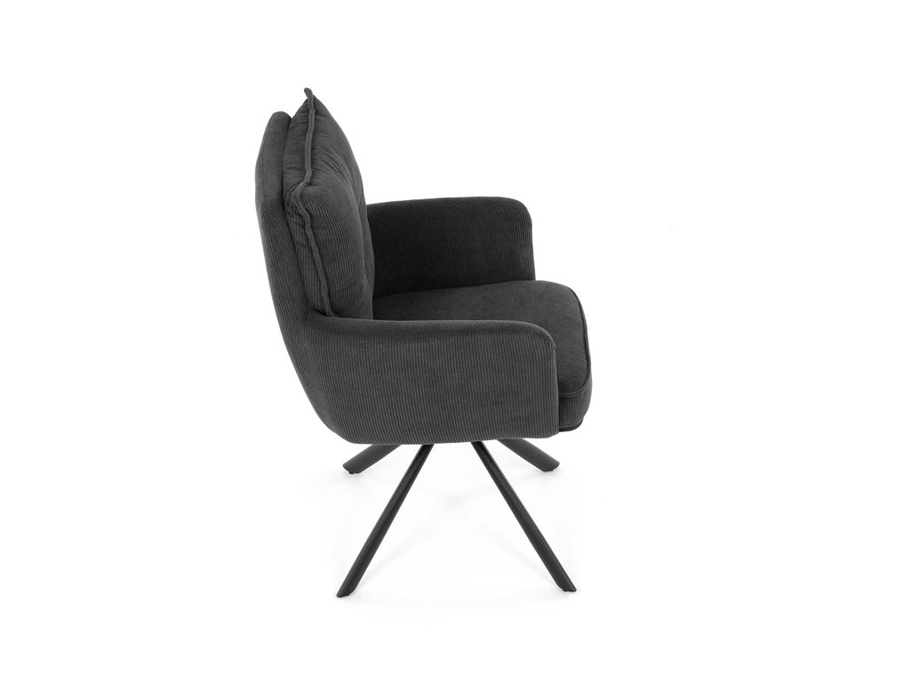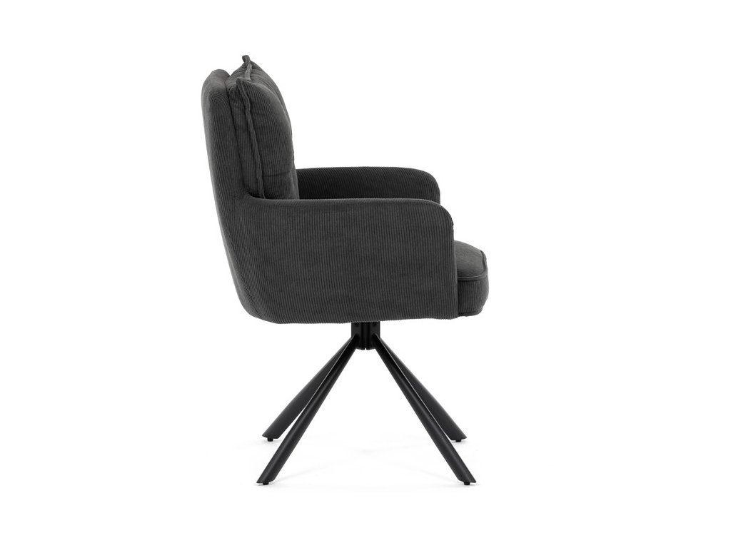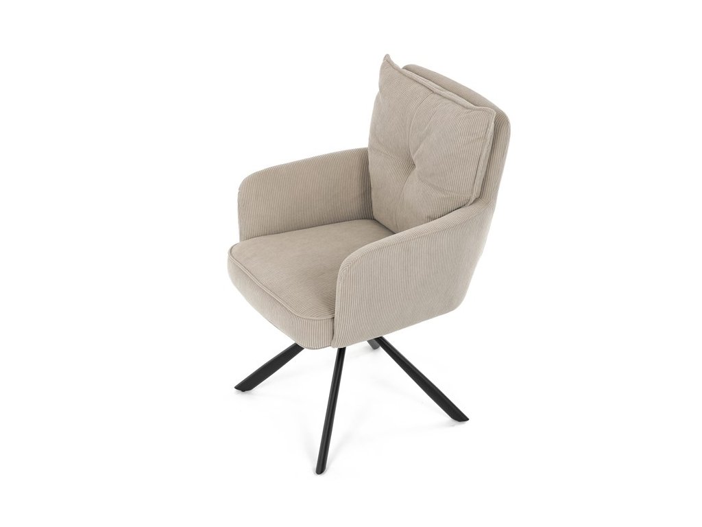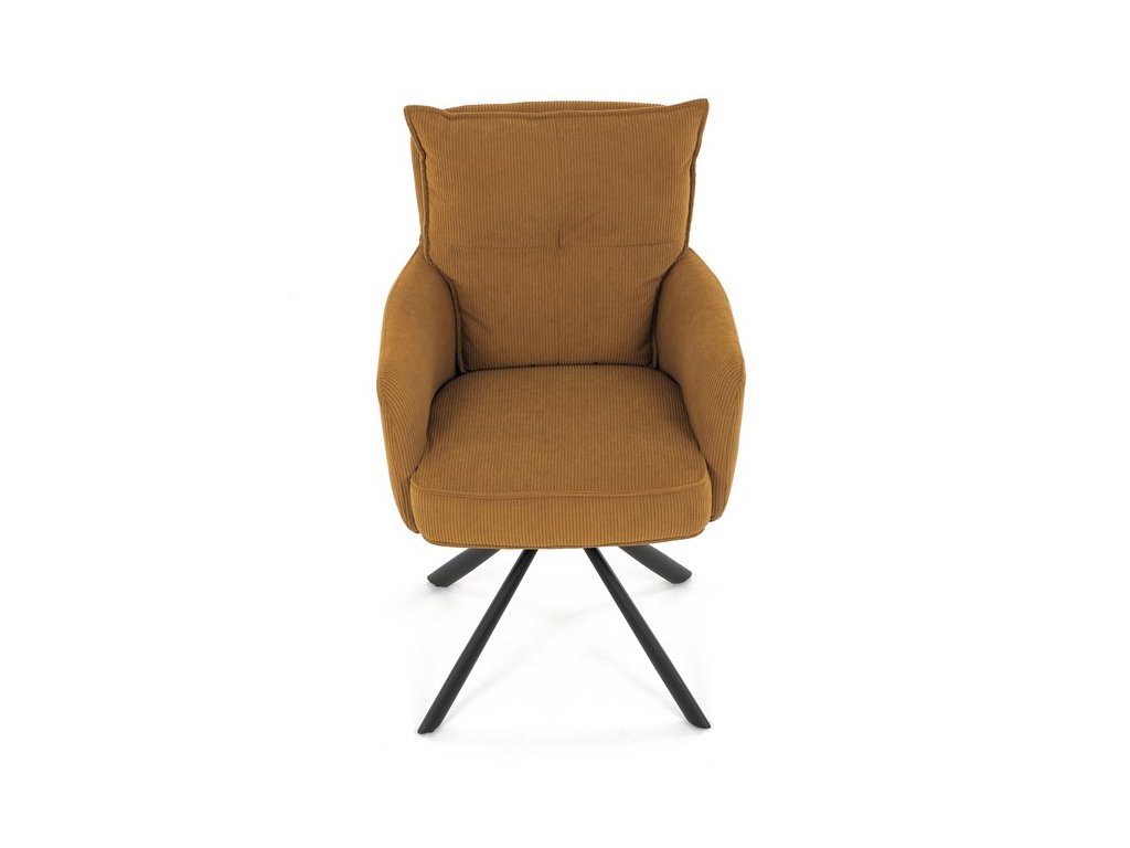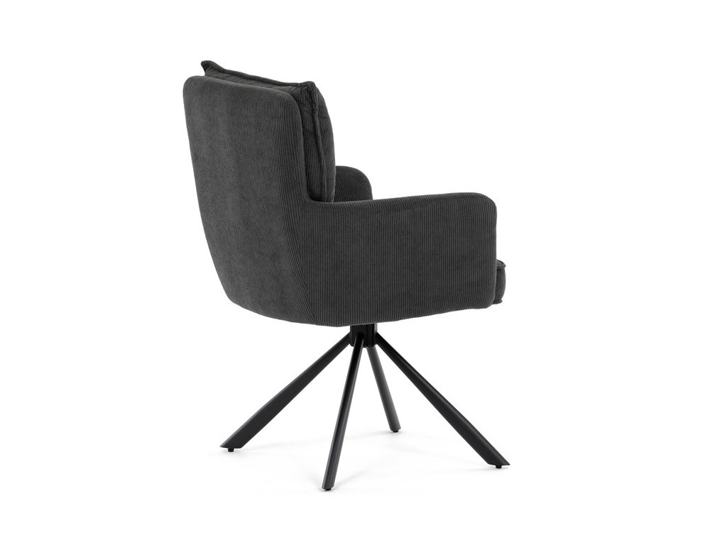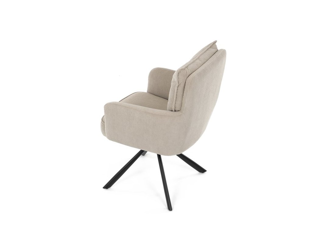 Židle disponuje otočnou funkcí s možností otáčení o 180° a vratným mechanismem reset, který automaticky vrací židli do výchozí polohy, což usnadňuje manipulaci a zvyšuje ergonomii. Pevné černé kovové nohy zajišťují stabilitu a odolnost, přičemž jejich design dodává židli moderní vzhled vhodný do různých interiérů. Područky jsou integrované v čalounění, což podporuje pohodlné opření rukou během sezení.