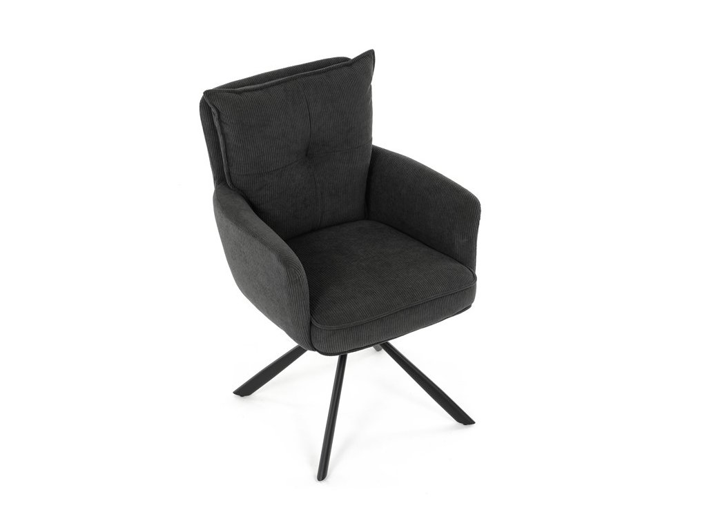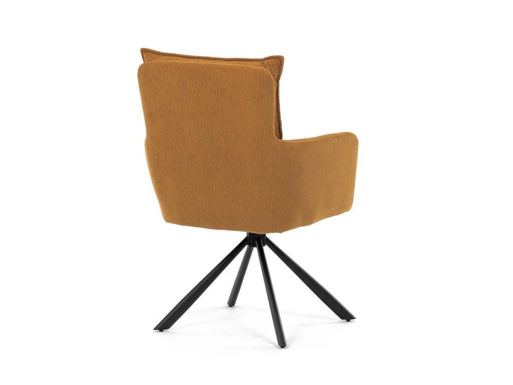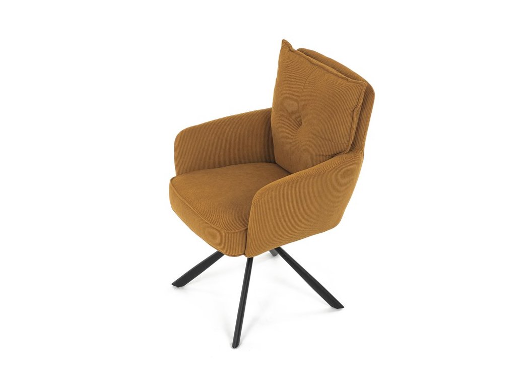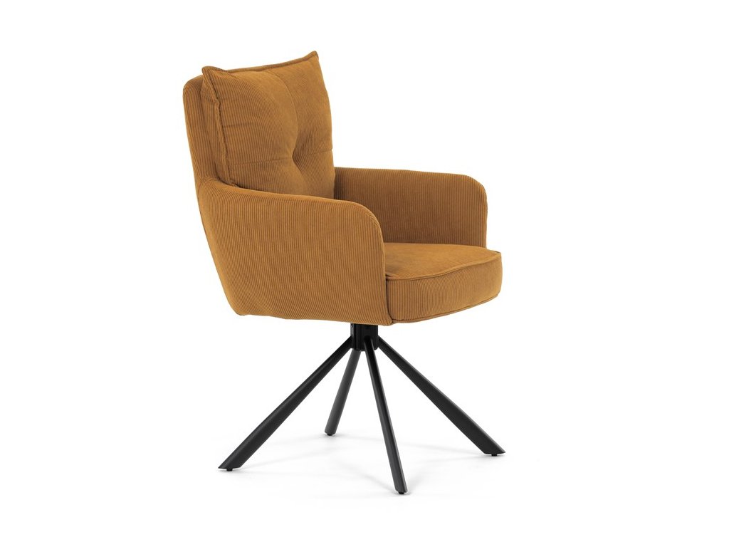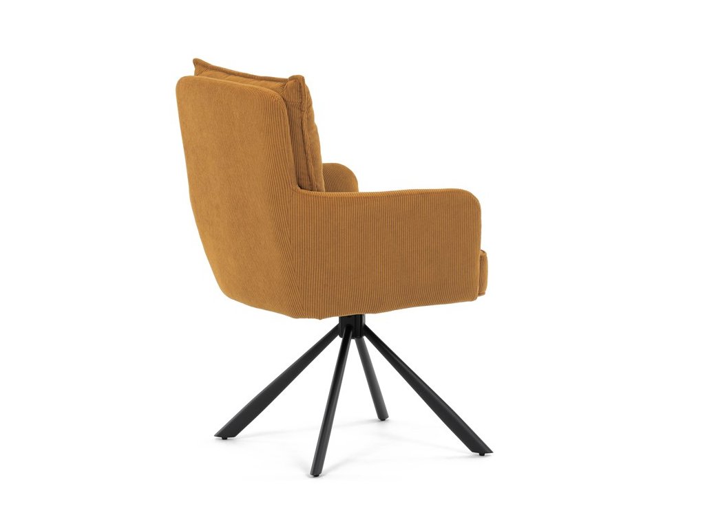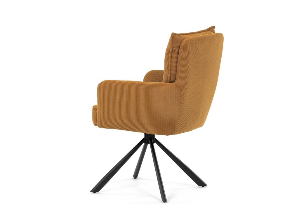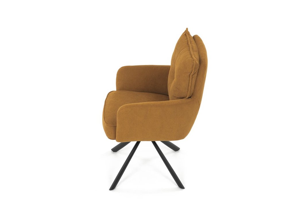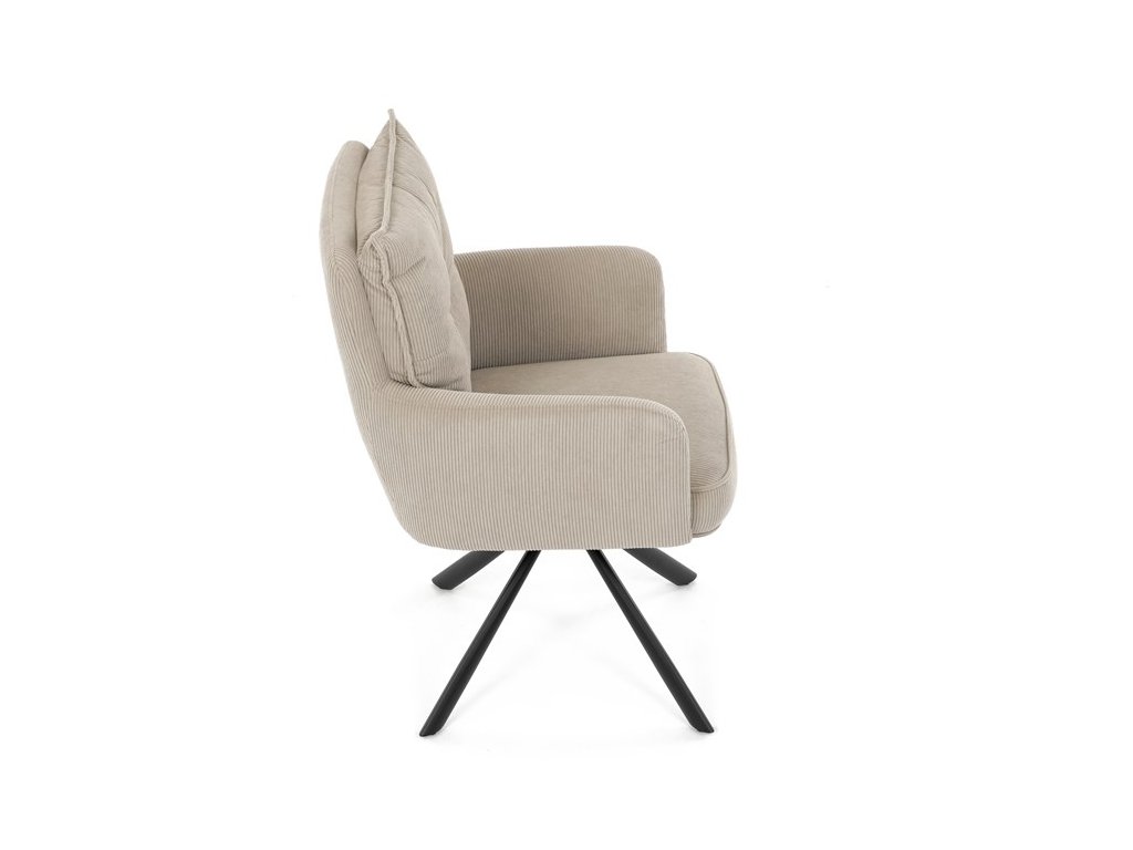 Židle disponuje otočnou funkcí s možností otáčení o 180° a vratným mechanismem reset, který automaticky vrací židli do výchozí polohy, což usnadňuje manipulaci a zvyšuje ergonomii. Pevné černé kovové nohy zajišťují stabilitu a odolnost, přičemž jejich design dodává židli moderní vzhled vhodný do různých interiérů. Područky jsou integrované v čalounění, což podporuje pohodlné opření rukou během sezení.