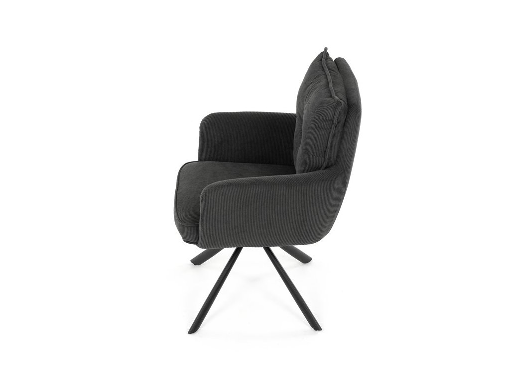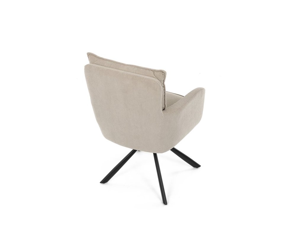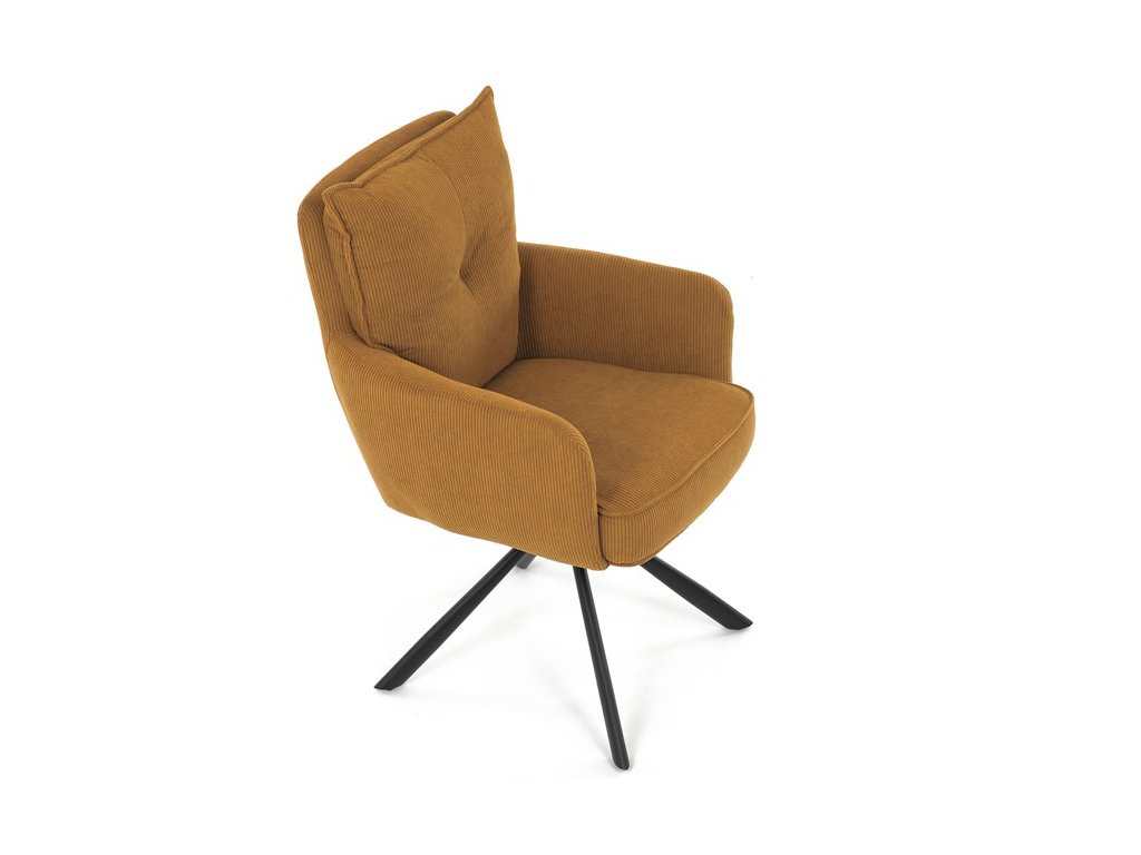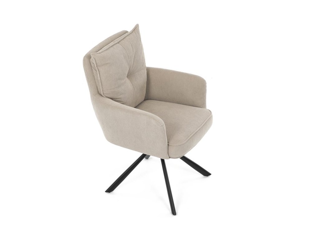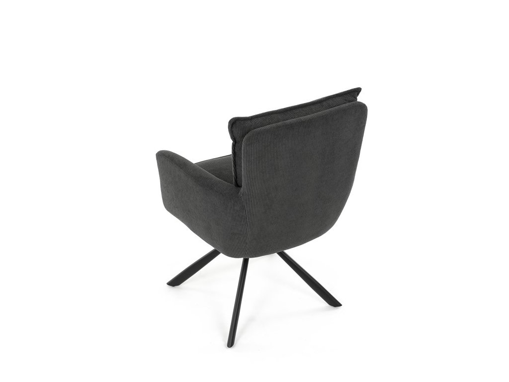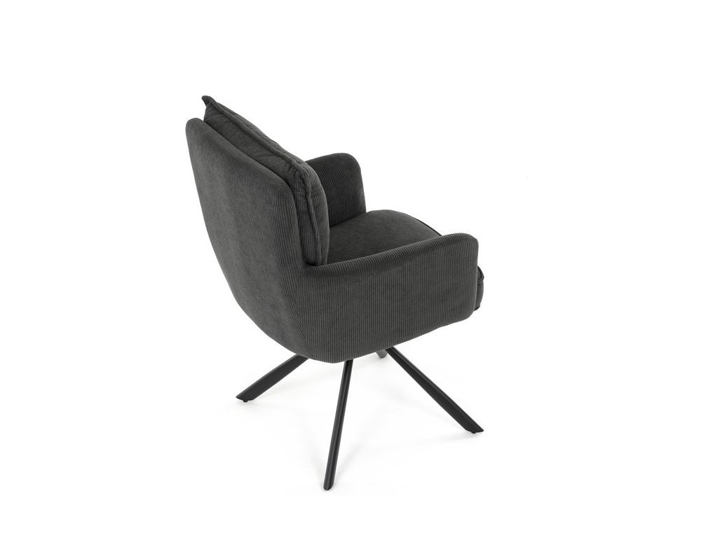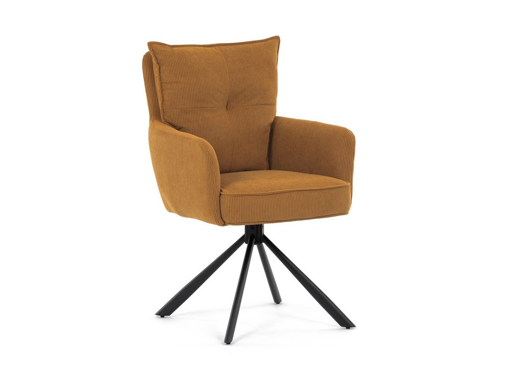 Židle disponuje otočnou funkcí s možností otáčení o 180° a vratným mechanismem reset, který automaticky vrací židli do výchozí polohy, což usnadňuje manipulaci a zvyšuje ergonomii. Pevné černé kovové nohy zajišťují stabilitu a odolnost, přičemž jejich design dodává židli moderní vzhled vhodný do různých interiérů. Područky jsou integrované v čalounění, což podporuje pohodlné opření rukou během sezení.