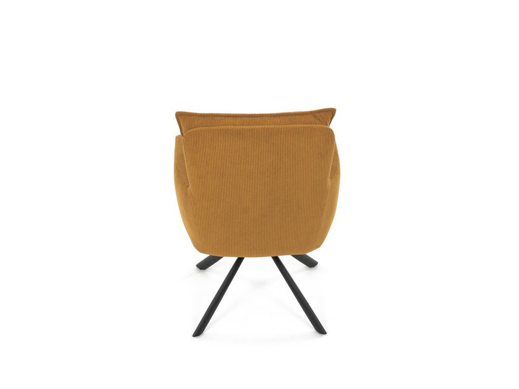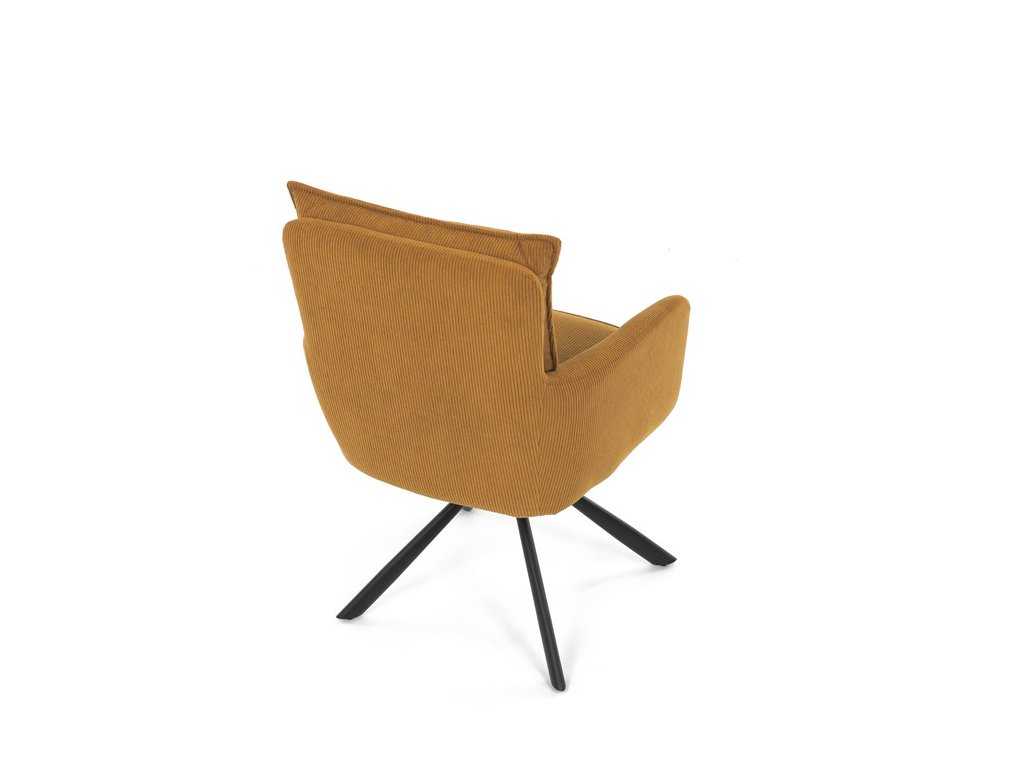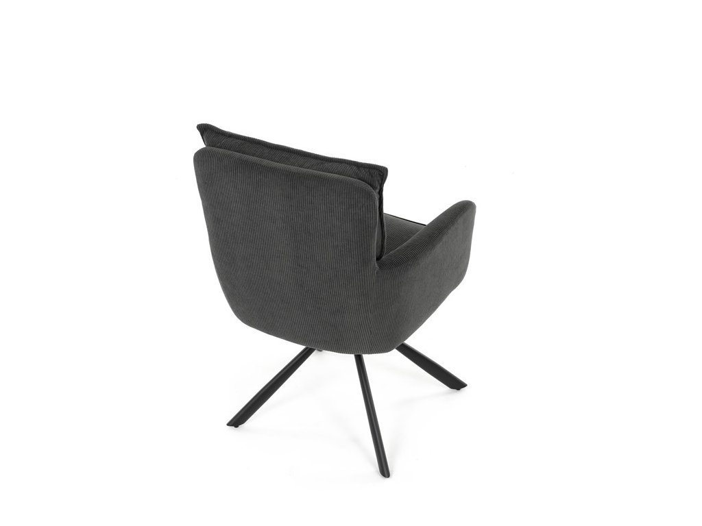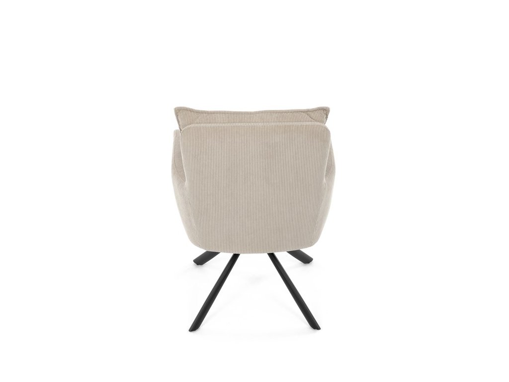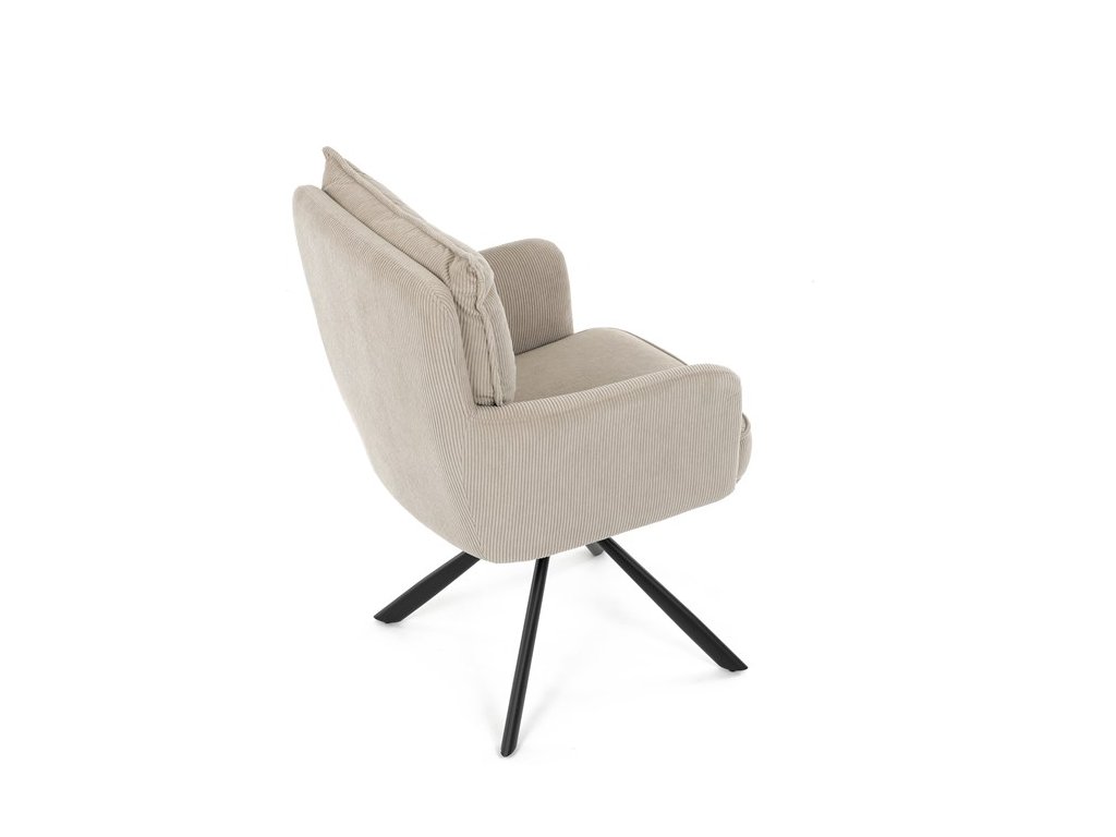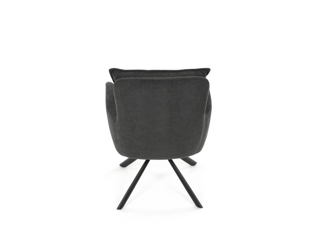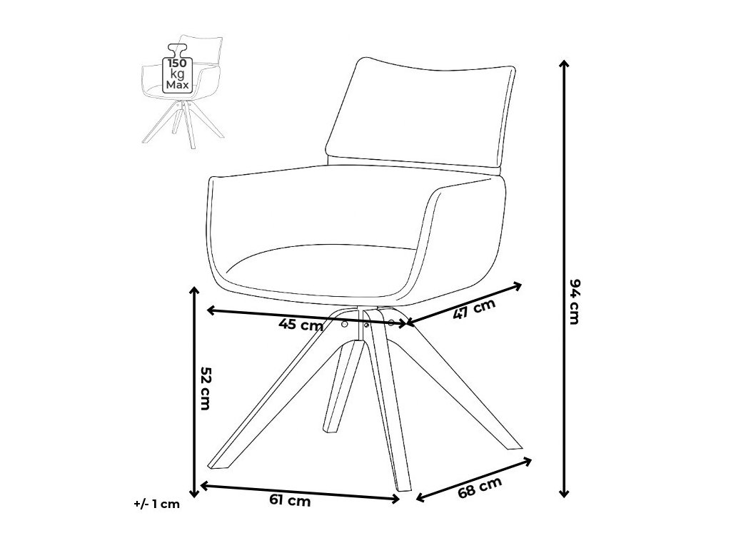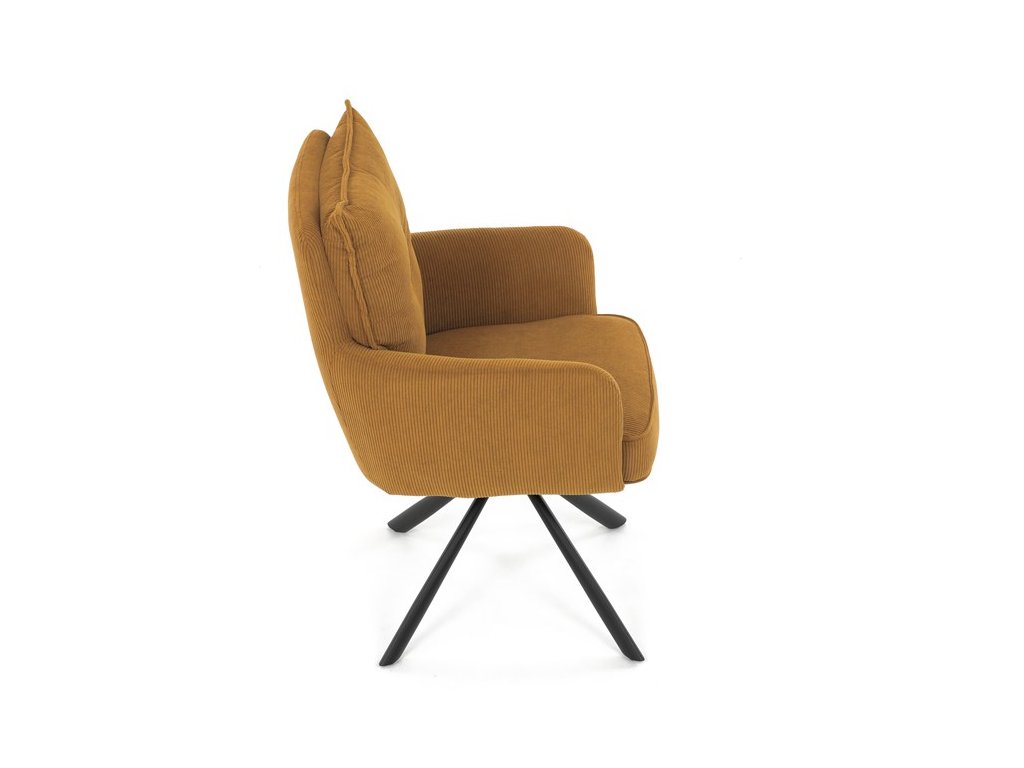 Židle disponuje otočnou funkcí s možností otáčení o 180° a vratným mechanismem reset, který automaticky vrací židli do výchozí polohy, což usnadňuje manipulaci a zvyšuje ergonomii. Pevné černé kovové nohy zajišťují stabilitu a odolnost, přičemž jejich design dodává židli moderní vzhled vhodný do různých interiérů. Područky jsou integrované v čalounění, což podporuje pohodlné opření rukou během sezení.