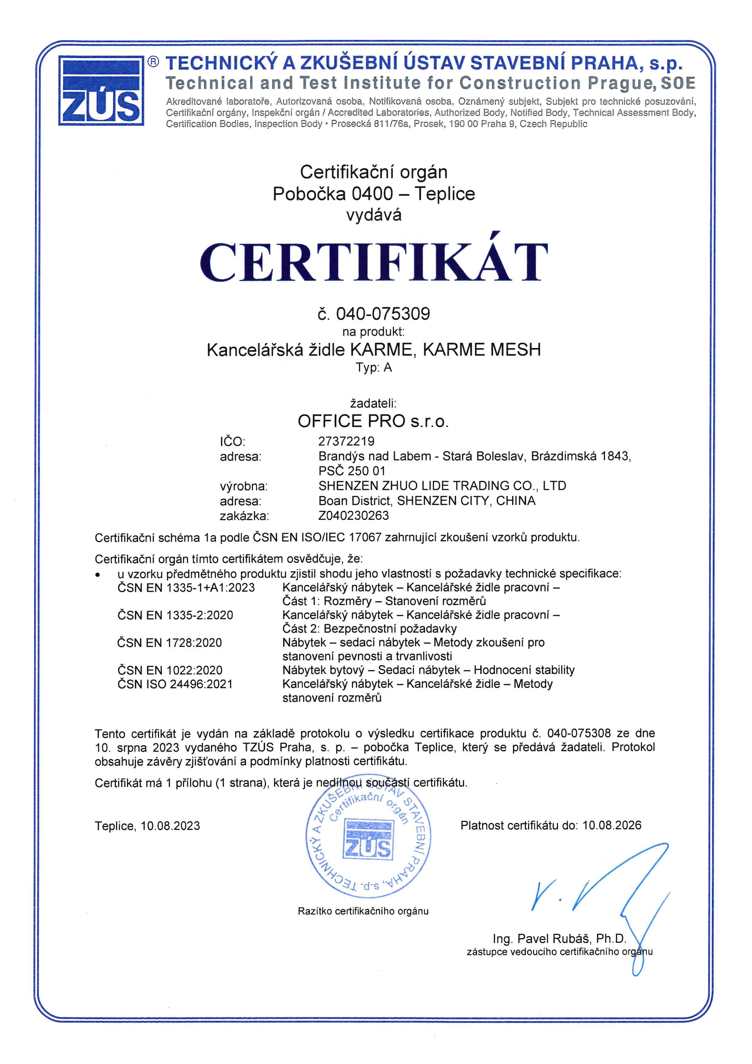 - Certifikát státní zkušebny o shodě s ČSN EN 1335–1:2000 a ČSN EN 1335–2:2009