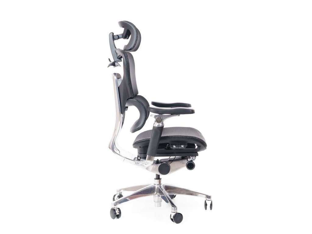 Židle je vybavena synchronním mechanismem s vícebodovou aretací, možností hloubkového nastavení sedu a plně nastavitelnými 7D područkami s polyuretanovými krytkami otočnými o 360°. Stabilitu zajišťuje hliníkový pětiramenný kříž s univerzálními kolečky Ø 60 mm vhodnými pro všechny typy podlah. Praktickým doplňkem je také odkládací ramínko na šaty. Barevné provedení: černá samonosná síťovina