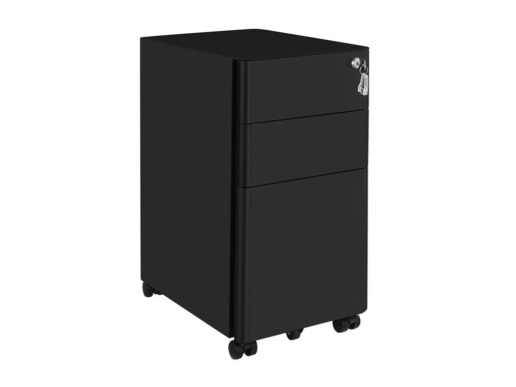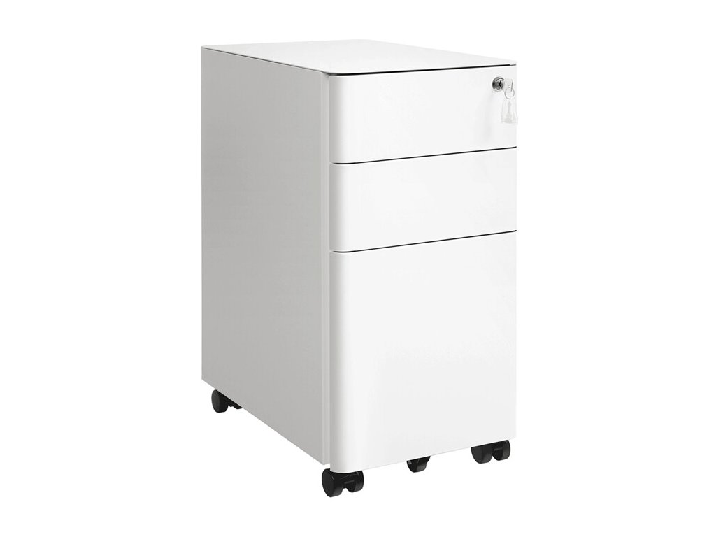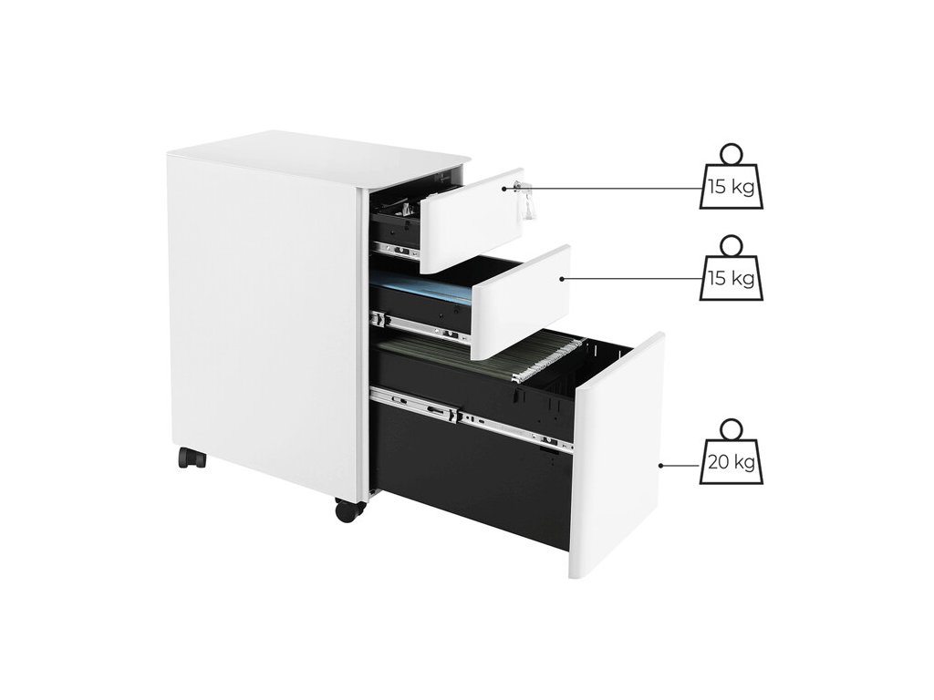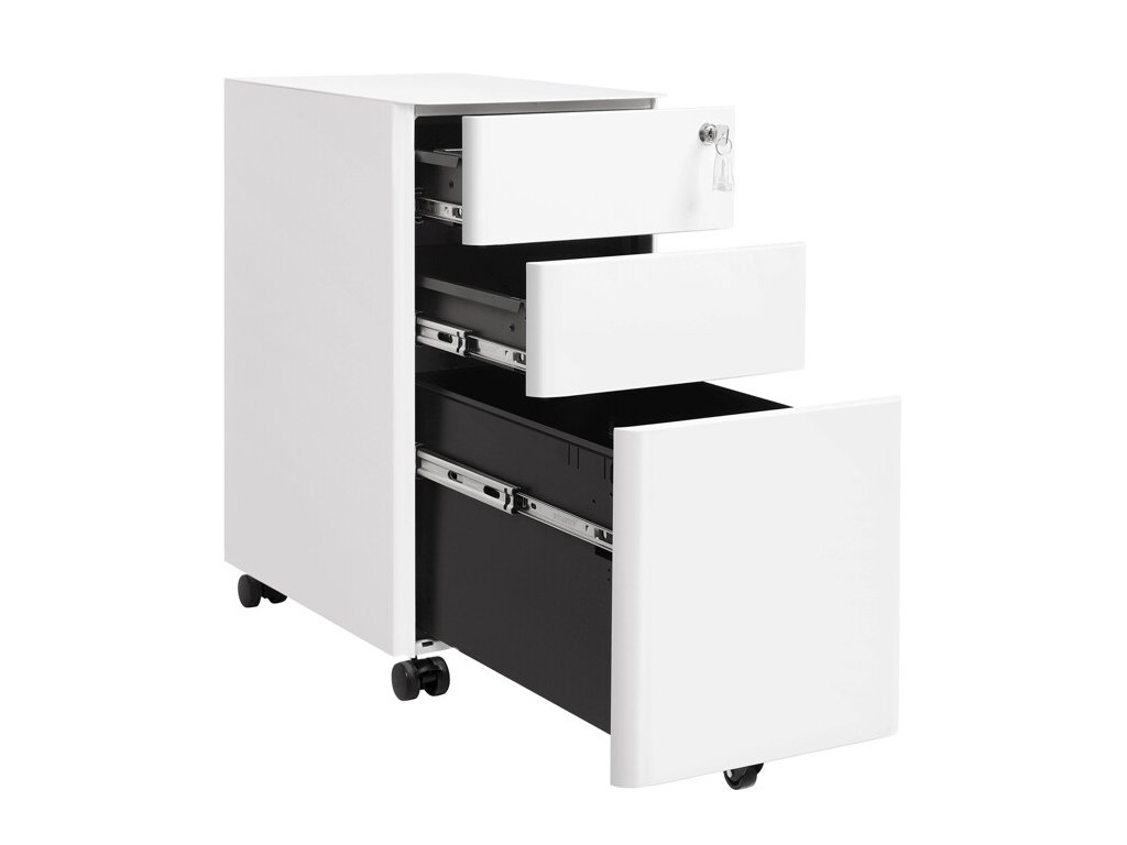 Kontejner je vybaven třemi zásuvkami, které poskytují dostatek úložného prostoru pro dokumenty, kancelářské potřeby i drobné osobní předměty. Zámek s klíčem umožňuje bezpečné uzamčení obsahu, což oceníte zejména při ukládání důležitých dokumentů.
