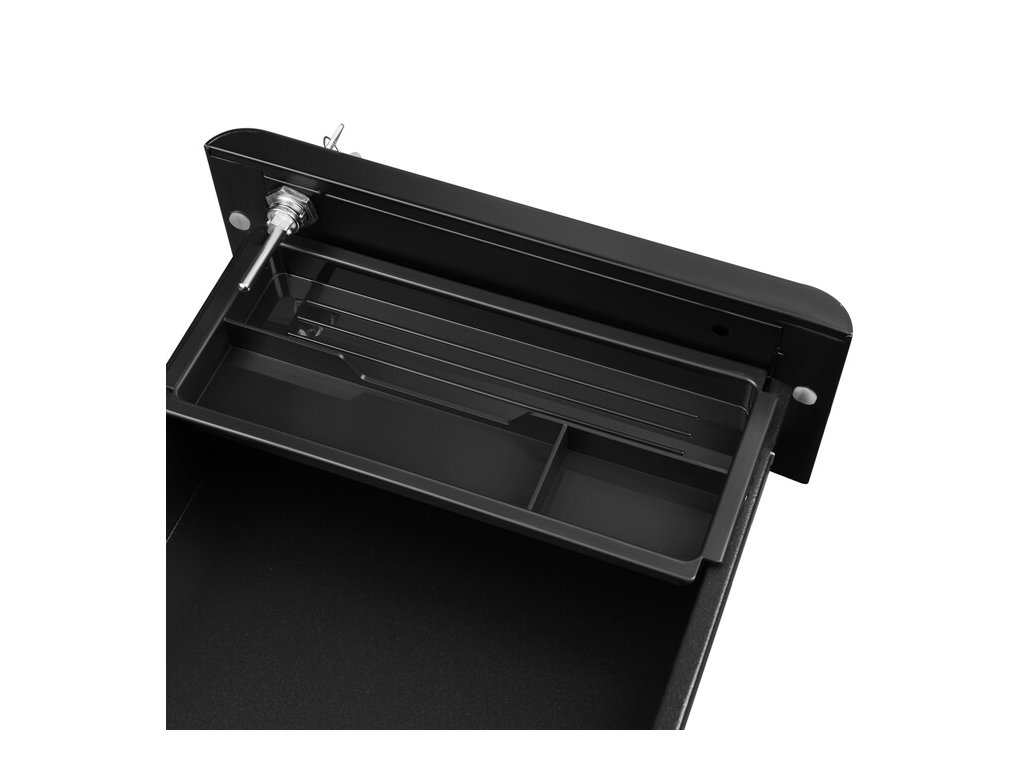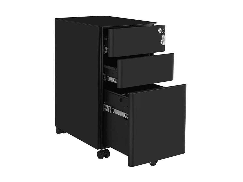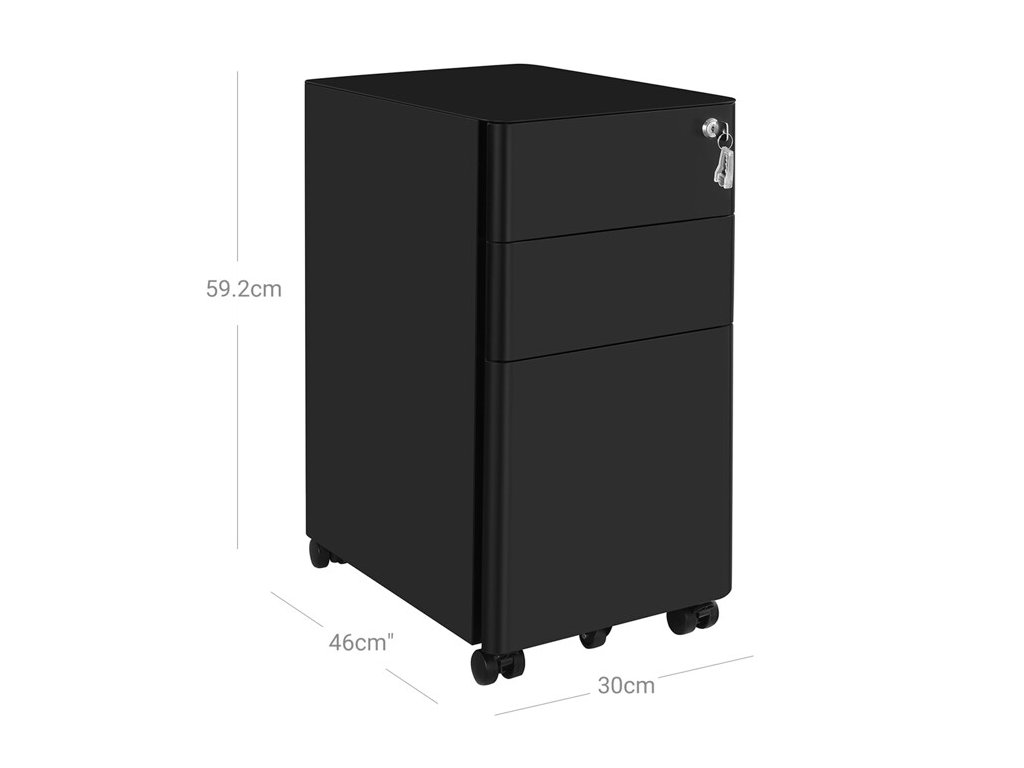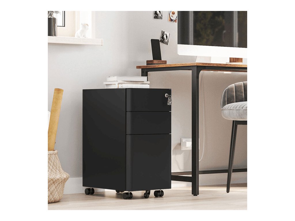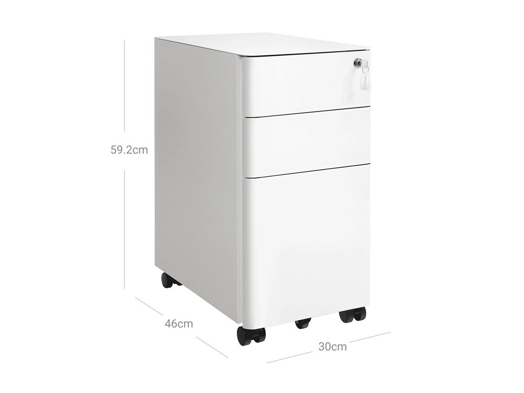 Kontejner je vybaven třemi zásuvkami, které poskytují dostatek úložného prostoru pro dokumenty, kancelářské potřeby i drobné osobní předměty. Zámek s klíčem umožňuje bezpečné uzamčení obsahu, což oceníte zejména při ukládání důležitých dokumentů.