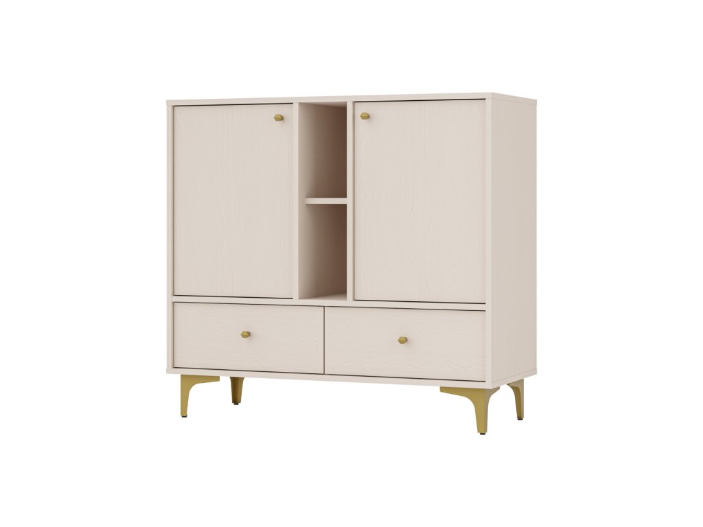 Komoda nabízí promyšleně členěný úložný prostor v podobě dvou dvířek, dvou zásuvek a otevřené niky, která je ideální pro vystavení dekorací, knih nebo osobních doplňků. Díky tomuto uspořádání se hodí do obývacího pokoje, ložnice, předsíně i pracovny.