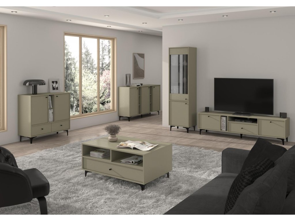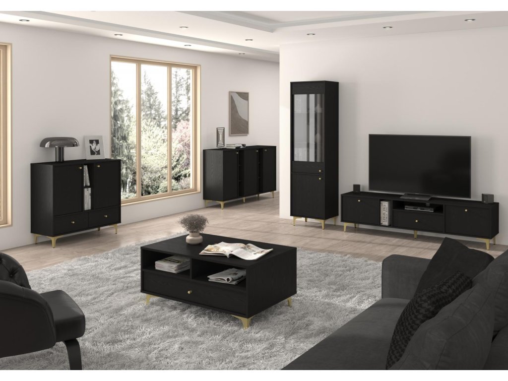 Série Tomila nabízí noční, TV i konferenční stolky, vitríny a komody v široké škále tvarů, barev a typů noh.
