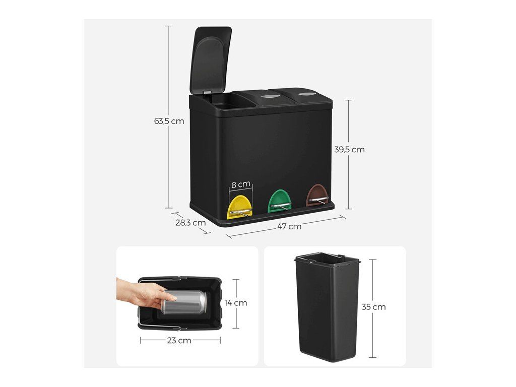 Vyjímatelné vnitřní nádoby usnadňují vysypávání i údržbu, což zvyšuje celkový komfort při používání. Ideální řešení pro efektivní a přehlednou recyklaci.