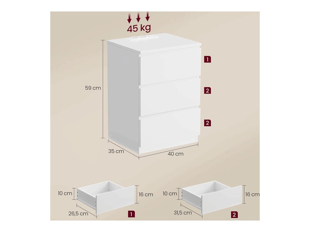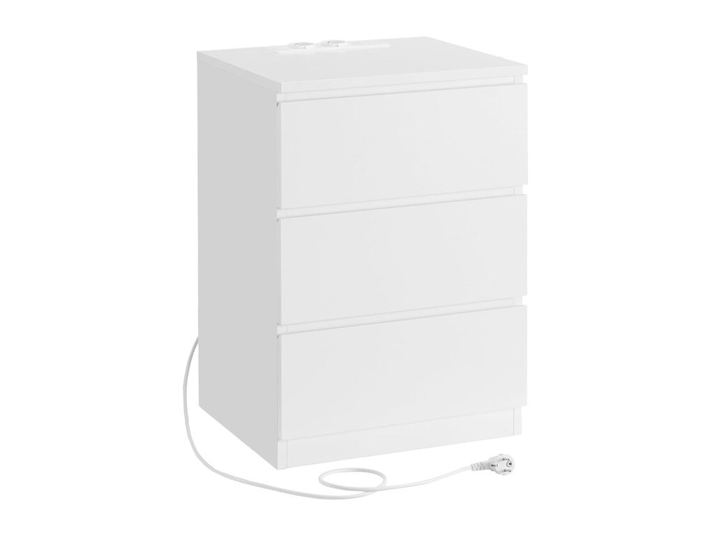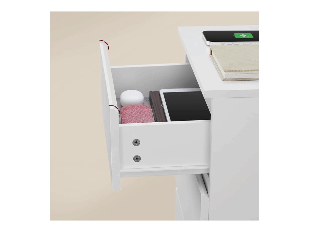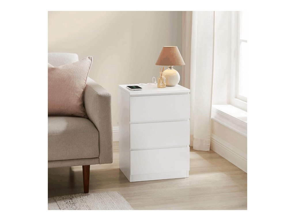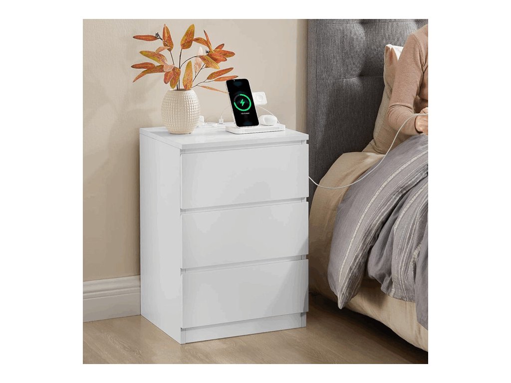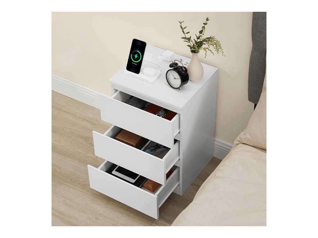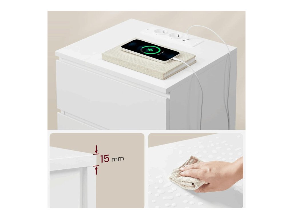 Stolek je vybaven třemi zásuvkami bez úchytek s tichým dojezdem, které nabízejí dostatek prostoru pro uložení osobních věcí. Velkou výhodou je integrovaná elektrická zásuvka a USB port na horní desce, umožňující pohodlné nabíjení telefonu či dalších zařízení přímo u postele. Díky kompaktním rozměrům a pevnému provedení je stolek stabilní a praktický pro každodenní používání.