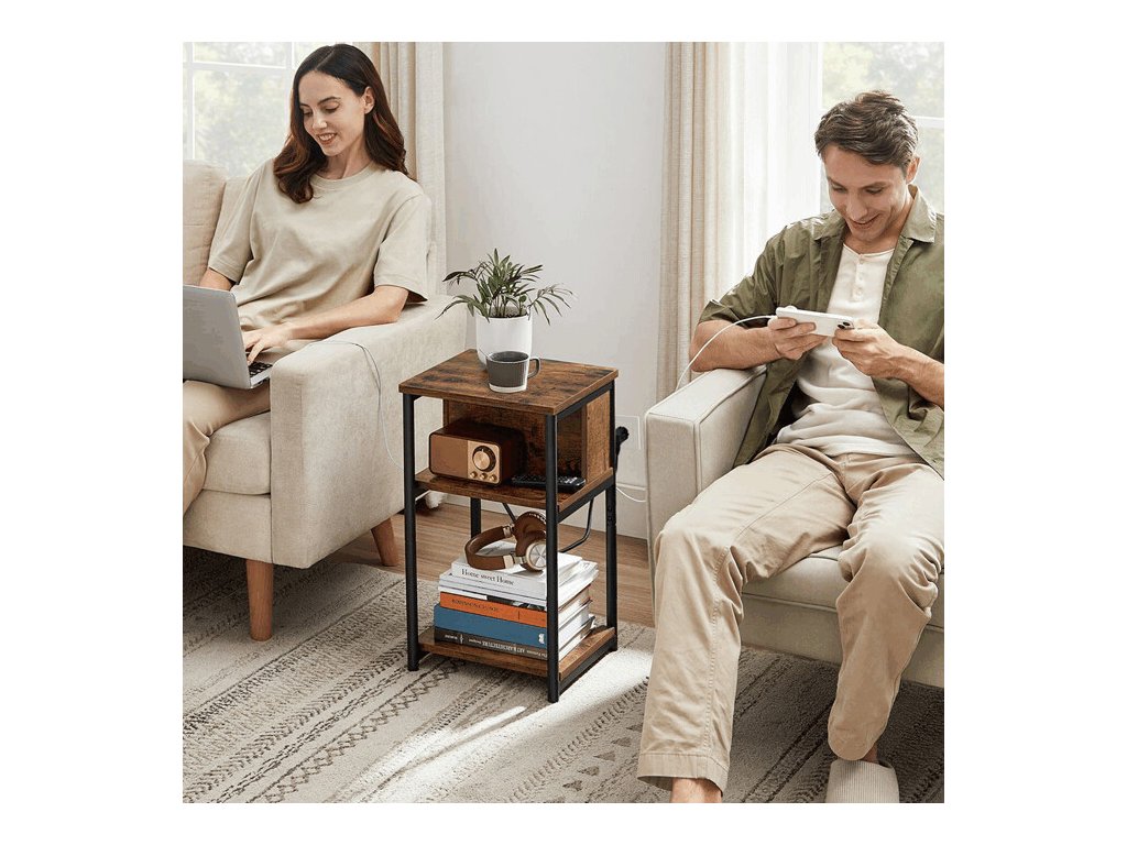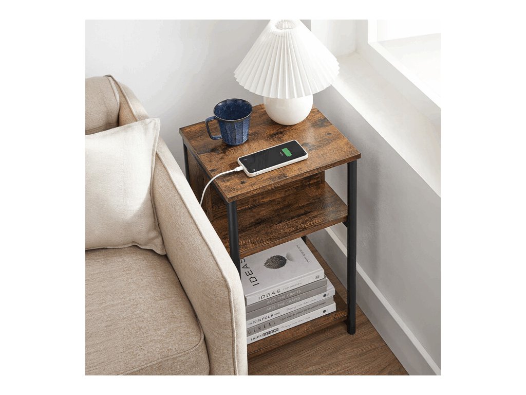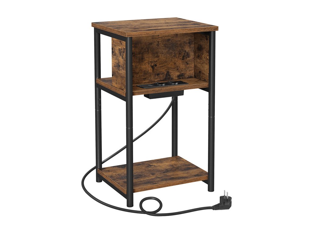 Odkládací stolek AFK-E1175 kombinuje praktické funkce s industriálním designem a je ideálním doplňkem k pohovce, křeslu nebo posteli. Díky integrované elektrické zásuvce a USB portu umožňuje pohodlné nabíjení telefonu, tabletu či jiných elektronických zařízení přímo u stolku.