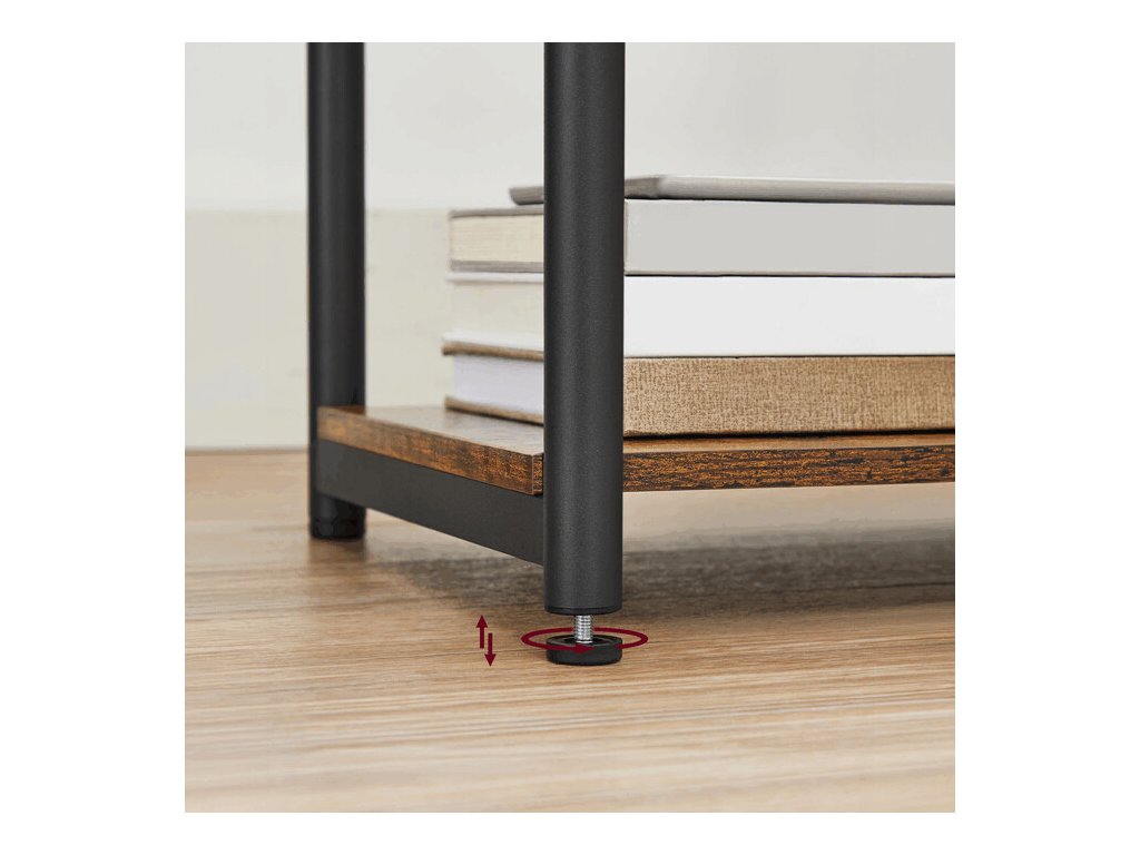 Praktické rektifikační nohy umožňují vyrovnání stolku i na nerovném povrchu. Díky kompaktním rozměrům 30 × 34 × 58 cm se stolek snadno vejde i do menších interiérů a skvěle doplní moderní i industriálně laděné prostory.