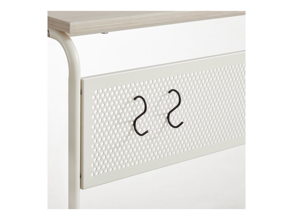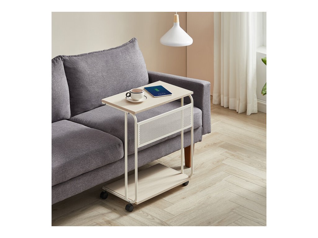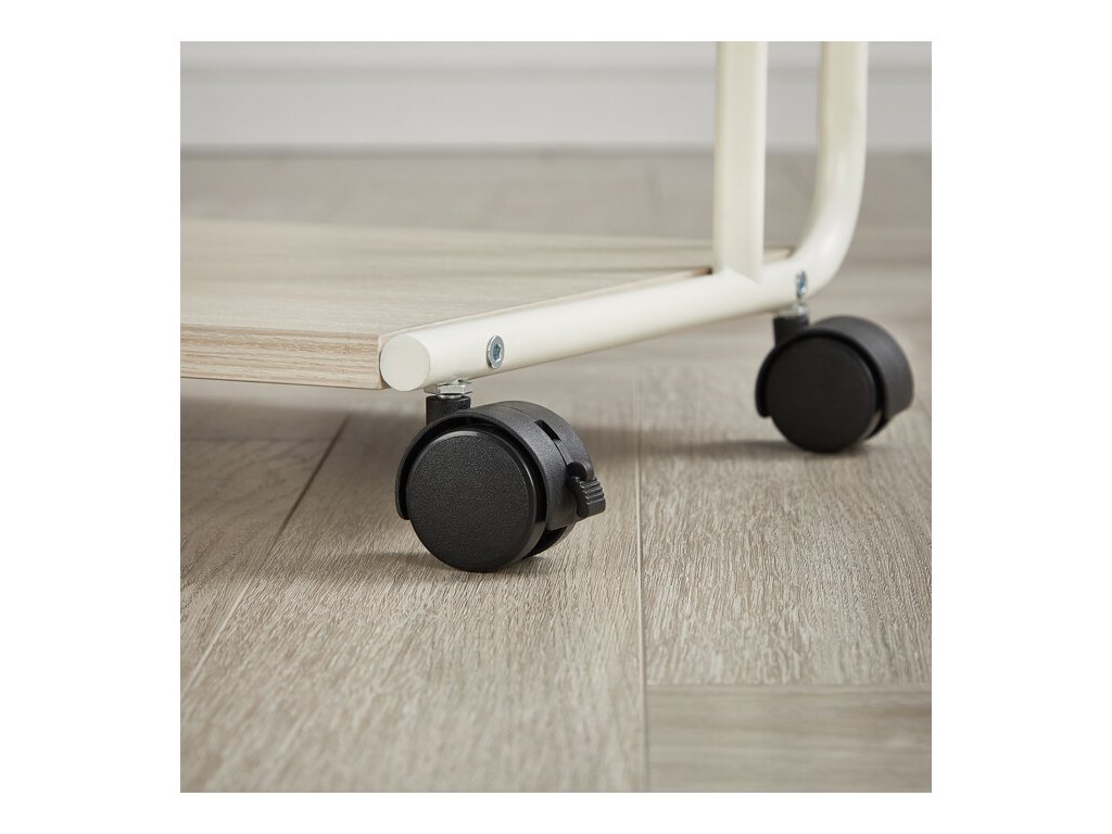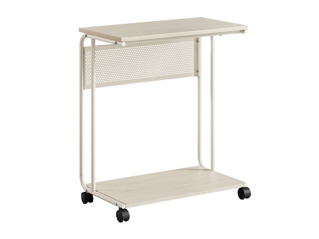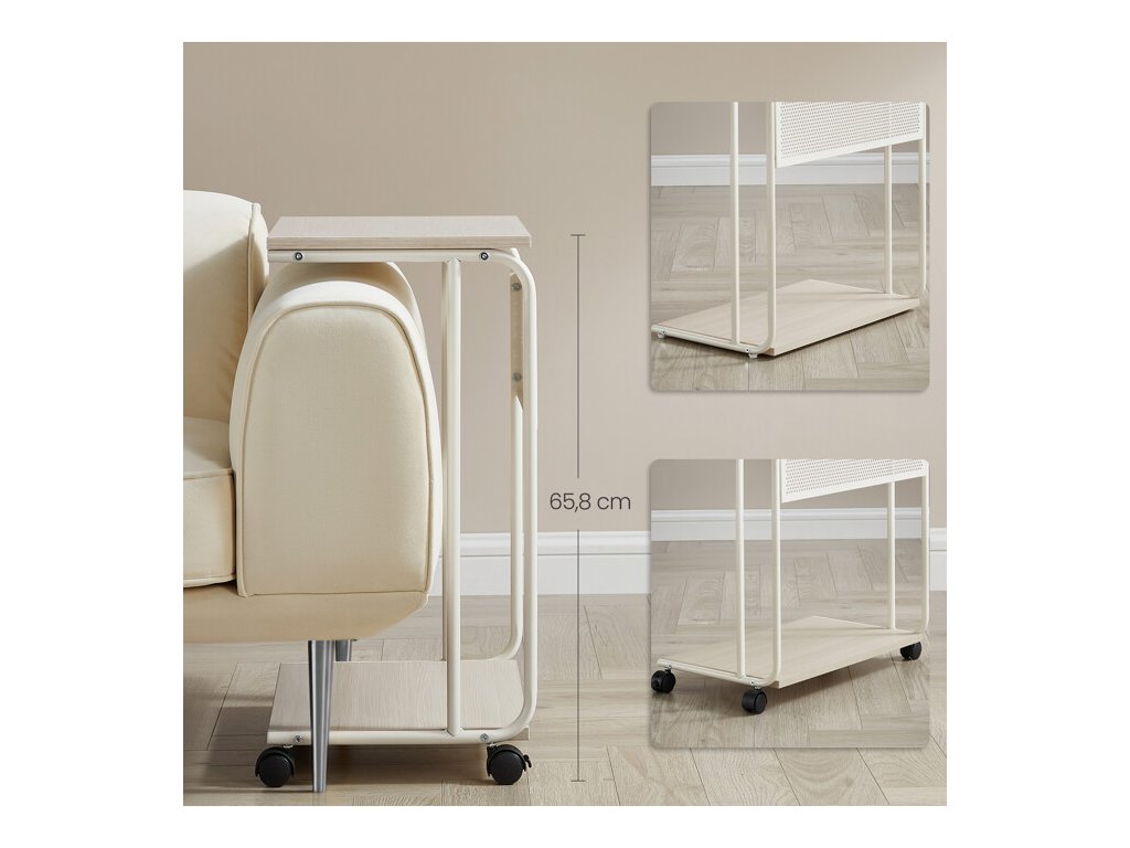Odkládací stolek AKF-E1012 CRM s rozměry 55 × 32 × 66 cm kombinuje desku a spodní polici z MDF s dekorem běleného dubu a pevnou kovovou konstrukcí v bílé barvě. Matný povrch desky usnadňuje údržbu a odolává běžnému opotřebení. Kovová konstrukce je doplněna o čtyři kolečka, která umožňují snadnou mobilitu stolku a jeho flexibilní umístění v prostoru. Praktický odkládací prostor na spodní polici nabízí další místo pro uložení drobných předmětů nebo dekorací. Kompaktní rozměry a stabilní provedení zajišťují univerzální využití v domácnostech i kancelářích.