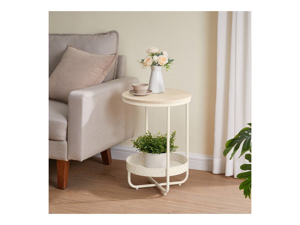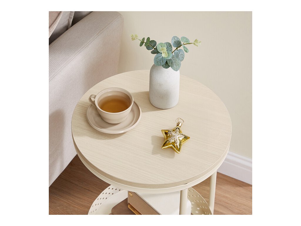 Odkládací stolek AKF-E1015 CRM s rozměry 40x40x55 cm kombinuje desku z MDF s dekorem běleného dubu a matnou povrchovou úpravou s pevnou kovovou konstrukcí v béžovém odstínu. Kulatá deska nabízí stabilní plochu pro odložení drobných předmětů, zatímco spodní odkládací prostor s perforovaným kovovým okrajem poskytuje praktické místo pro další uskladnění. Kovové nohy jsou vybaveny rektifikačními patkami, které umožňují vyrovnání stolku na nerovném povrchu a zajišťují stabilitu. Celkový design je jednoduchý a funkční, vhodný do moderních i klasických interiérů.