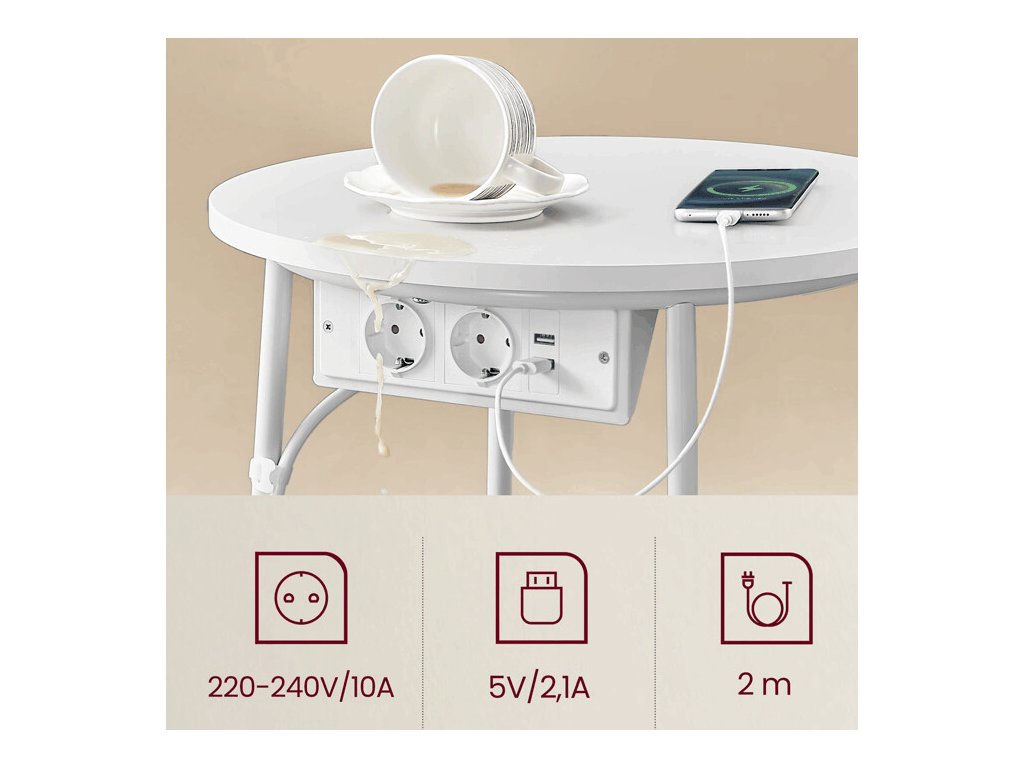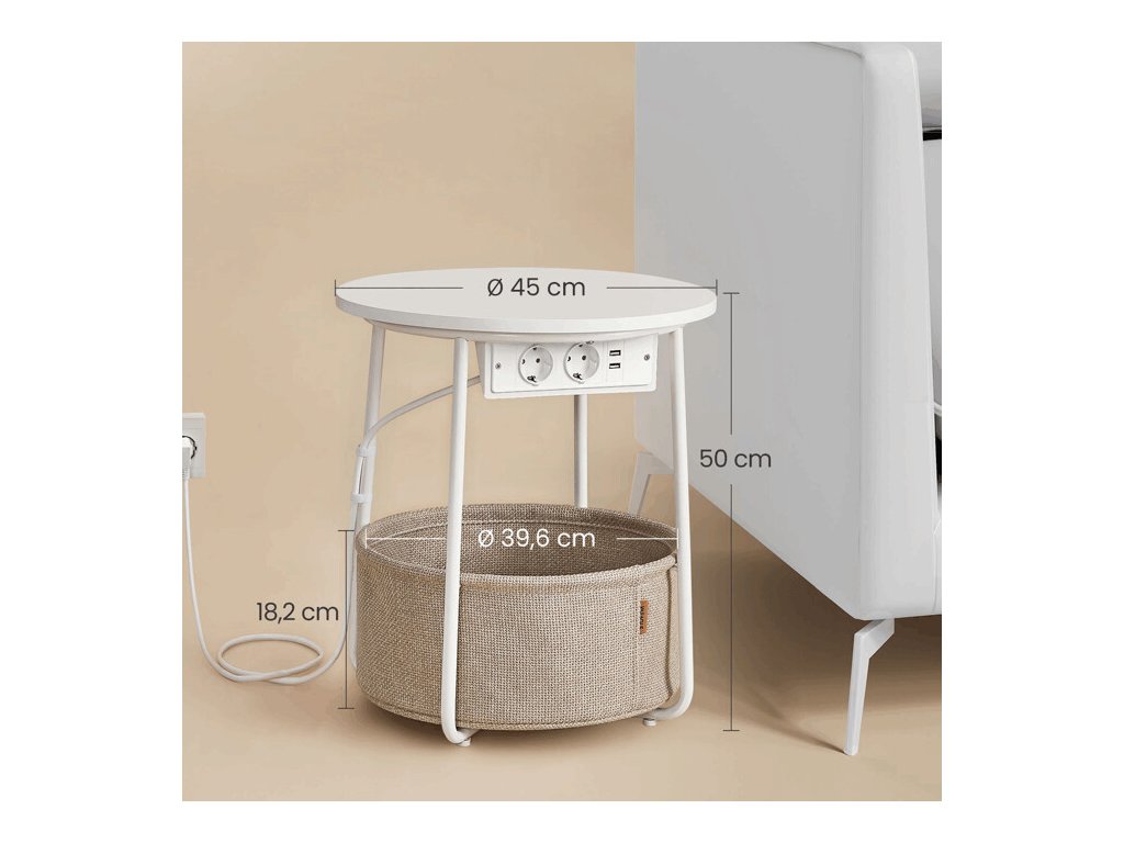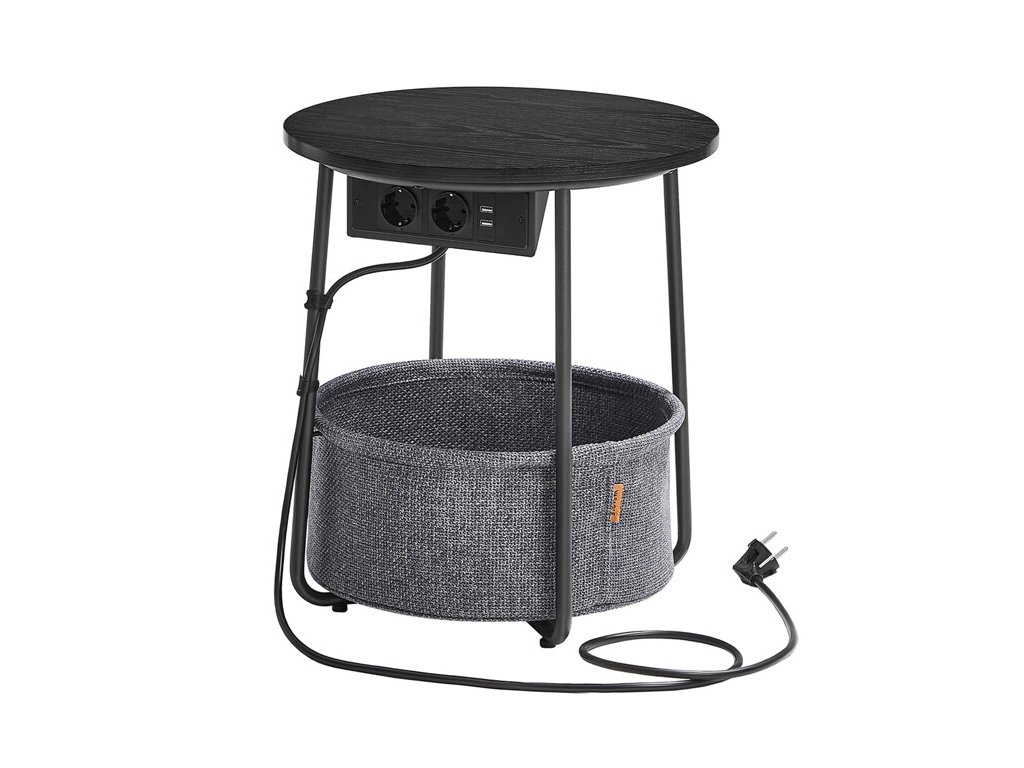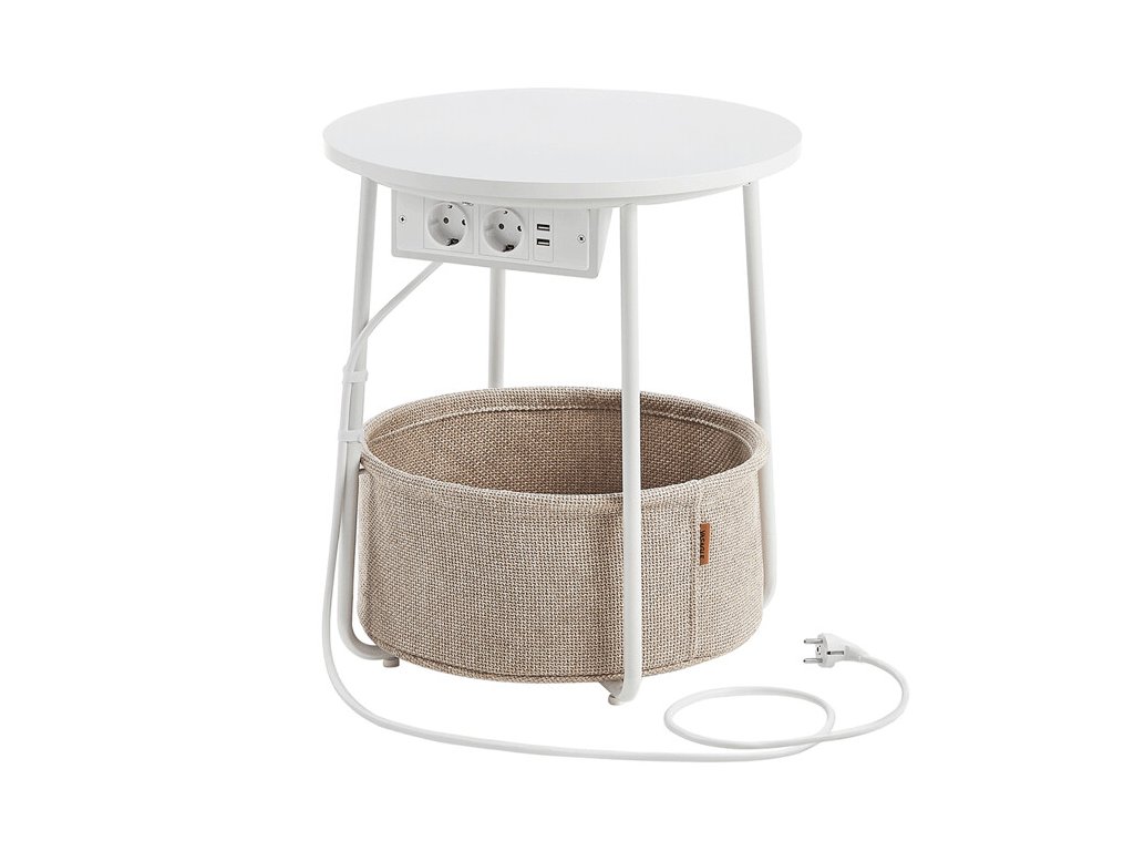 Pod deskou se nachází textilní úložný koš pro drobnosti či ovladače. Velkou výhodou je integrovaná elektrická zásuvka se dvěma výstupy a dvěma USB porty, která umožňuje pohodlné nabíjení elektroniky přímo u stolku. Díky výšce 50 cm je ideální jako přístavný stolek k pohovce nebo křeslu.