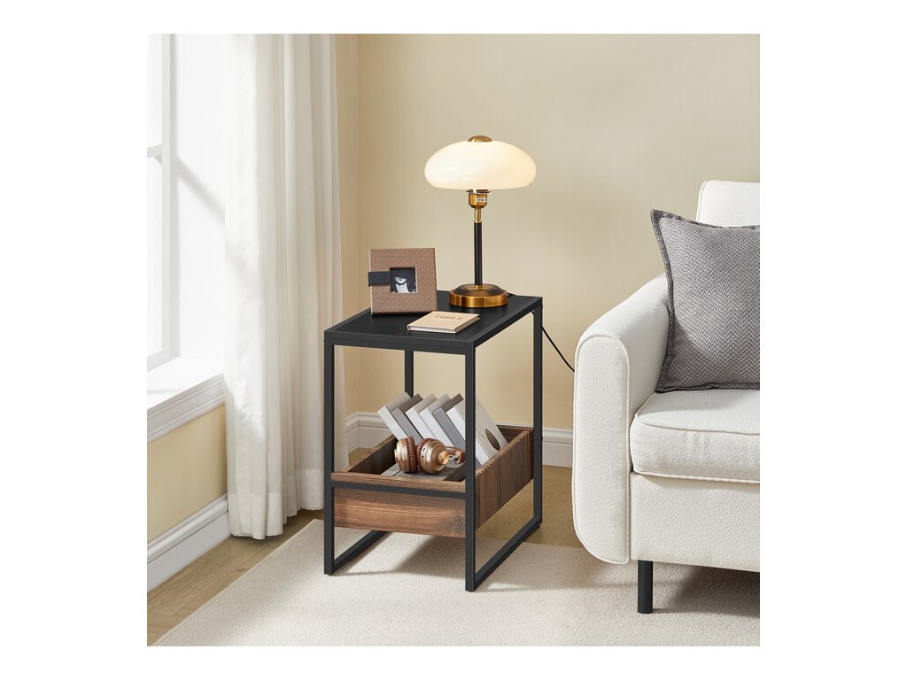 Odstavný stolek AKF-E1082 BK kombinuje pevnou kovovou konstrukci v černé matné úpravě s praktickou odkládací plochou z MDF desky ve stejném odstínu. Součástí je úložný prostor s přírodní dřevěnou zásuvkou v dekoru ořech, která nabízí dostatek místa pro uložení drobných předmětů. Rektifikační nožky umožňují vyrovnání stolku na nerovném povrchu, čímž zajišťují stabilitu a bezpečné používání. Minimalistický design s kontrastem černé a přírodního dřeva se hodí do moderních i industriálně laděných interiérů.