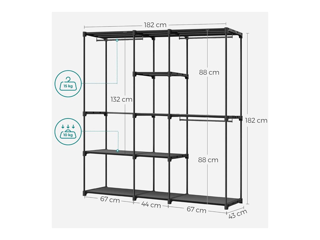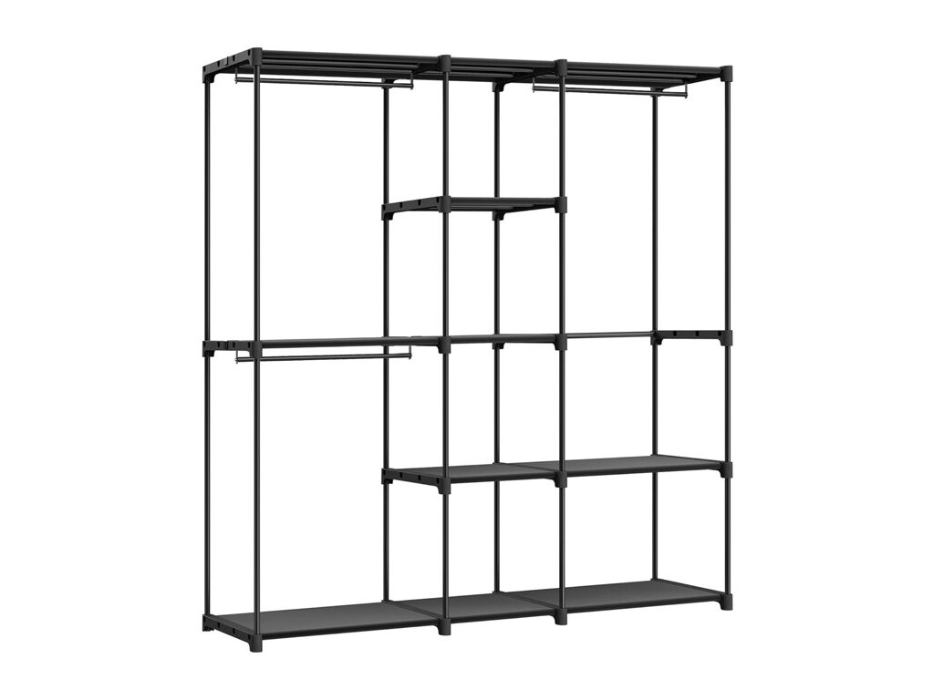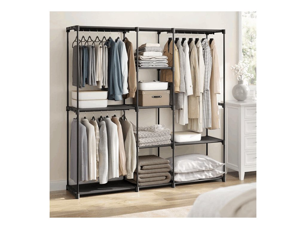 Konstrukce disponuje několika policemi a závěsnými tyčemi, což umožňuje efektivní organizaci oblečení – od košil a kabátů až po sukně či doplňky. Otevřený design zajišťuje rychlý přístup k uloženým věcem a přehlednost při každodenním používání. Skříň je vhodná do domácností, šaten i kancelářských prostor.