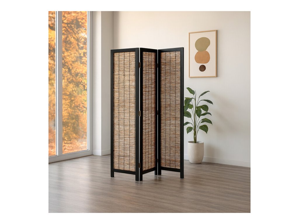 Třídílný paraván EF-L174 BK z masivního smrkového dřeva v černém provedení nabízí praktické řešení pro rozdělení prostoru či vytvoření soukromí v interiéru. Pevný rám je doplněn o výplň z bambusu, který dodává paravánu přírodní a zároveň moderní vzhled. Díky třem otočným dílům je možné paraván snadno přizpůsobit různým prostorovým podmínkám a uspořádáním.