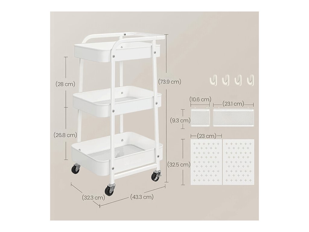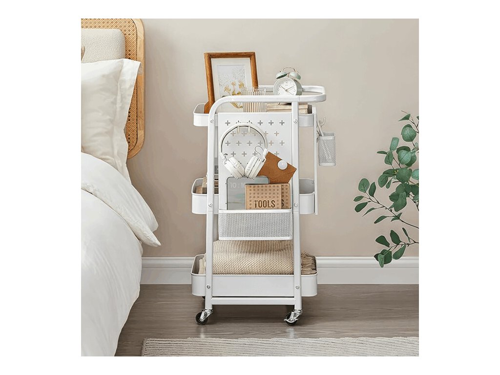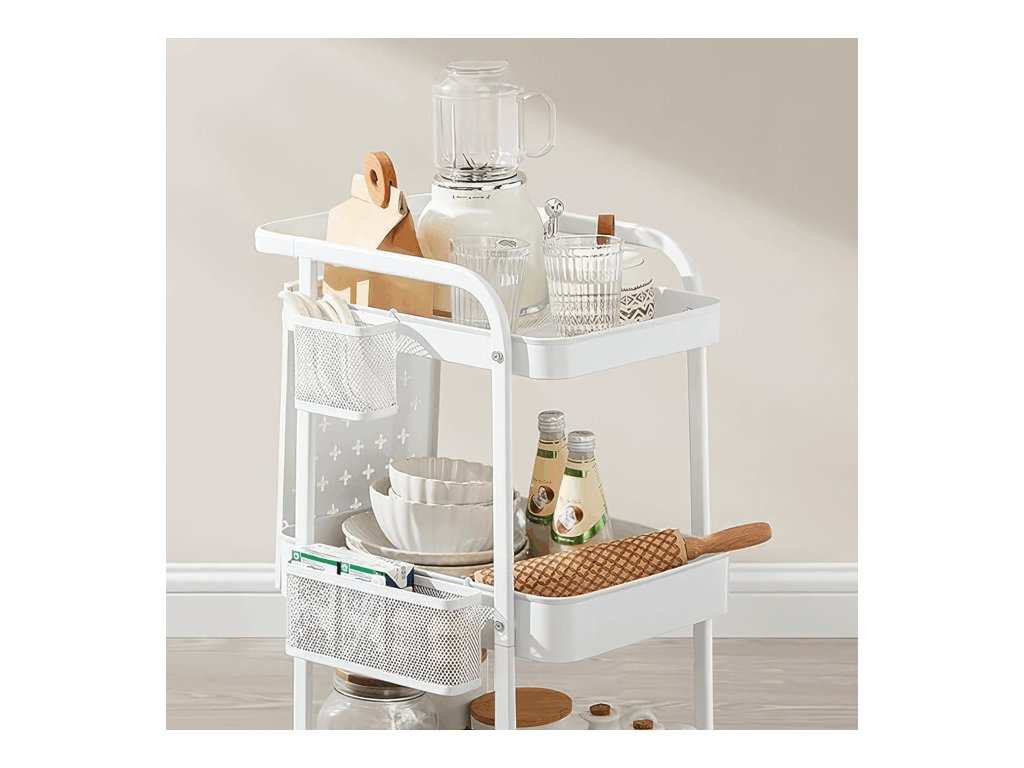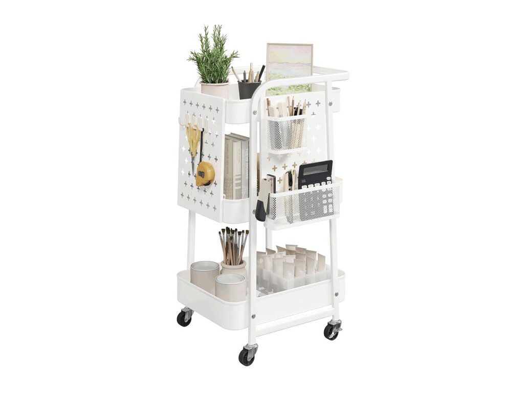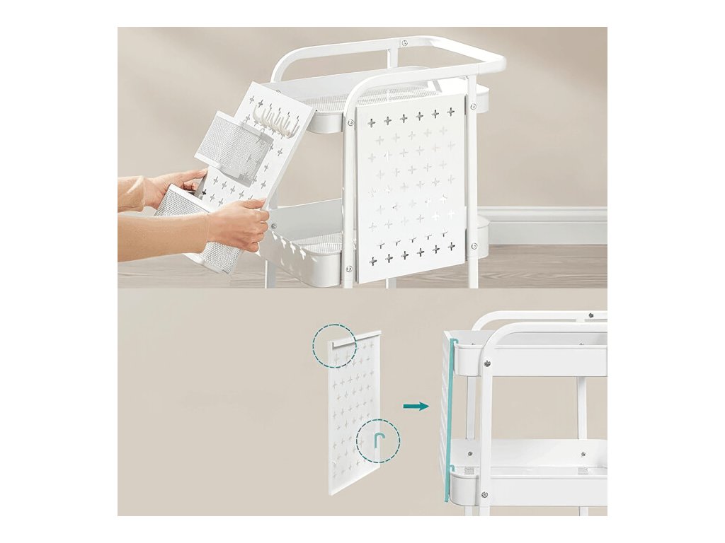 Konstrukce vozíku nabízí tři prostorné police, doplněné perforovanými bočními panely. Ty umožňují připevnění doplňkových košíků či háčků a usnadňují efektivní organizaci drobných předmětů. Vozík je vybaven čtyřmi otočnými kolečky, z nichž dvě disponují brzdovým mechanismem, který zajišťuje stabilní fixaci na místě.