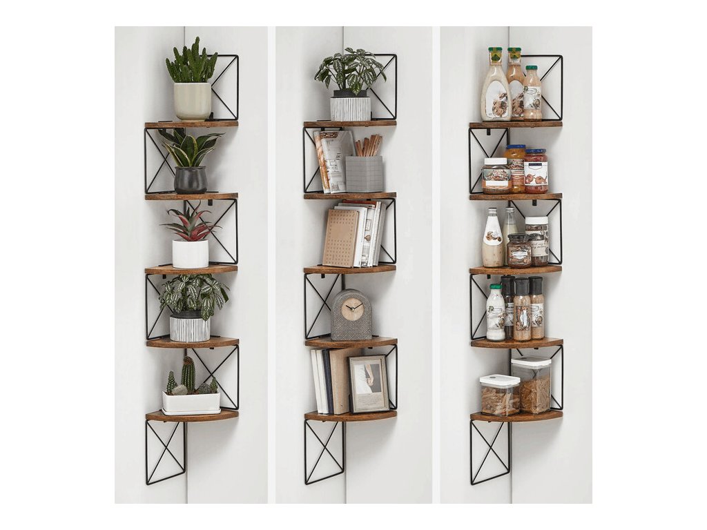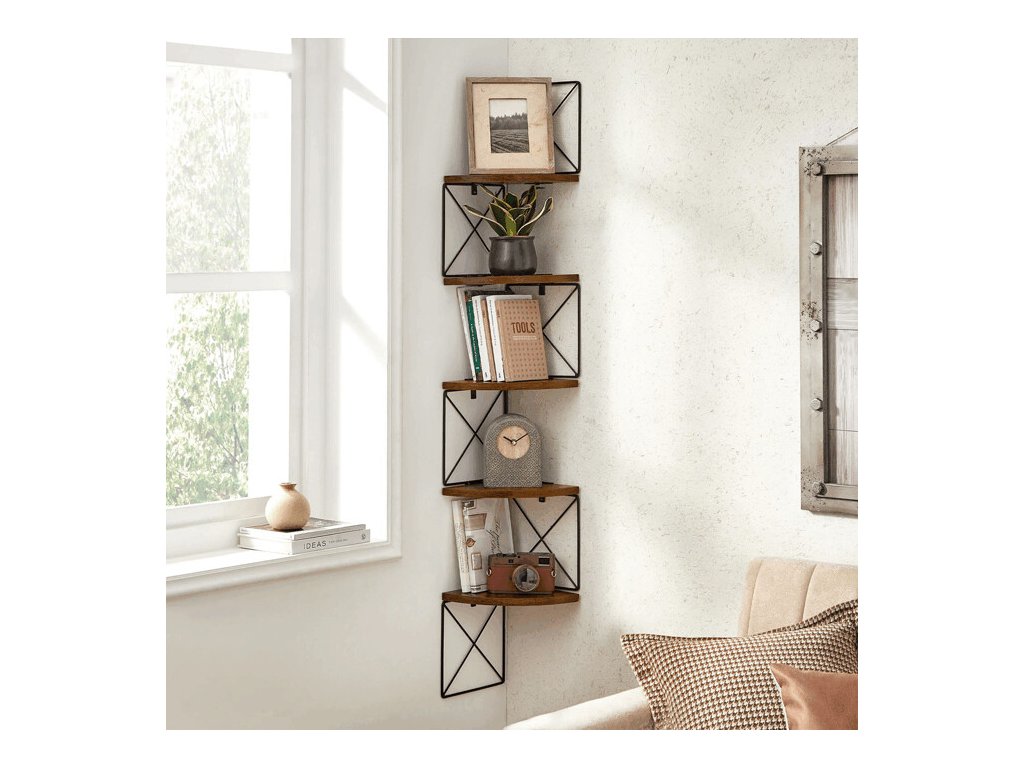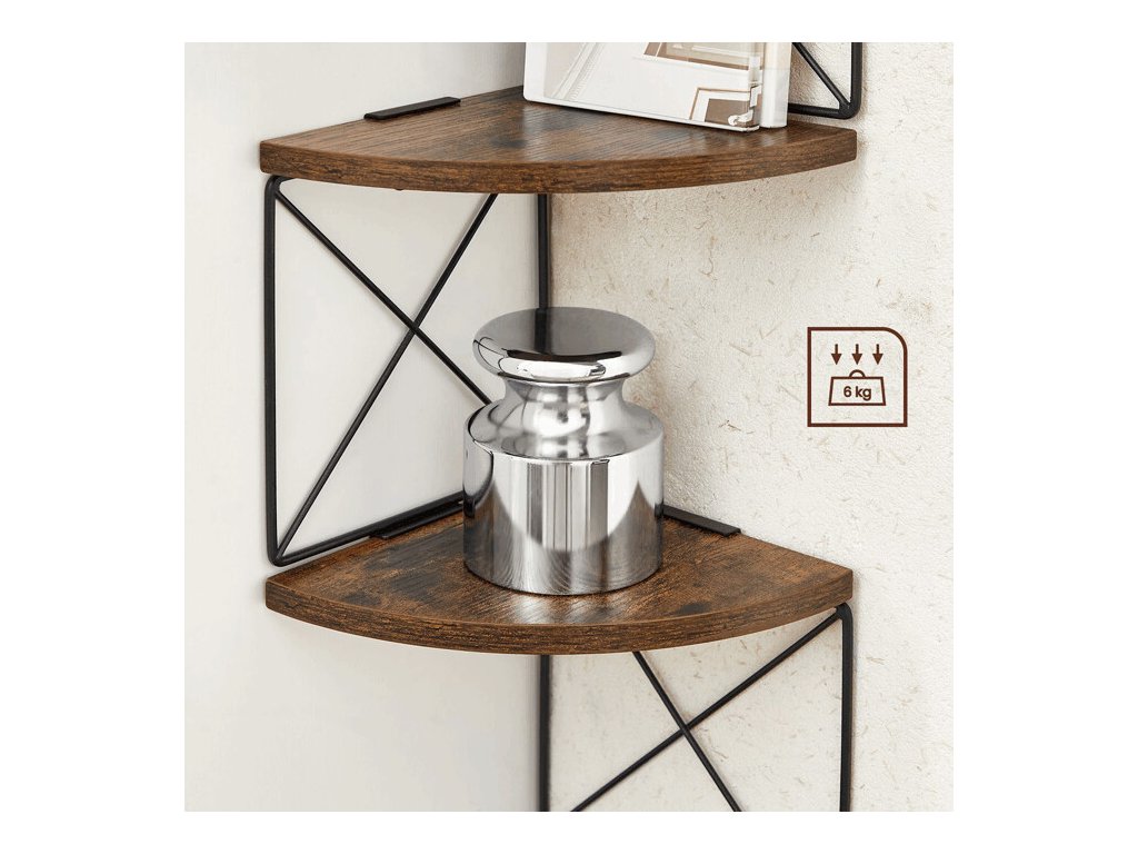 Nástěnná rohová police v dekoru old wood spojuje teplé hnědé odstíny MDF desek s černým kovovým rámem, který zajišťuje stabilní upevnění a dodává polici výrazný industriální charakter. Díky tomuto provedení se stane nejen praktickým, ale i designovým prvkem interiéru.