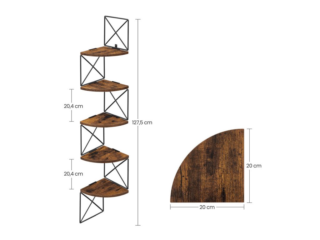 Police je tvořena pěti segmenty ve tvaru čtvrtkruhu, které jsou propojeny kovovými prvky s křížovým vzorem. Ty přispívají k celkové pevnosti konstrukce a zároveň vytvářejí lehký, vzdušný vzhled. Rozměry 127,5 × 20 cm umožňují efektivně využít rohové prostory pro vystavení dekorací, knih, rostlin či drobných doplňků.