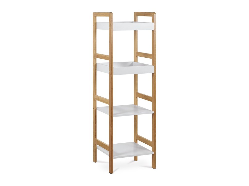Multifunkční čtyřpolicový regál DR-013-4 ve skandinávském stylu je elegantní a praktický doplněk do každého interiéru. Nosná konstrukce z masivního bambusu je ošetřena kvalitním transparentním lakem, který zaručuje odolnost vůči vodě a přirozený vzhled. Police jsou vyrobeny z MDF desek, které jsou lakovány bílým matným polyuretanovým lakem, čímž je zajištěna jejich voděodolnost.