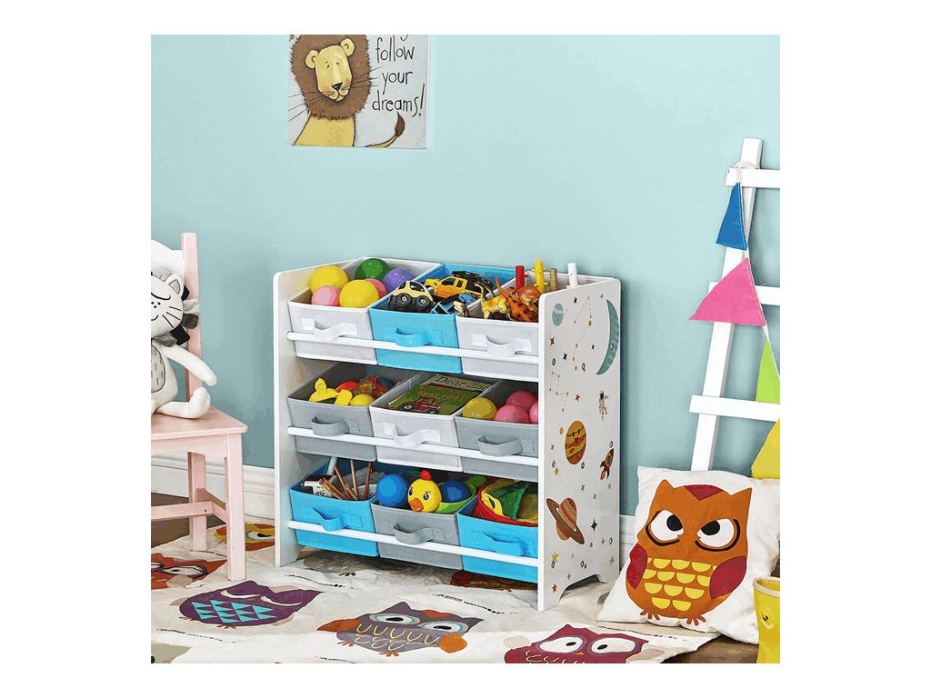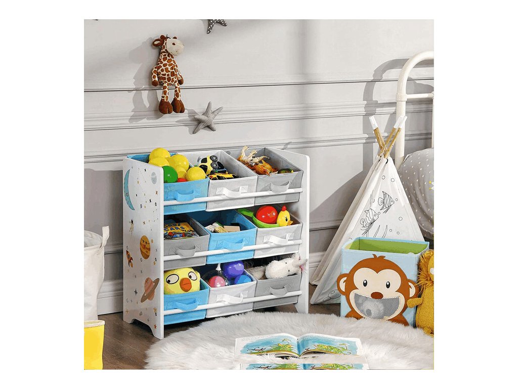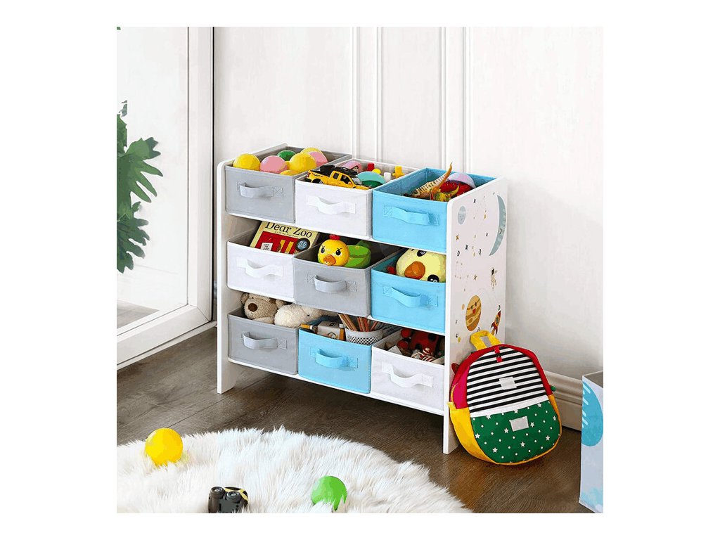 Regál na hračky AUR-E1033 WT nabízí praktické a přehledné řešení pro ukládání dětských hraček, knížek i dalších drobností. Je vybaven devíti látkovými boxy, které pomáhají udržet pořádek a děti zároveň motivují k samostatnému uklízení.
