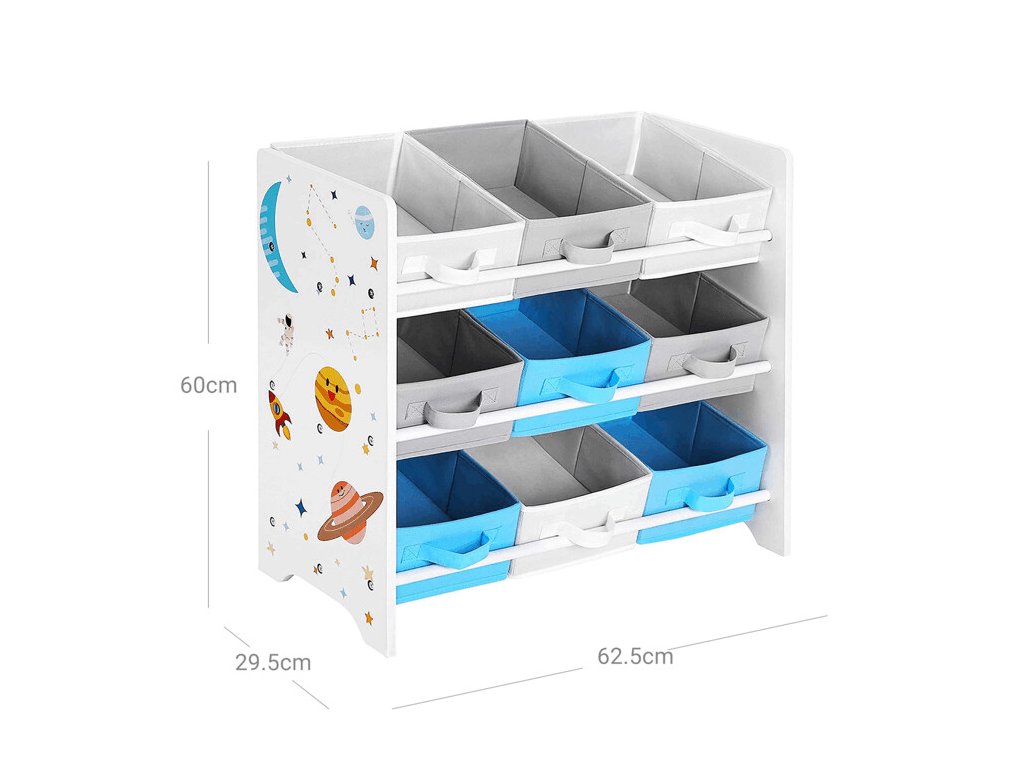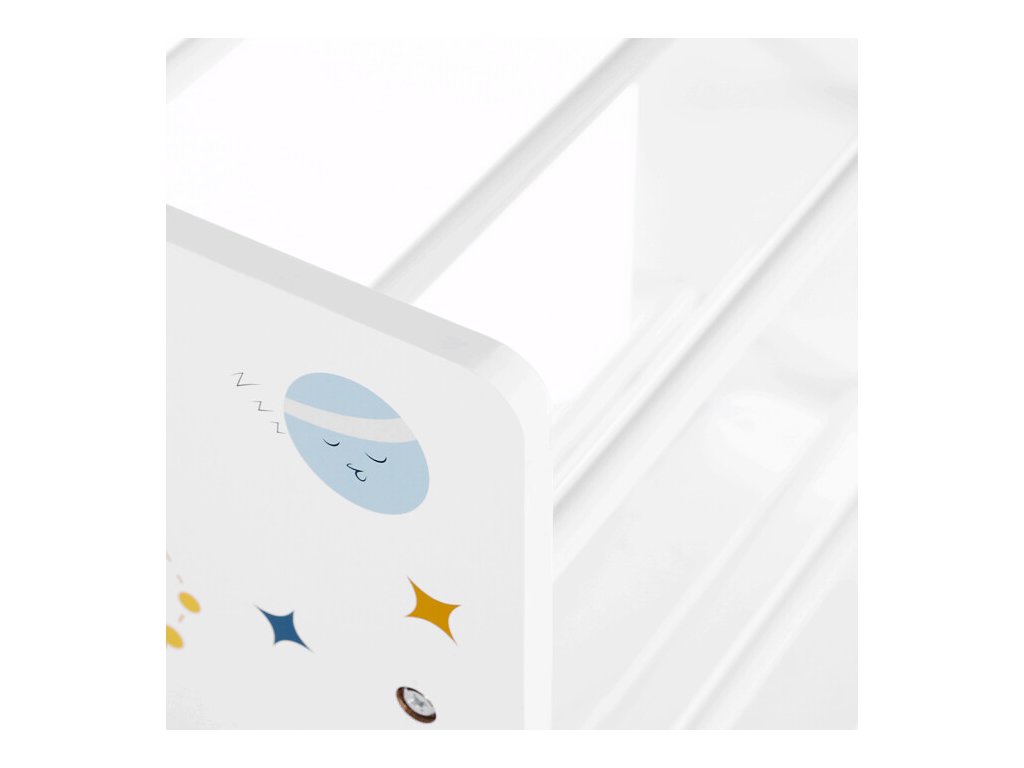 Bílé bočnice jsou ozdobeny barevným motivem vesmíru, který zaujme menší i větší děti a podpoří jejich fantazii. Látkové boxy v odstínech šedé a modré jsou snadno vyjímatelné a opatřené praktickými úchyty pro pohodlnou manipulaci.