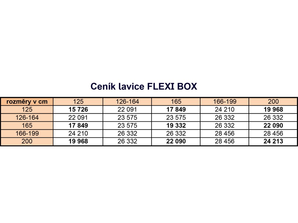 Lavici Flexi Box, jako první svého druhu, lze vyrobit jako atypický rozměr s přesností na 1 cm (v rozmezí 125–200 cm). Neváhejte nás kontaktovat s poptávkou na cenu za jakýkoliv rozměr na info@nabytekkovanda.cz nebo na telefonu 776 671 500. Ceny za atypické rozměry najdete i v galerii (např. za rozměr 142 × 185 cm je cena 26 332 Kč).