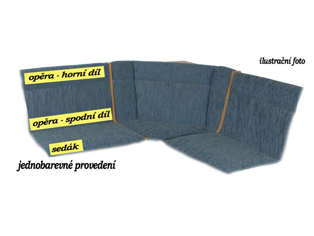 U prošití opěráku, v případě volby rozdílné látky na sedák a opěrák, může být opěrák celý jednobarevný nebo vrchní díl očalouněný stejnou látkou jako sedák (uveďte prosím do poznámky v objednávce).