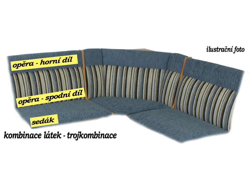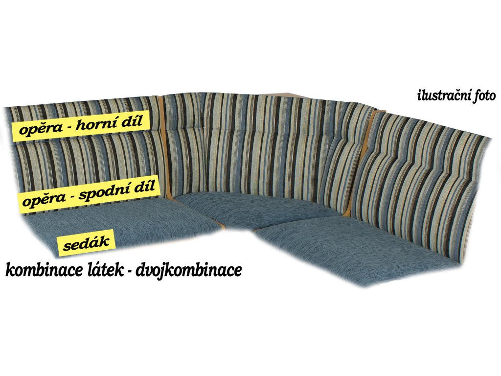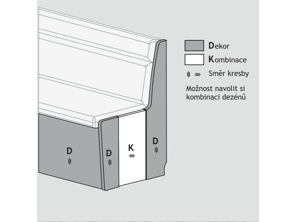 Rohový díl je pevný, čalouněný do lomeného tvaru. Za ním se nachází praktická dřevěná polička. Lavice je určena k umístění ke stěně, zadní strana není pohledová. U prošití opěráku, v případě volby rozdílné látky na sedák a opěrák, může být opěrák celý jednobarevný nebo vrchní díl očalouněný stejnou látkou jako sedák (uveďte prosím do poznámky v objednávce).