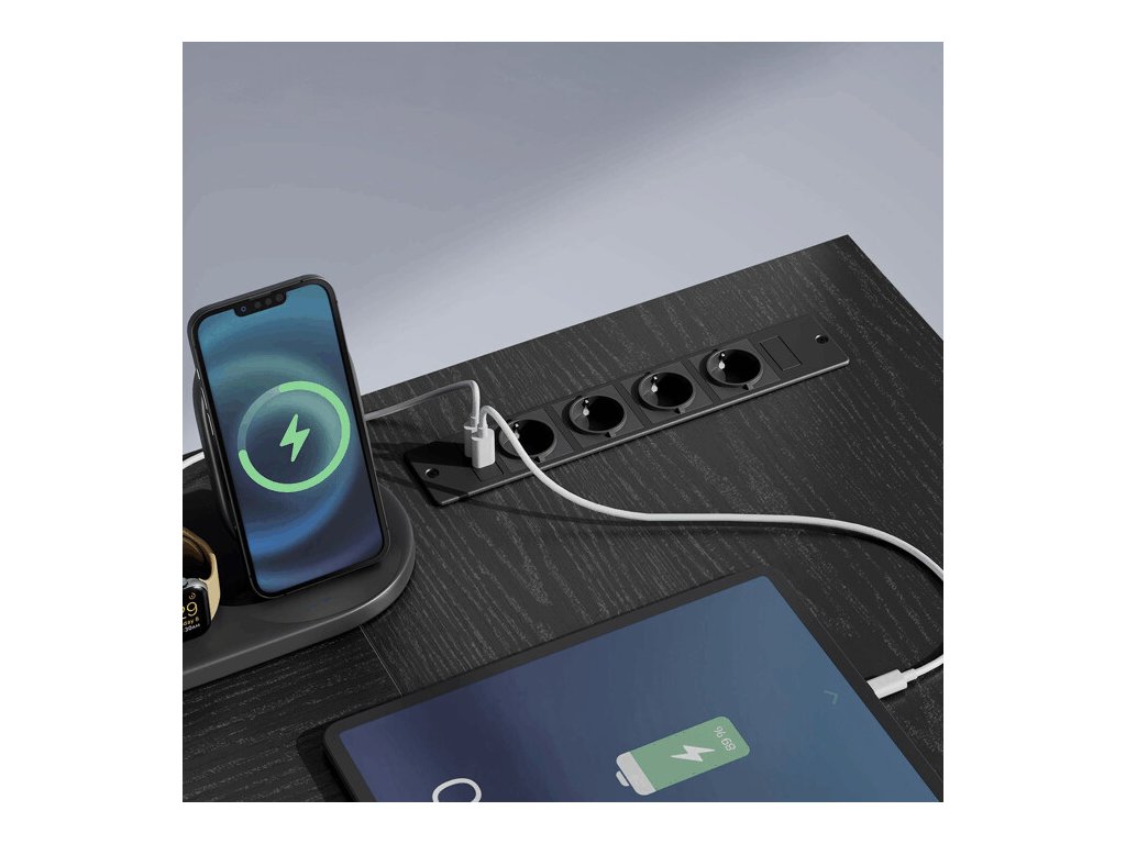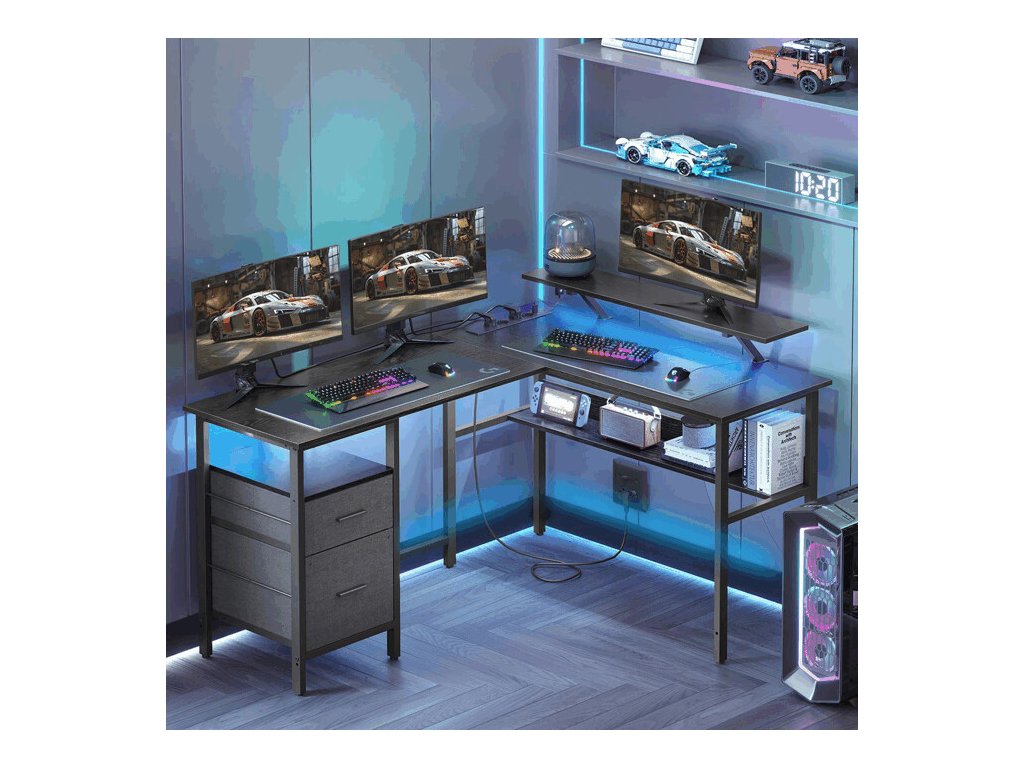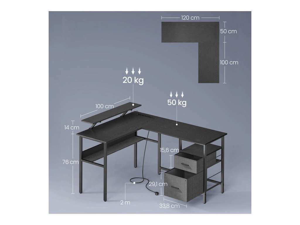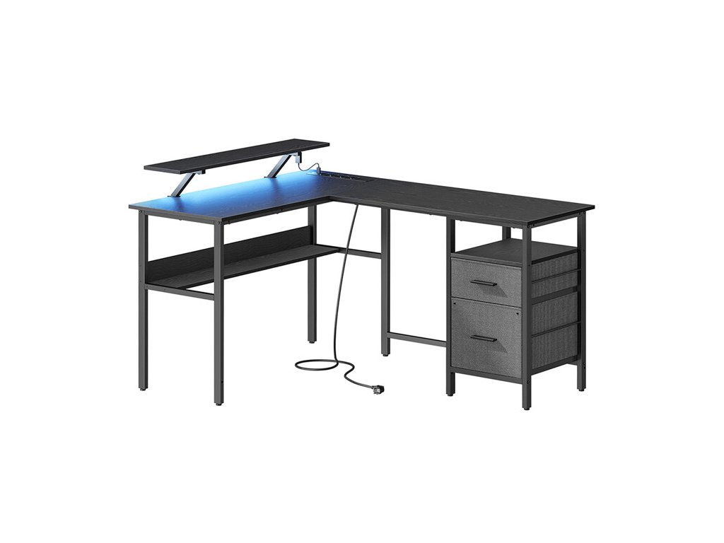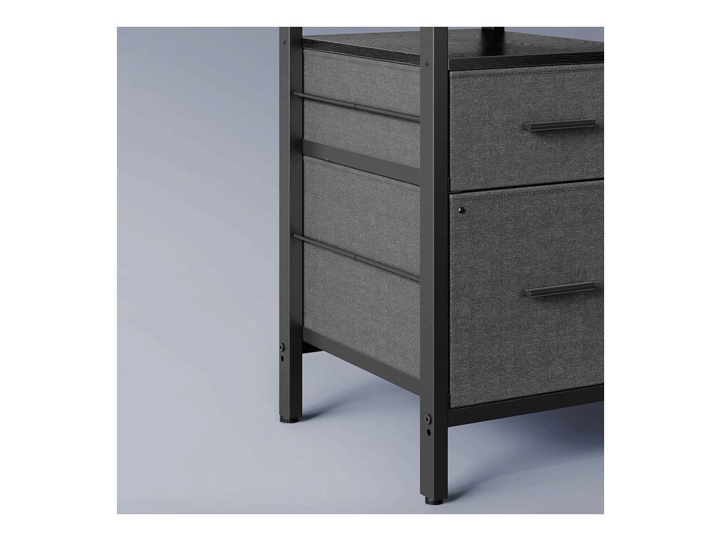 Stůl je vybaven dvěma látkovými zásuvkami pro uložení dokumentů a kancelářských potřeb a otevřenou policí pod deskou pro lepší organizaci. Velkou výhodou jsou integrované elektrické zásuvky a USB porty, které umožňují pohodlné připojení a nabíjení elektroniky přímo na pracovním místě.