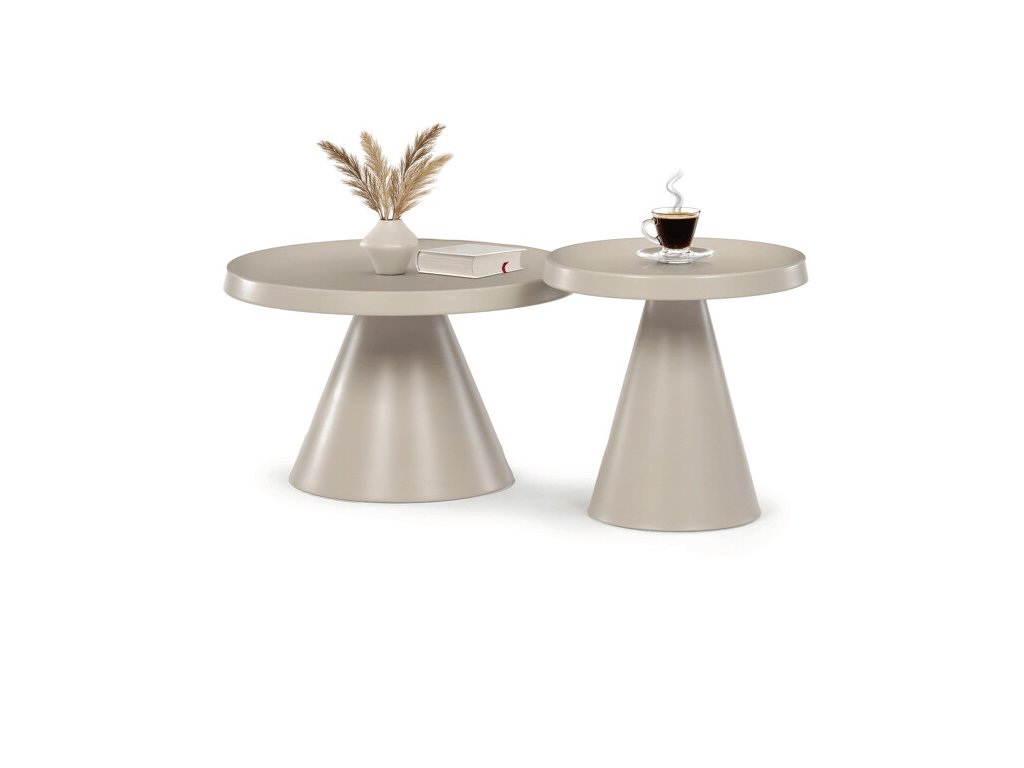 Sada dvou konferenčních stolů CT-F4112 CSM v elegantním béžovém matném provedení spojuje moderní styl, praktičnost a odolnost. Obě desky i podnože jsou vyrobeny z pevného kovu, který zaručuje dlouhou životnost a stabilitu. Matná povrchová úprava nejen působí elegantně, ale také usnadňuje údržbu. Větší stolek má průměr 68,5 cm a výšku 43,5 cm, menší 49 cm a výšku 49,5 cm, což umožňuje jejich flexibilní rozmístění podle potřeby. Dekorativní hrany dodávají stolům jemný designový akcent a podtrhují jejich minimalistický a čistý vzhled, ideální pro moderní interiéry.