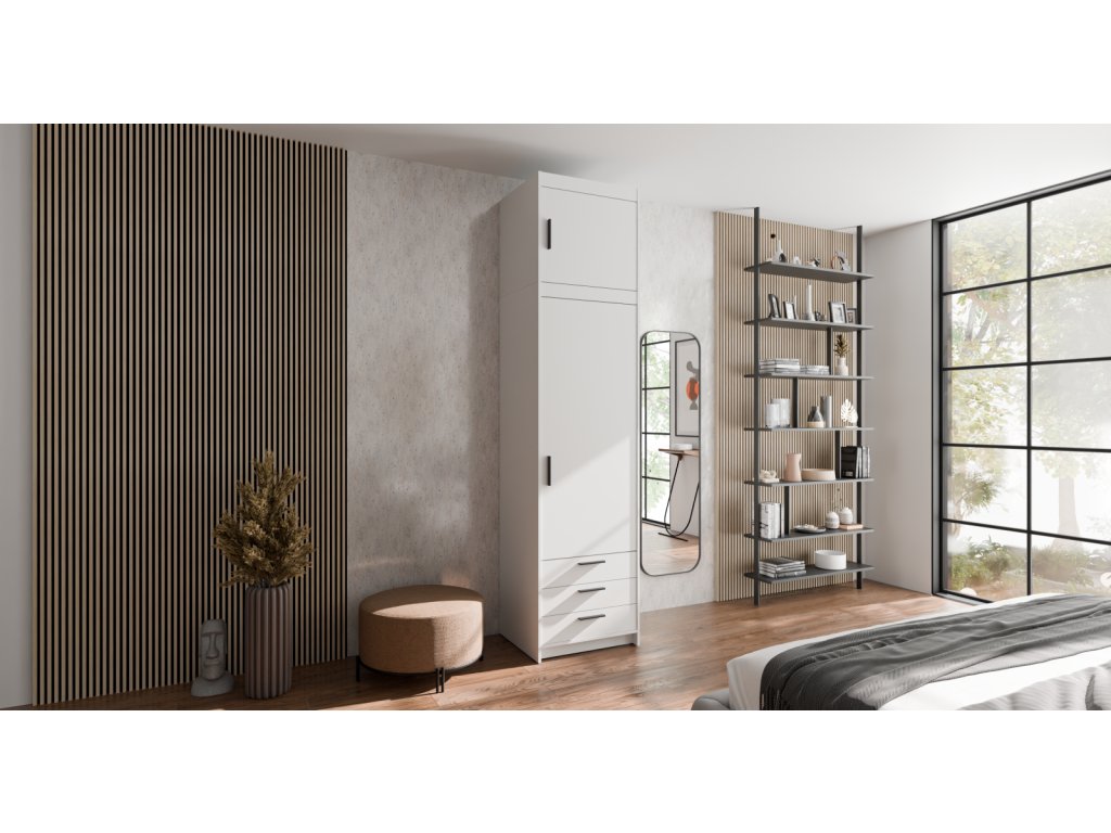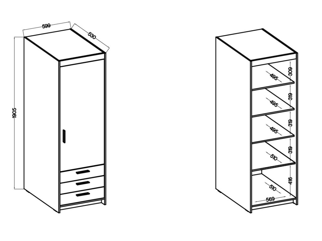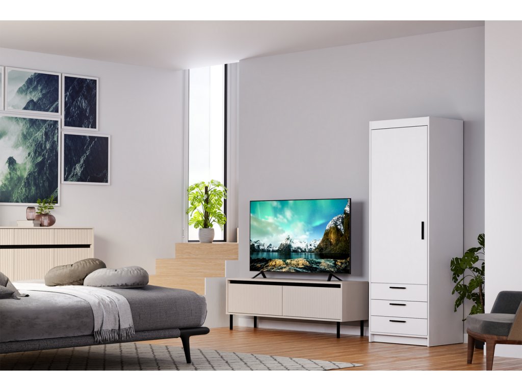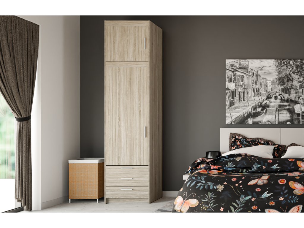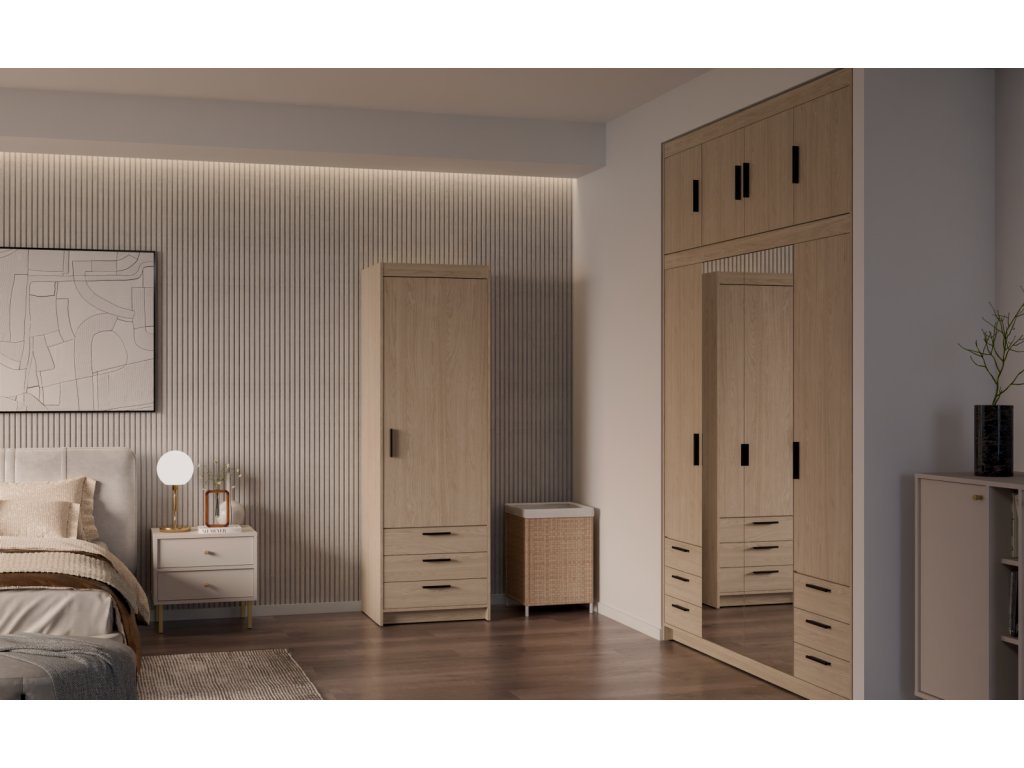 Šatní skříň Enja 1D3S je praktickým řešením úložného prostoru i do menších místností. Díky promyšlenému vnitřnímu uspořádání nabízí jedny dveře, tři police a tři zásuvky, které umožňují přehledné uložení oblečení, prádla i dalších domácích potřeb.