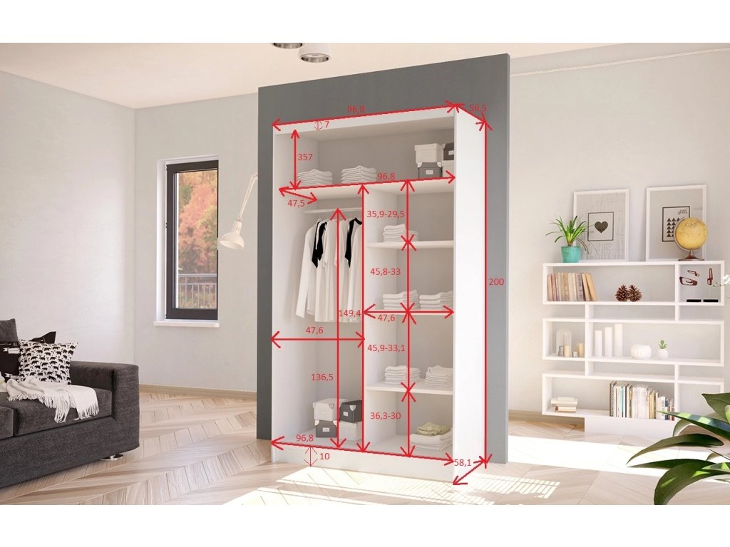 Skříň je rozdělena na dvě funkční části – jednu se šatní tyčí pro zavěšení oblečení a druhou se čtyřmi policemi, které umožňují přehledné uspořádání prádla, doplňků nebo úložných boxů. Posuvné dveře šetří místo a zajišťují pohodlný přístup k obsahu skříně.